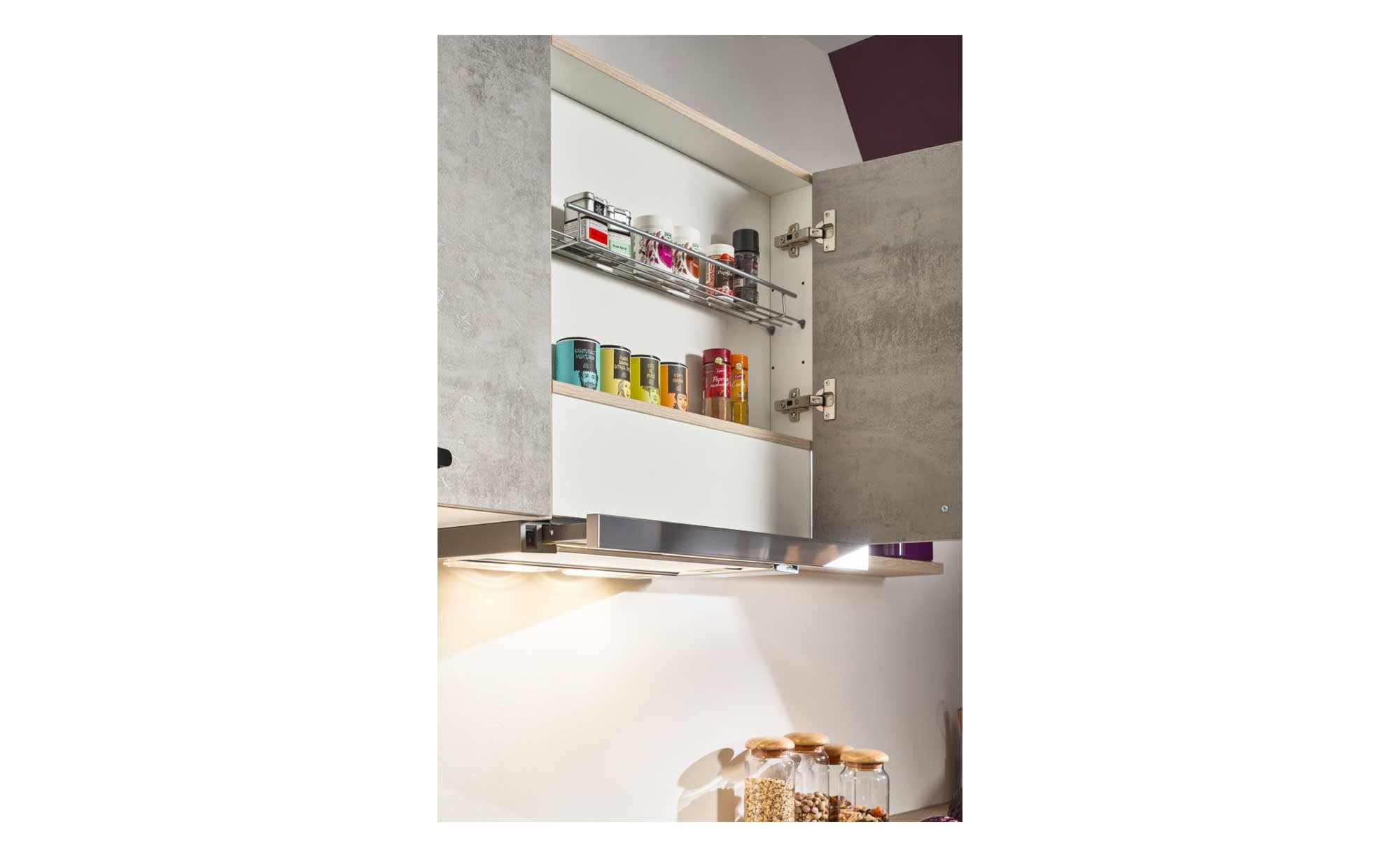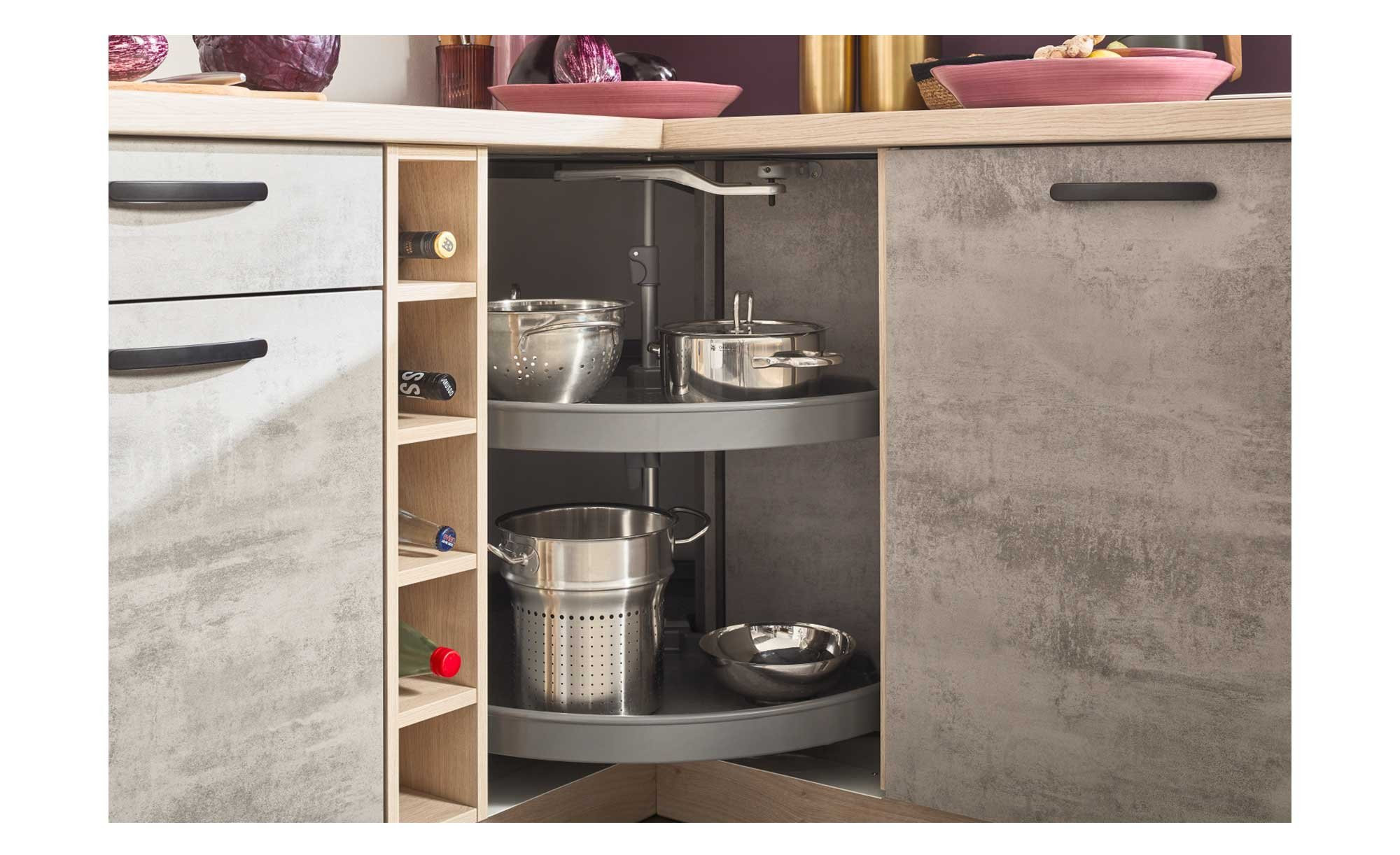 Für jede Menge Stauraum sorgen unter anderem ein Unterschrank mit Schublade sowie ein Schrank mit Drehkarussell. Sie lassen sich mittels der schwarzen Metallgriffe ganz einfach öffnen und schließen. Außerdem wurde ein offenes Flaschenregal integriert.