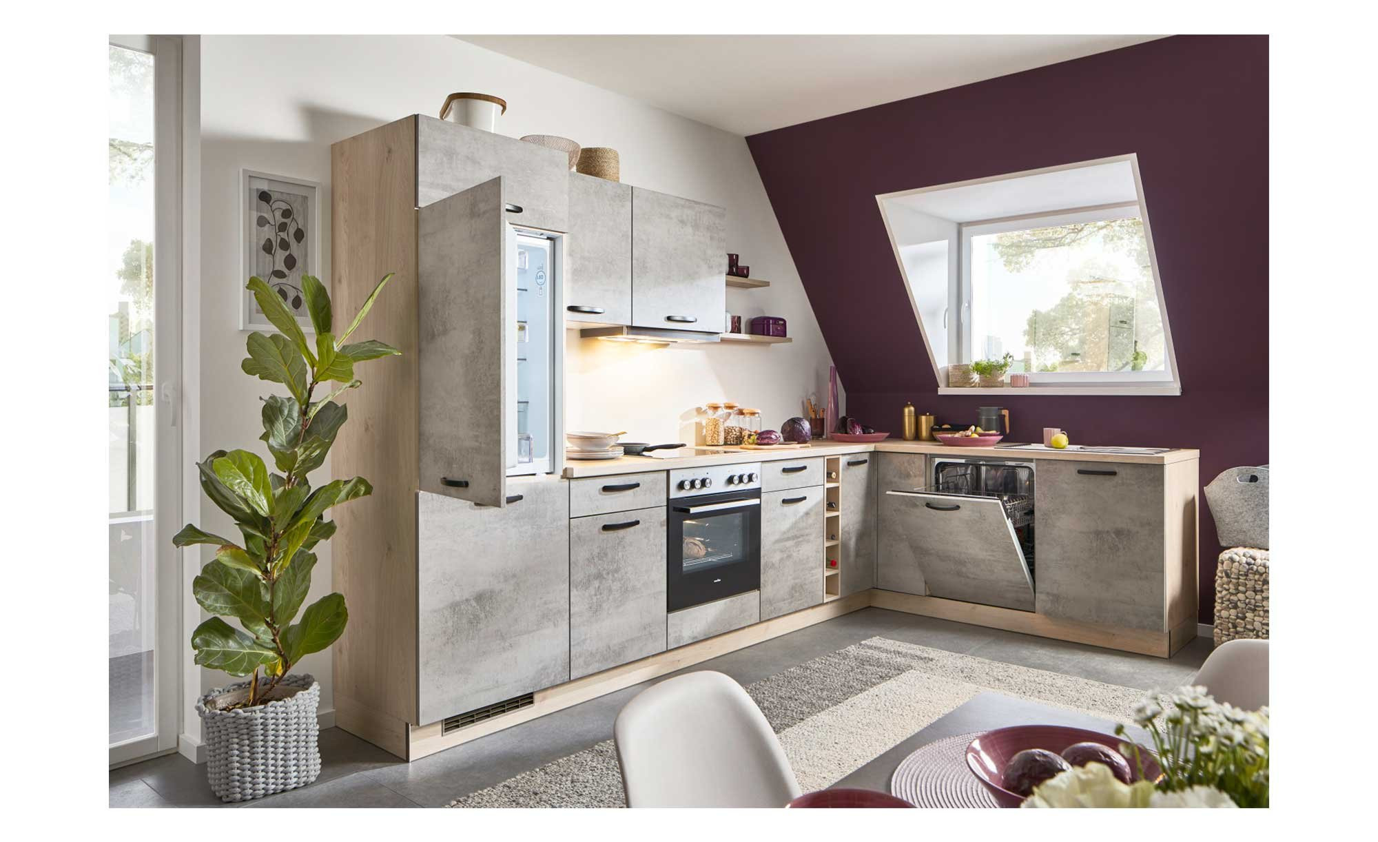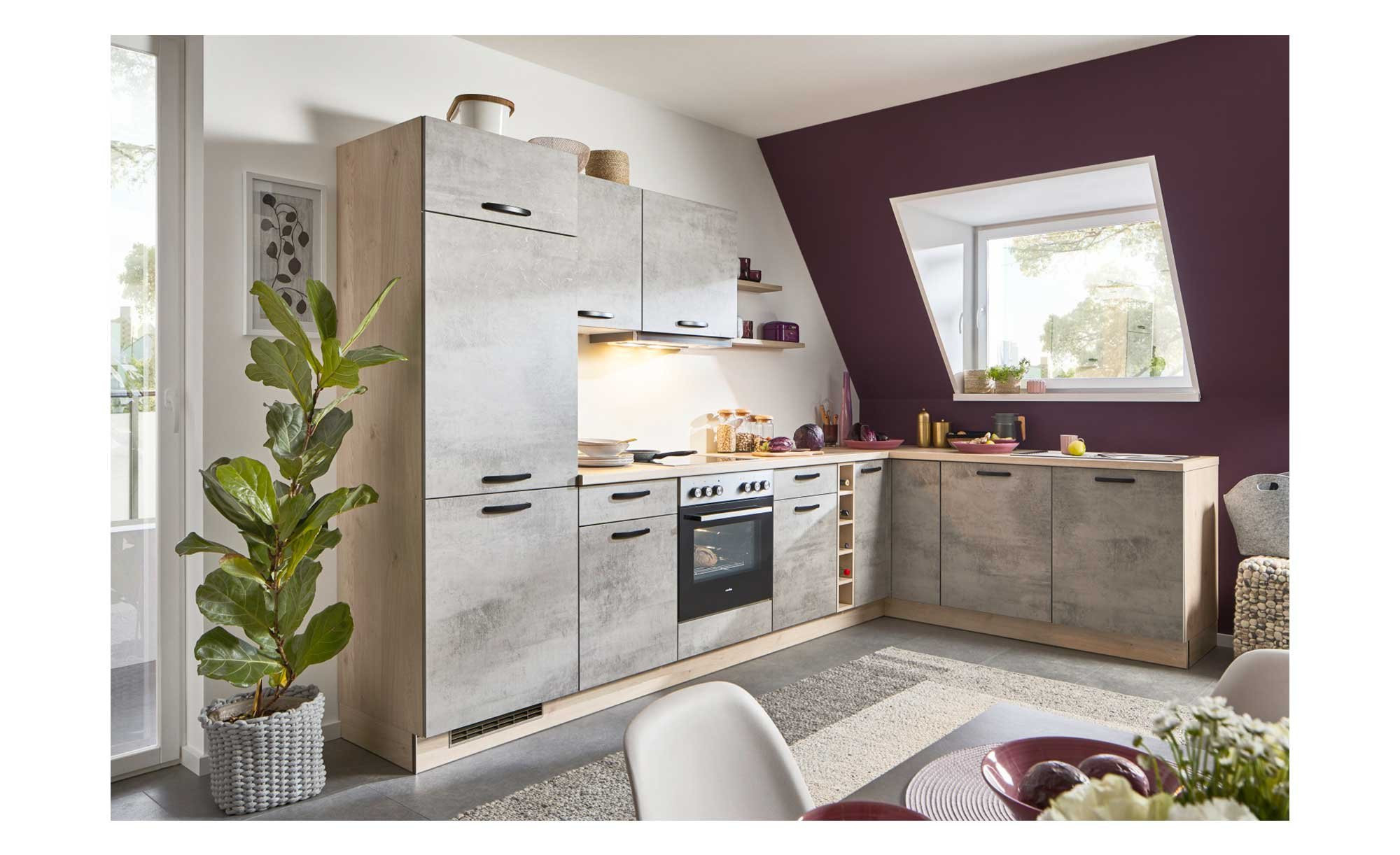 Die ca. 325 x 210 cm große Küche verfügt über Fronten in einem hellen Beton-Look. Dank einer matten Melaminharzbeschichtung und der umlaufenden Dickkante sind die Oberflächen vor Beschädigungen sicher. Als farblicher Kontrast präsentieren sich der Korpus samt Sockel, die Arbeitsplatte, ein Regal und ein Wandboard. Sie sind allesamt in einem stilvollen Anthrazit gehalten.