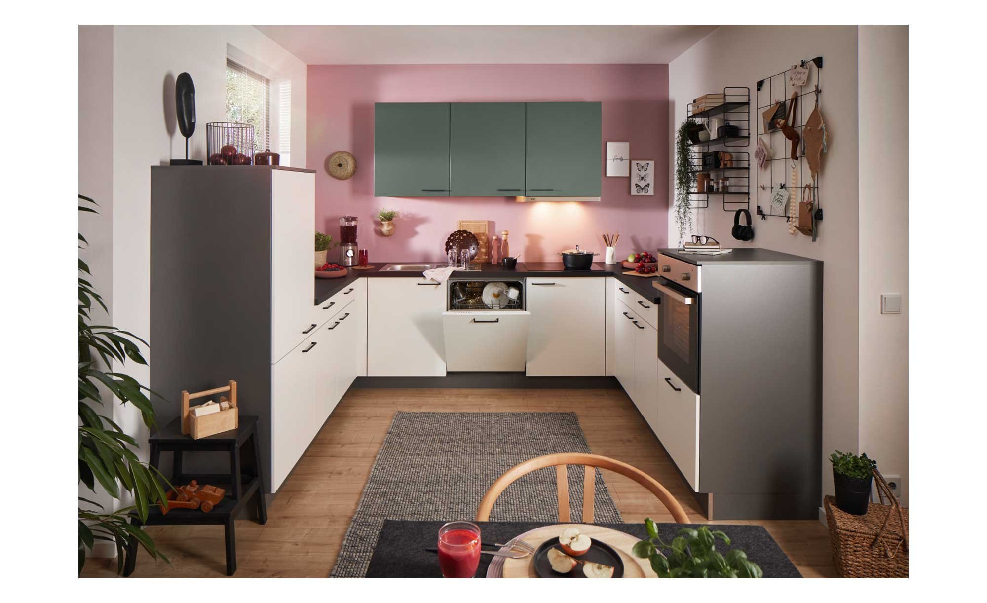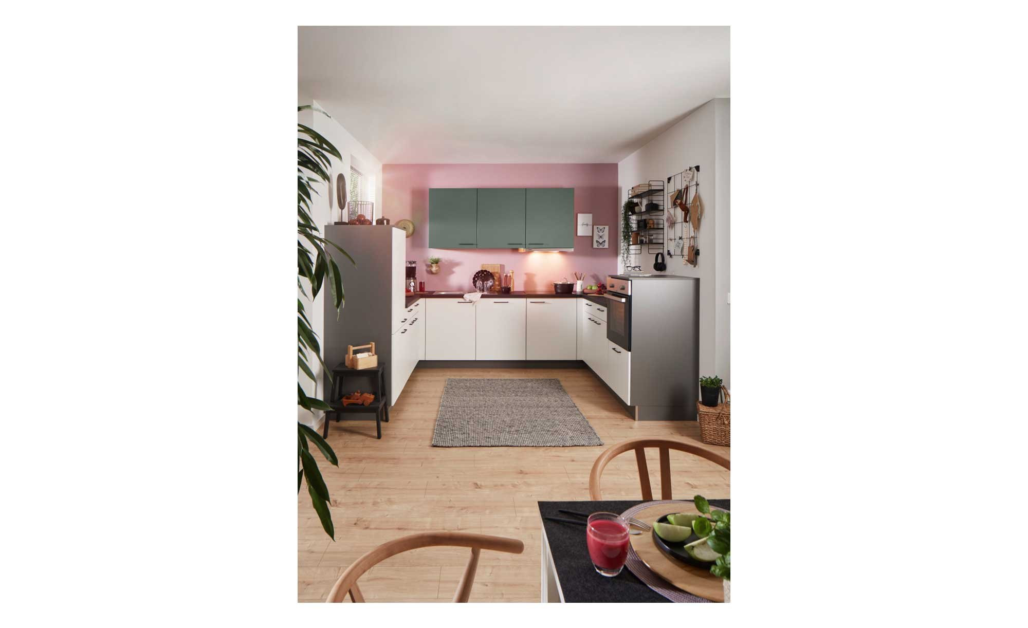 Die U-förmige Express-Wohnküche Win begeistert durch ihre zeitlose, stilvolle Optik und versorgt Sie auf einer Fläche von ca. 225 x 310 x 225 cm mit einer umfangreichen Elektrogeräteausstattung.