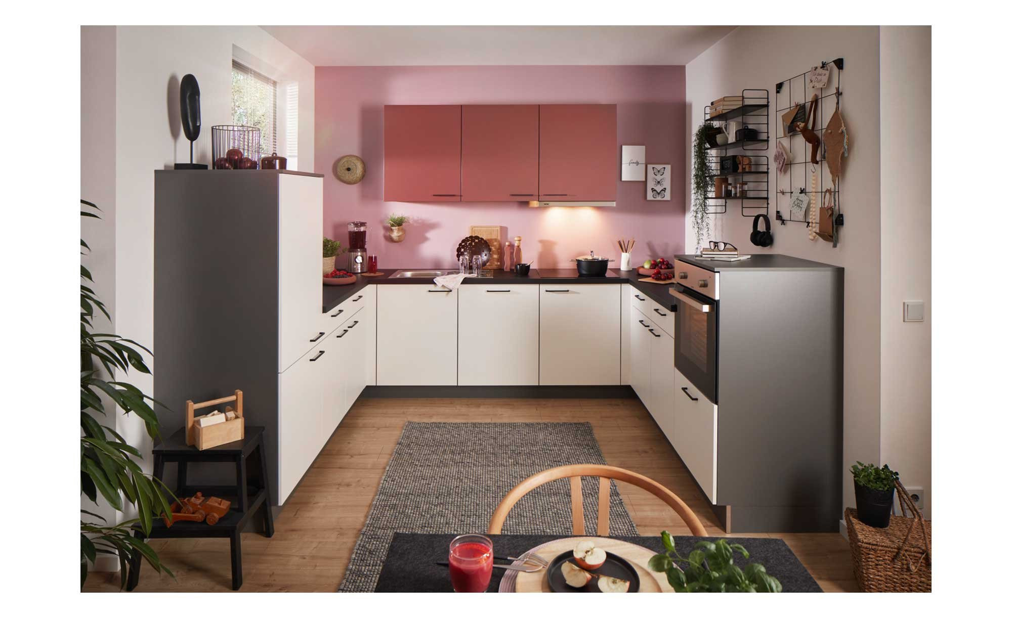 Während Korpus und Sockel der Küche in einem stilvollen Anthrazit gefärbt sind, präsentieren sich die matten Melaminharz-Fronten der Unterzeile ganz in Weiß. Die Vorderseiten der Hängeschränke sorgen mit ihrem auffälligen Karminrot hingegen für einen gelungenen Kontrast. Gegen Verschleiß hilft eine umlaufende Dickkante im jeweils gleichen Dekor.