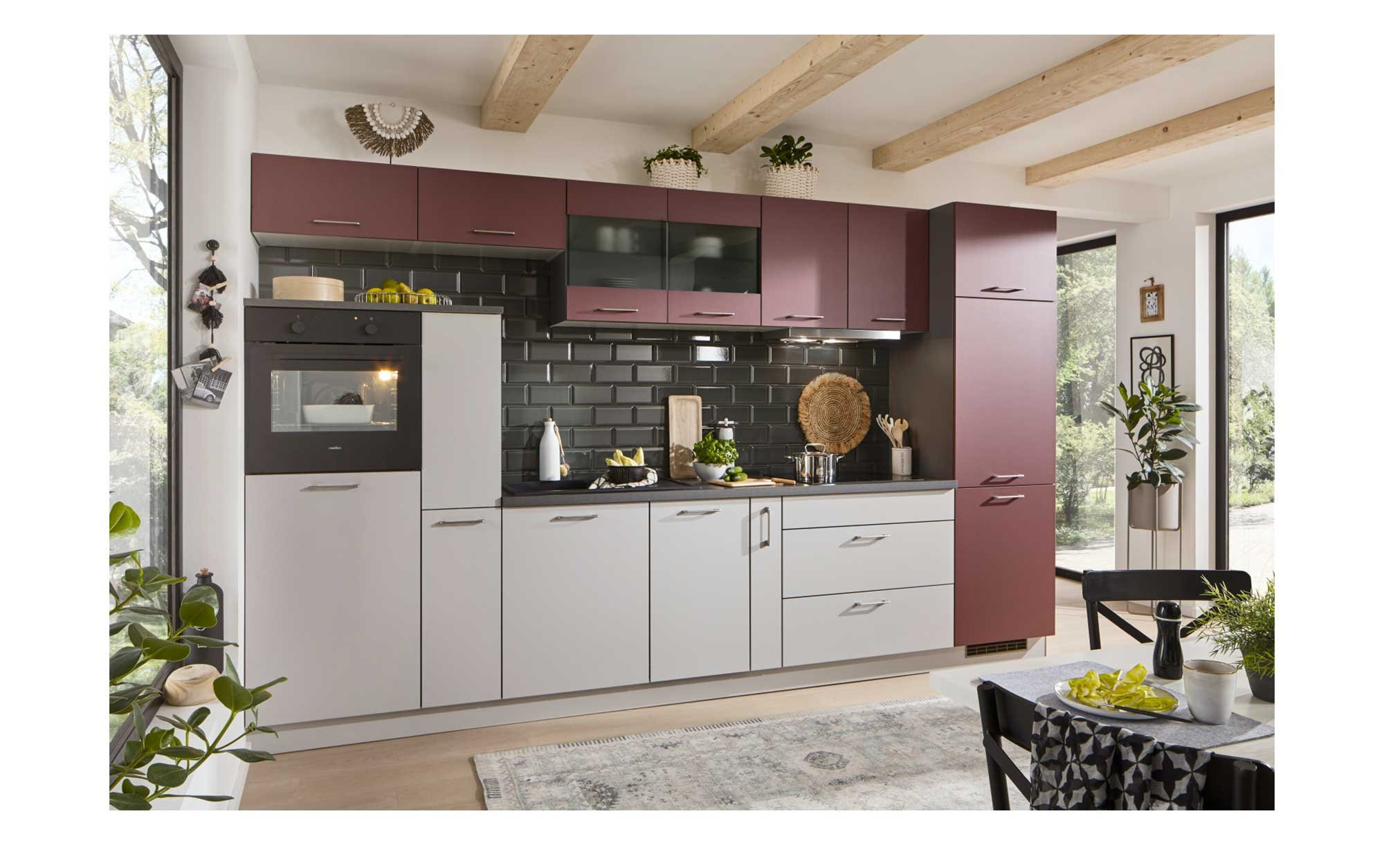 Die Küchenzeile erstreckt sich über eine Länge von ca. 360 cm und ist mit einem Korpus in Hellgrau ausgestattet. Der Sockel sowie etwa die Hälfte der Fronten tragen ebenfalls diesen Farbton, während die andere Hälfte in einem attraktiven Karminrot hervorsticht. Um eine lange Lebensdauer zu gewährleisten, wurden die Oberflächen mit robustem Melaminharz beschichtet, das durch eine umlaufende Dickkante verstärkt wird. Die Arbeitsplatte ist in einem dunklen Stahl-Design gestaltet.