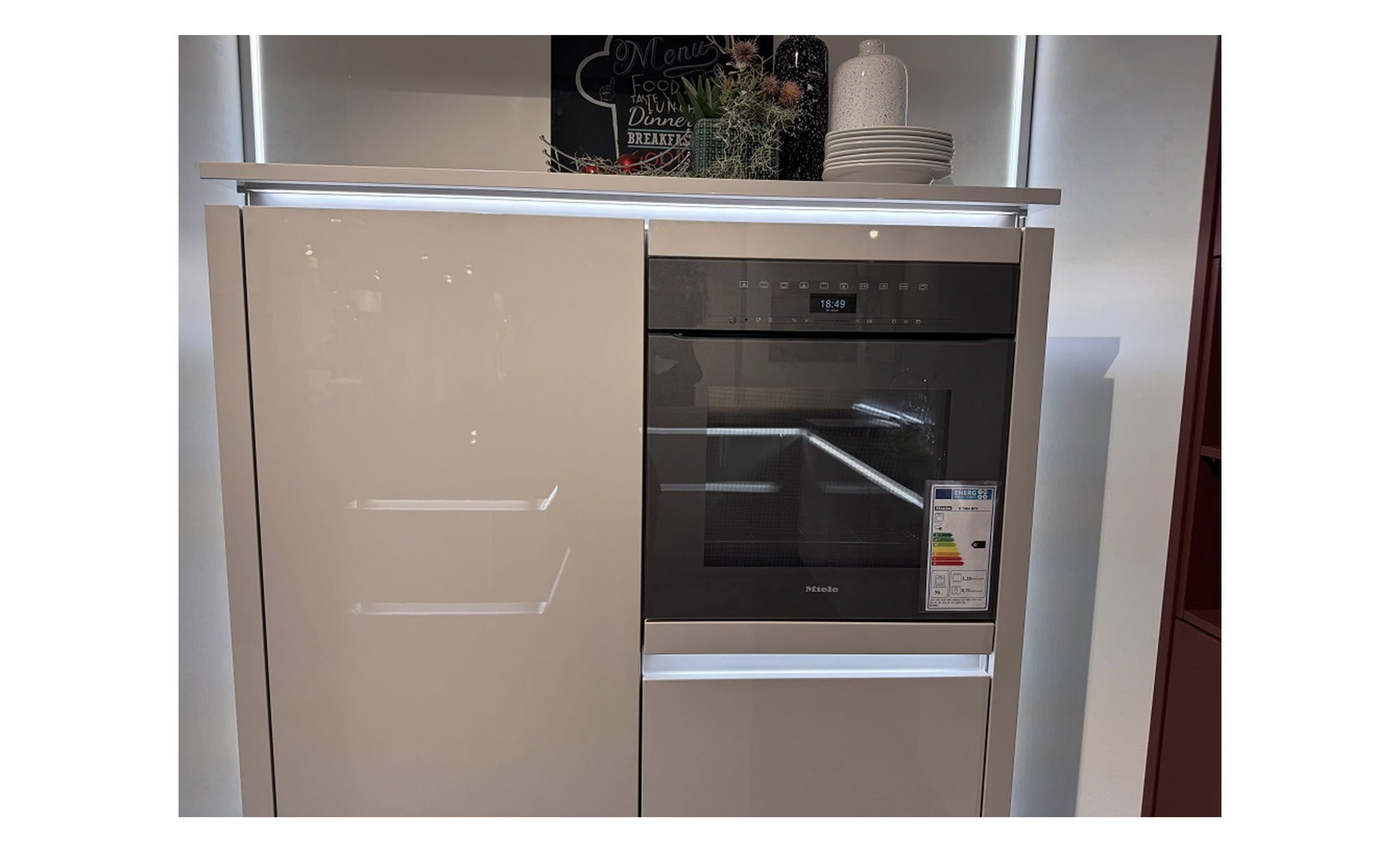 Besonderes Highlight: Exklusiver Mile Backofen in Grauglas und flächenbündige Einbauspüle sowie Kochfeld