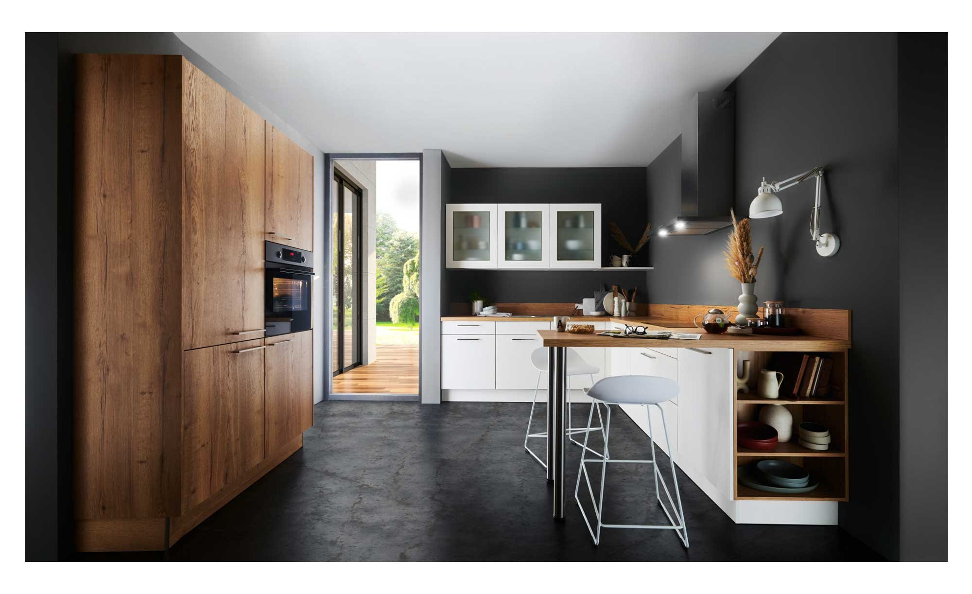 Die Winkelküche verfügt über einen Korpus inklusive Sockel sowie Fronten im Ton Magnolia. Am Schrank hingegen findet sich in Form von Wangen die Farbe Eiche Ventura. Das gleiche Dekor tragen auch die Schrankfronten, eine Nische und die Arbeitsplatte.