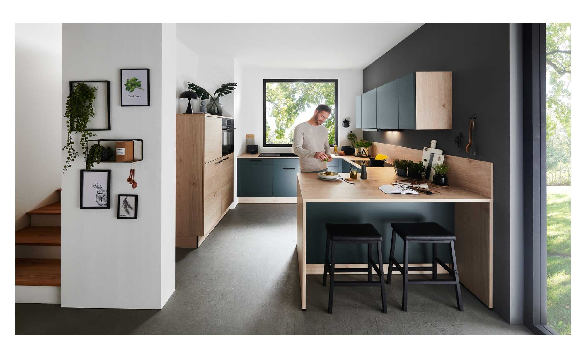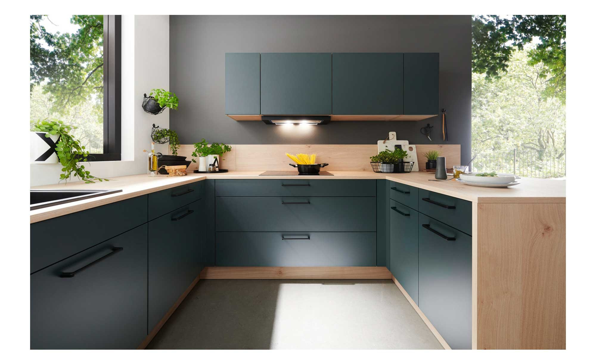 Mit dem Dekor Asteiche Natur sorgt der Korpus der Möbel für eine besondere Basis. Auch die Arbeitsplatte, die Wangen, ein Regal und Teile der Fronten sind auf diese Weise gestaltet. Lediglich die Vorderseiten der Küchenzeilen begeistern im matten Farbton Black Green. Für einen robusten Schutz vor Stößen und Kratzern sorgt die Melaminharzbeschichtung der Oberflächen. Außerdem gibt es eine dekorgleiche Dickkante, die ebenso Verschleiß vorbeugt. Schwarze Griffe aus Metall fügen sich stilvoll ins Bild.