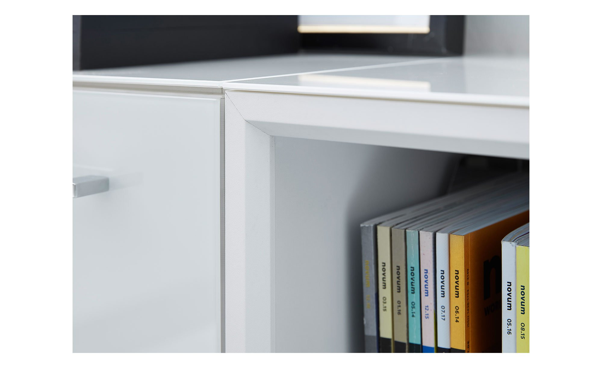 Der aus Holzwerkstoff bestehende Korpus des Möbels ist inklusive Rückwand ganz in Weiß gehalten. Eine kratzfeste Oberflächenbeschichtung mit Melaminharz schützt zusammen mit den stoß- und schlagfesten ABS-Kanten vor Verschleiß. Außerdem erwarten Sie ein 3D-Rahmen mit MDF-ummantelter Gehrung sowie der stilvolle Oberboden mit widerstandsfähiger Glasauflage. Schwarze Kunststofffüße bilden einen gelungenen Kontrast.