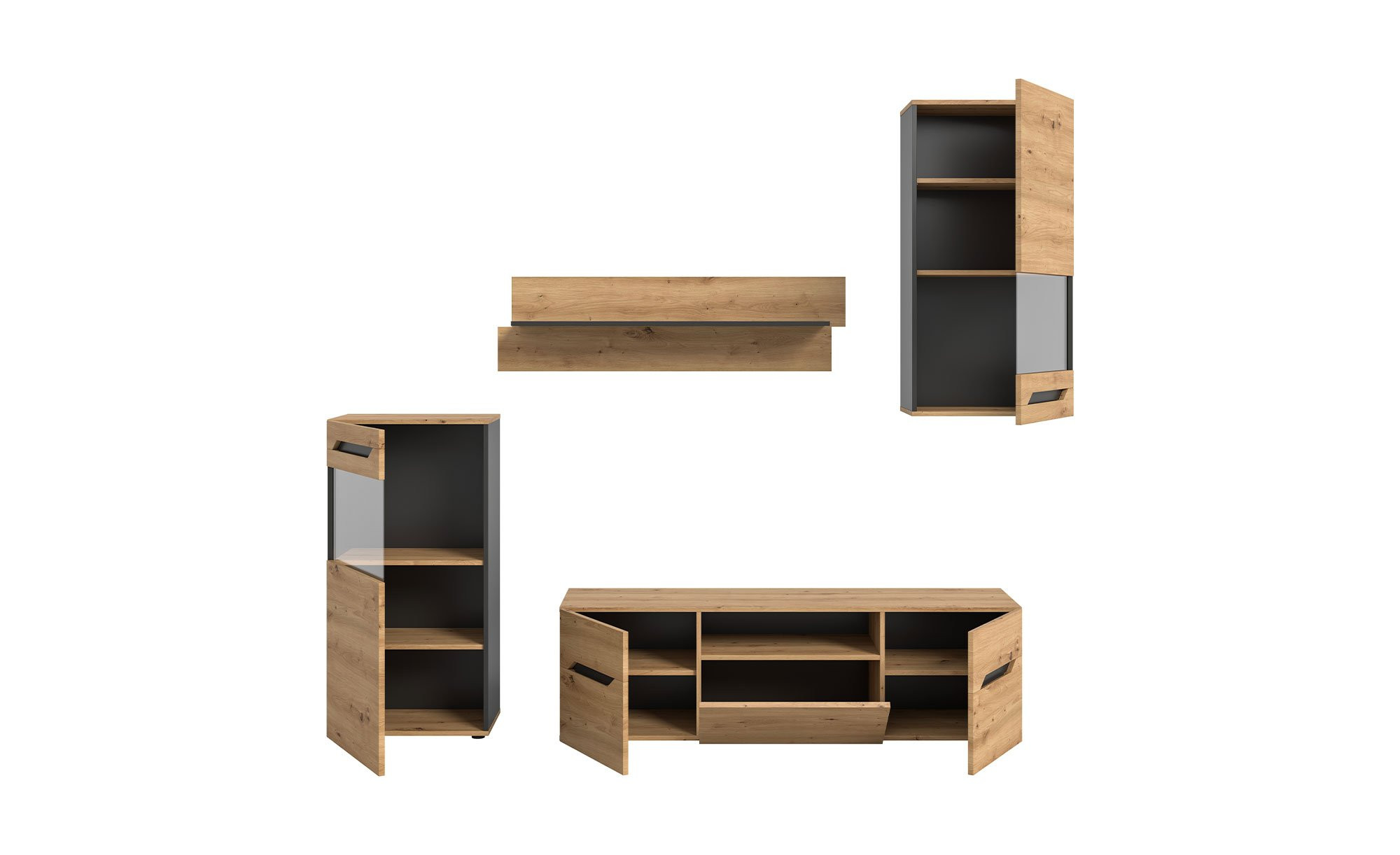 Auf einer Gesamtfläche von ca. 253 x 196 x 40 cm erwarten Sie Möbelstücke im Dekor Artisan Eiche. Während die Fronten aus MDF gefertigt und zum Schutz vor Verschleiß mit Melamin beschichtet wurden, bestehen die Korpusse aus Holzwerkstoff. Hinzu kommen Absetzungen in Basalt Grau, außerdem sind die Rückwände in Basalt gehalten. Schwarze Kunststofffüße und Elemente aus Klarglas runden das Angebot ab.