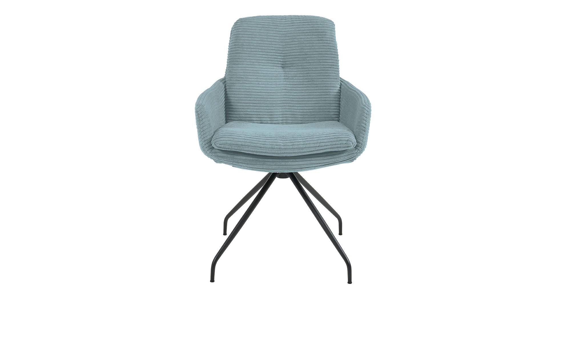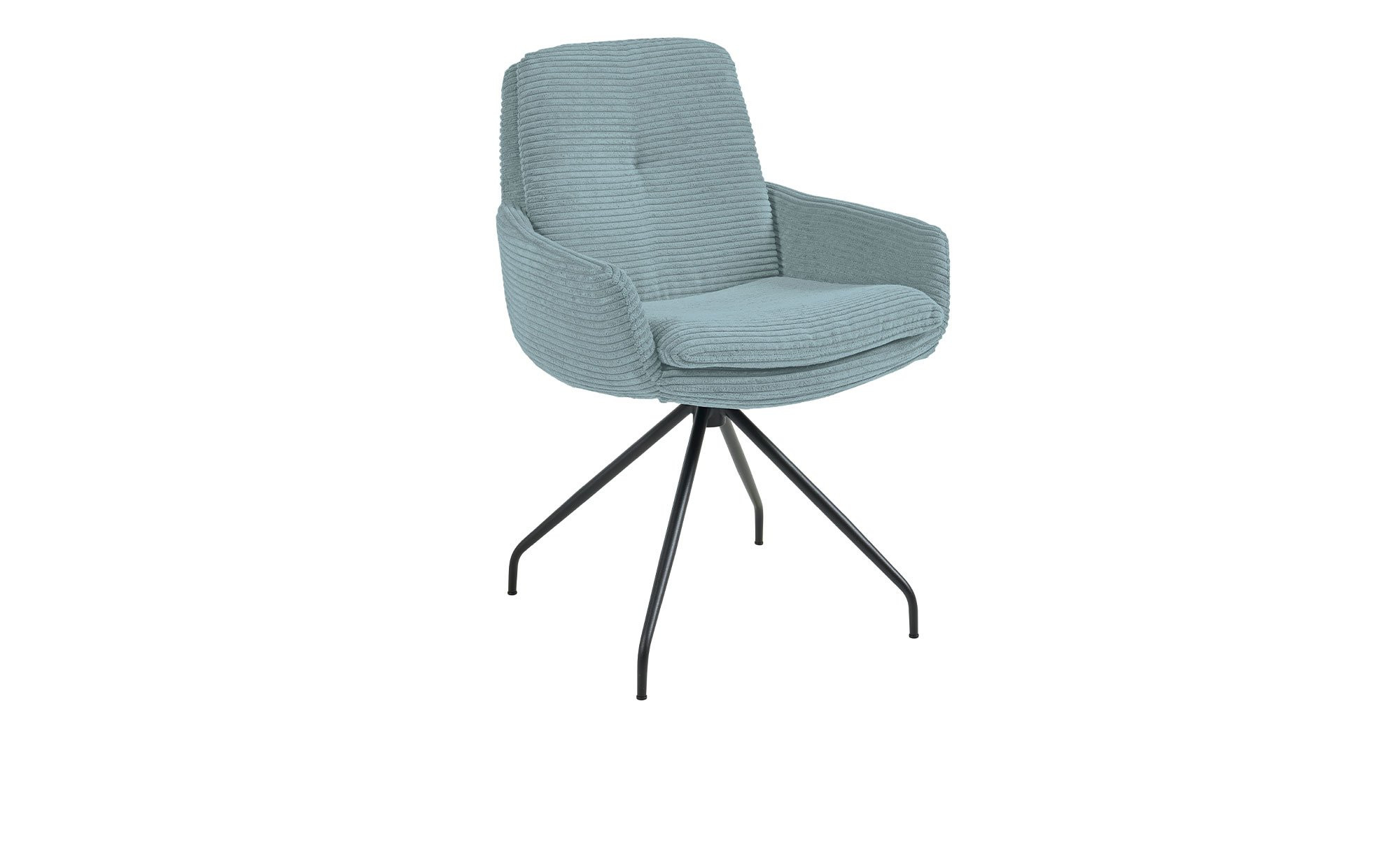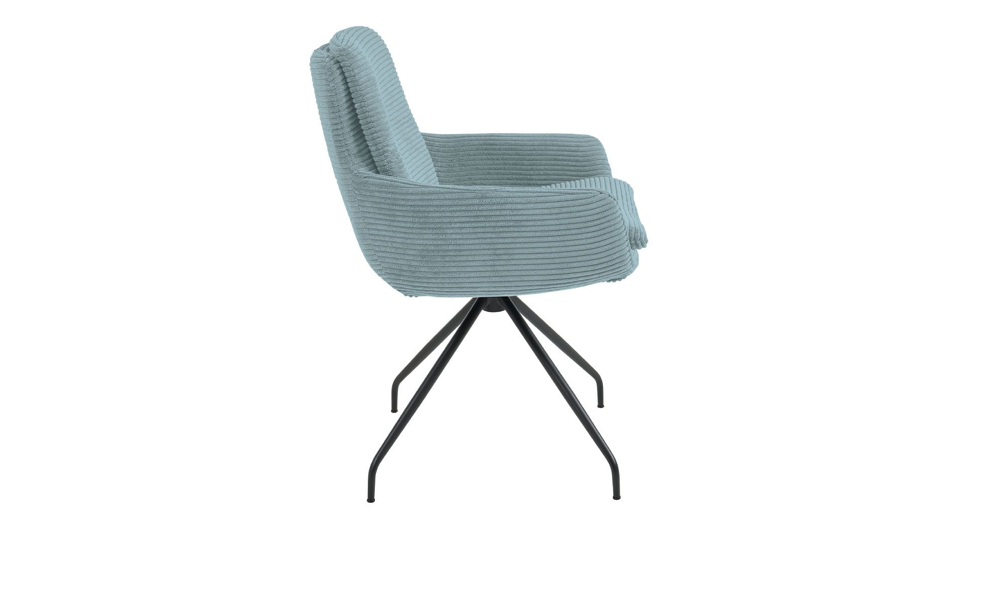 Der Stuhl ist ca. 62 x 90 x 68 cm groß und um 360° drehbar. Sein Bezug aus Cord Stoff in Light Blue versprüht einen gemütlichen Charme. Wir bieten bei Bedarf aber auch Farb- und Bezugsalternativen an.