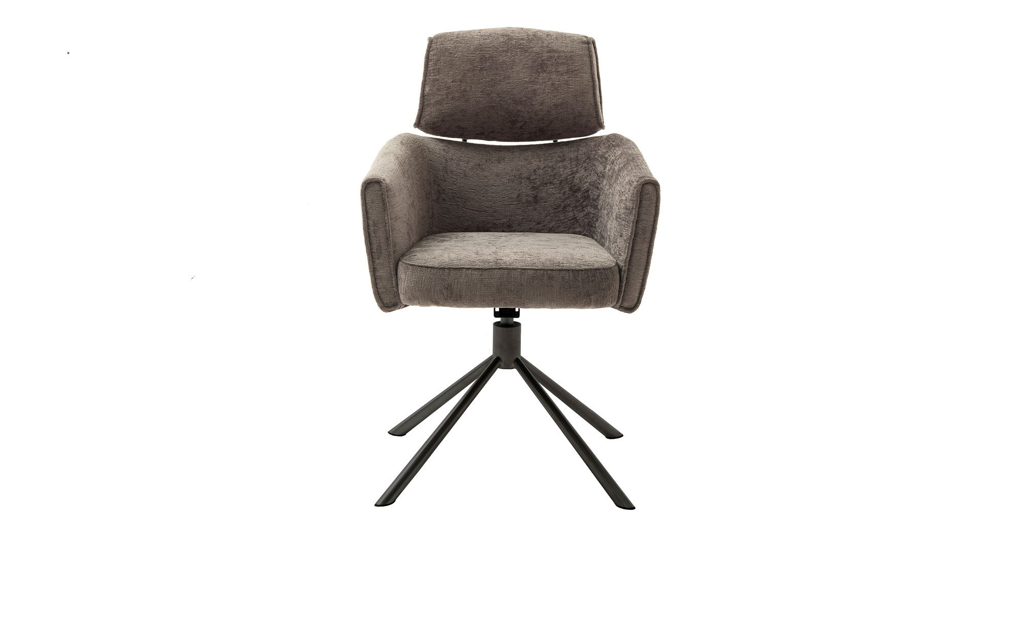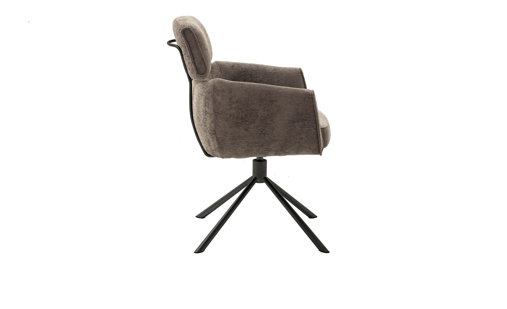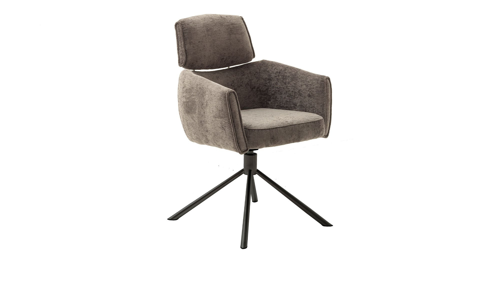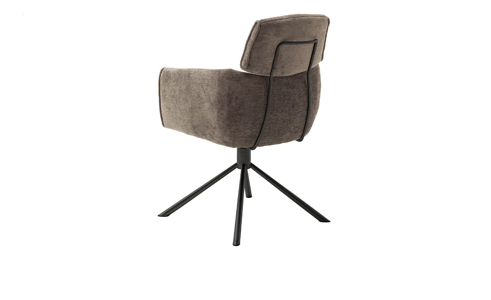 Der Stuhl ist mit einem konischen Metallgestell ausgestattet, das in mattem Schwarz lackiert ist und über vier Füße verfügt. Er ist ca. 60 x 92 x 64 cm groß. Der Sitz überzeugt mit einem Bezug aus 100 % Polyester in Chenille-Optik. Mit seinem eleganten Braun-Ton fügt er sich nahtlos in das Gesamtbild.