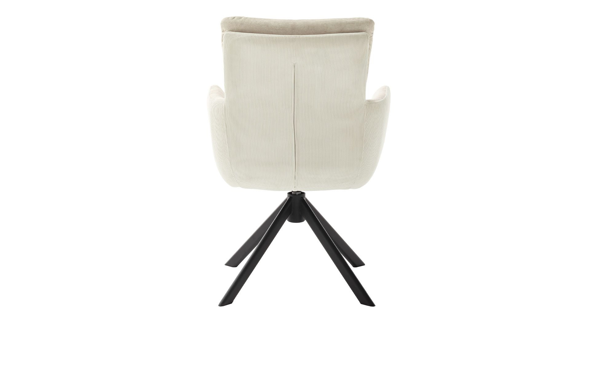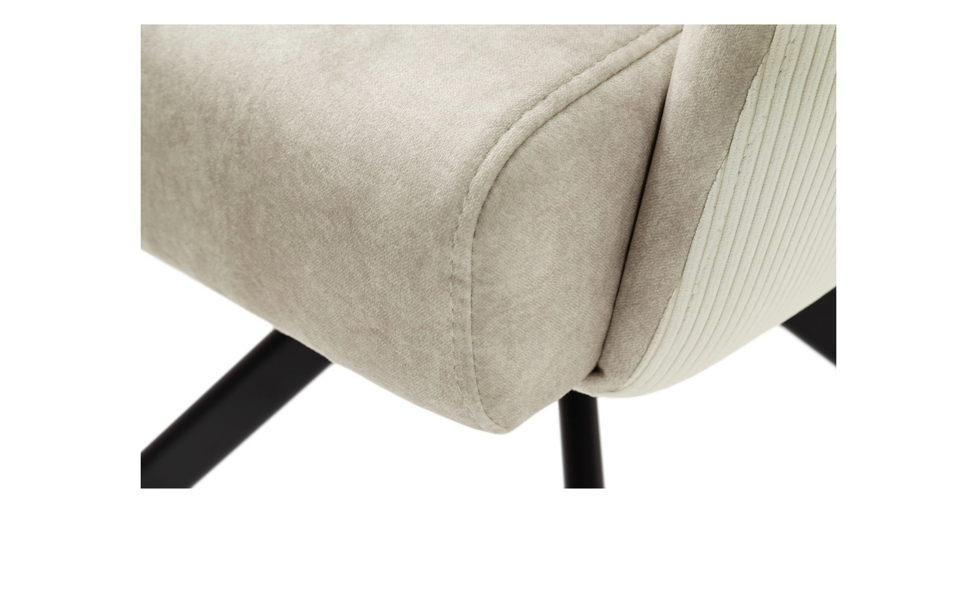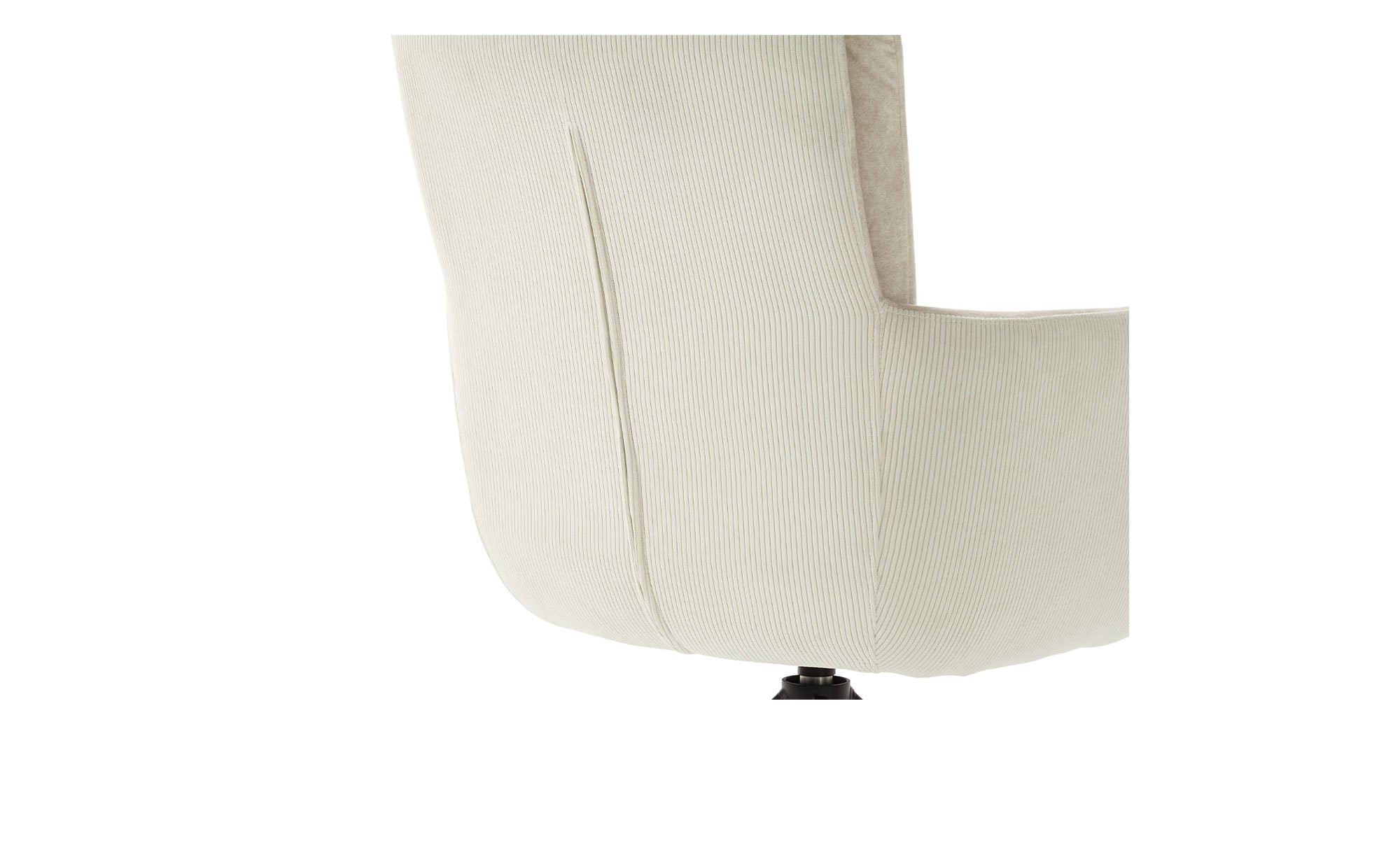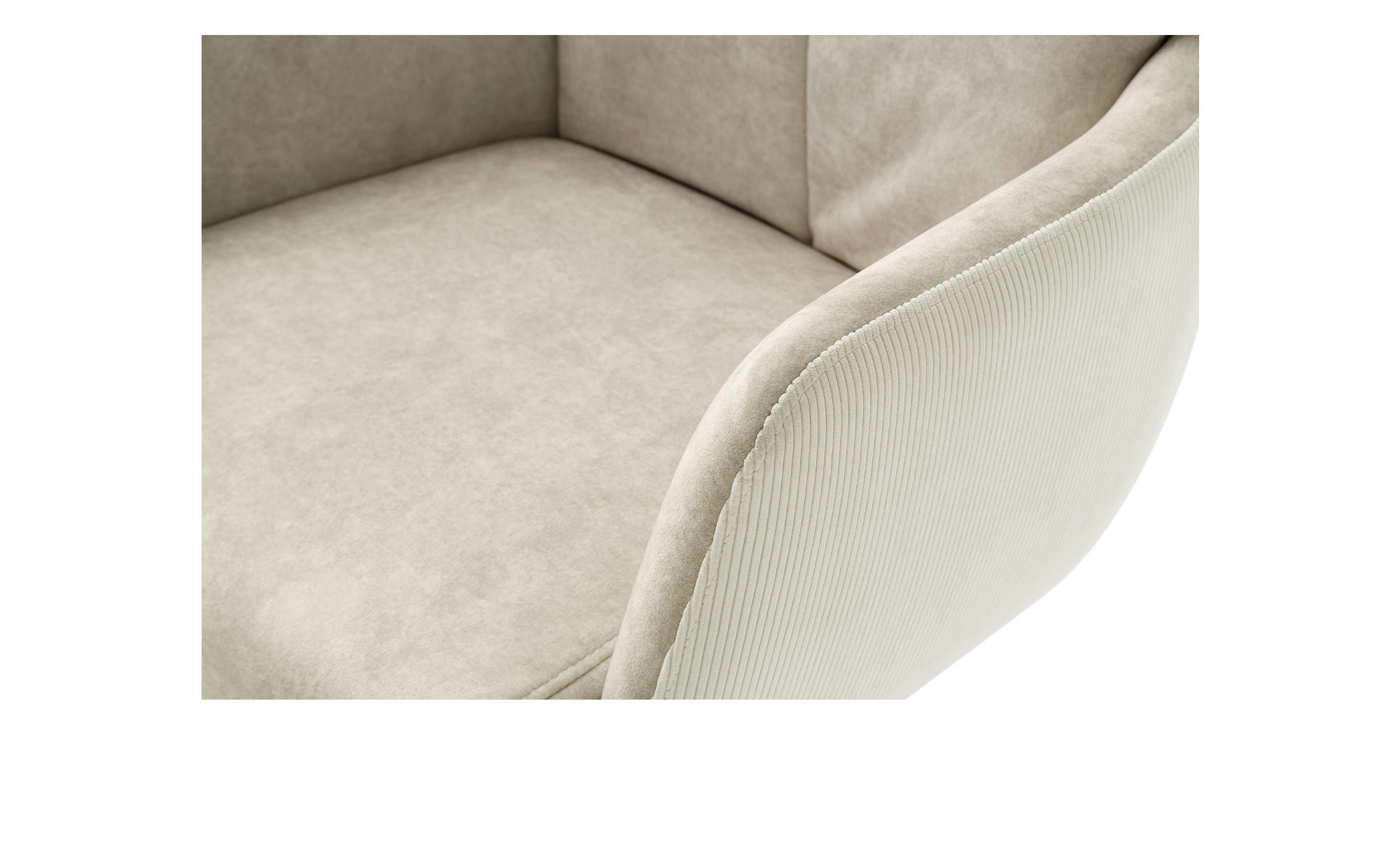 Der Sitz-Bezug des ca. 61 x 90 x 67 cm großen Stuhls besteht aus 100 % Polyester in einem attraktiven VintageVelours-Look. Dieser Stoff ist, wie auch am Rücken und an den Armlehnen, in der Farbe Creme gehalten. An der Rückseite erwartet Sie jedoch ein Bezug in Cord-Optik.
