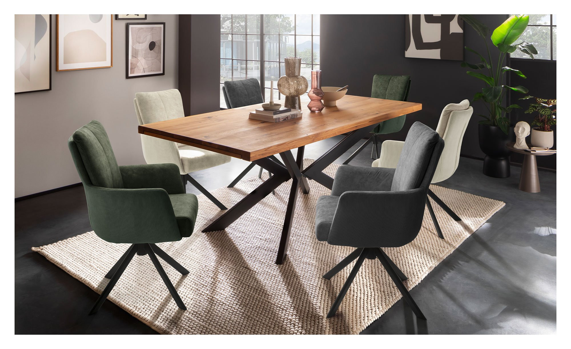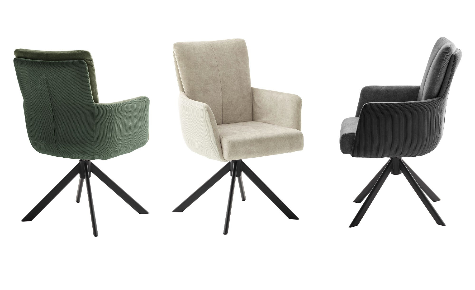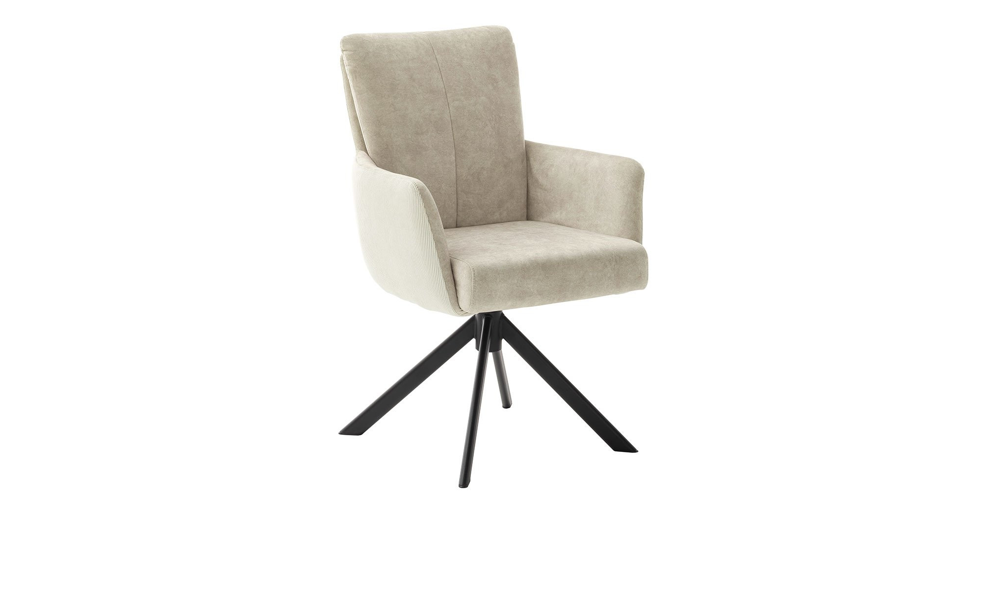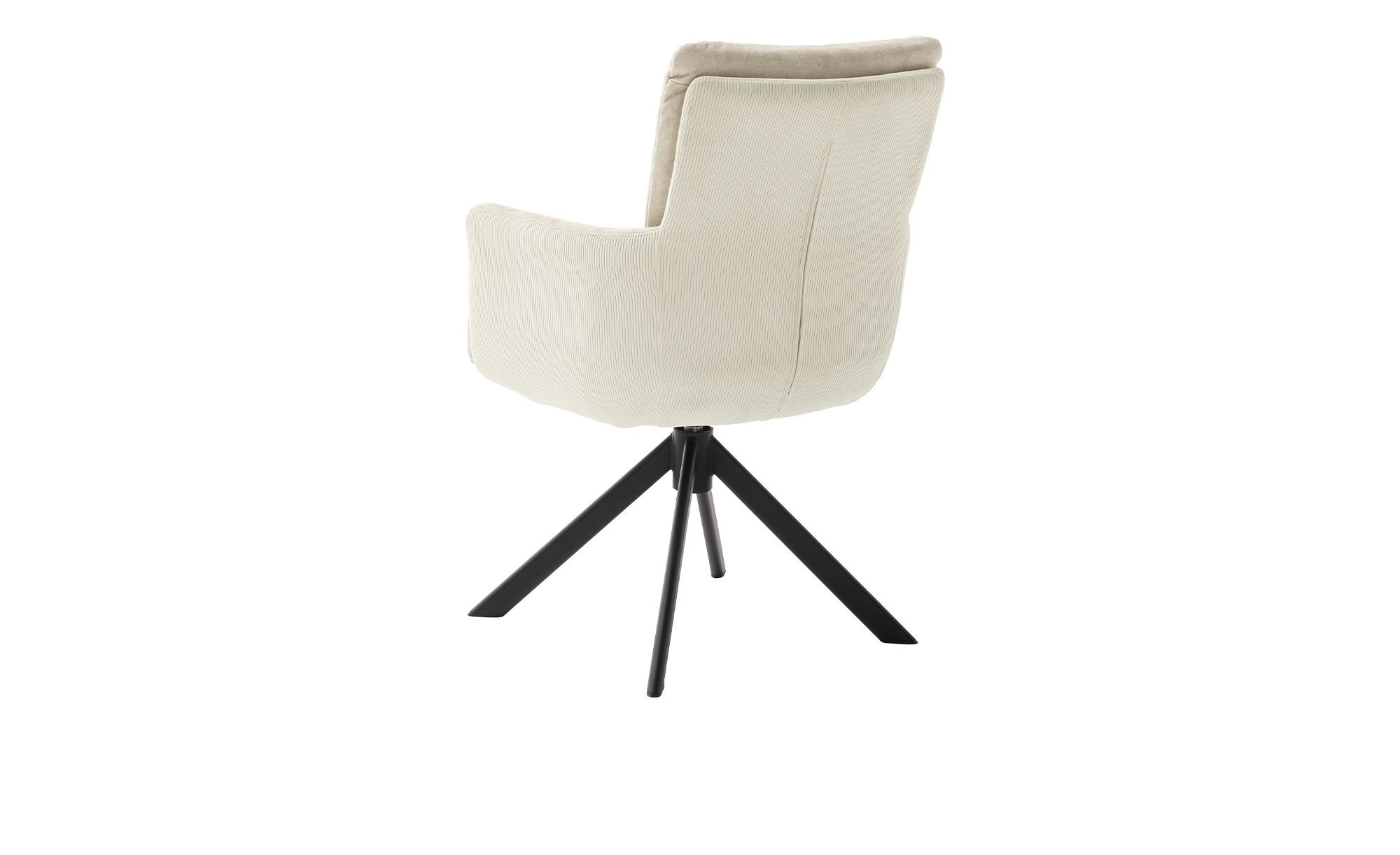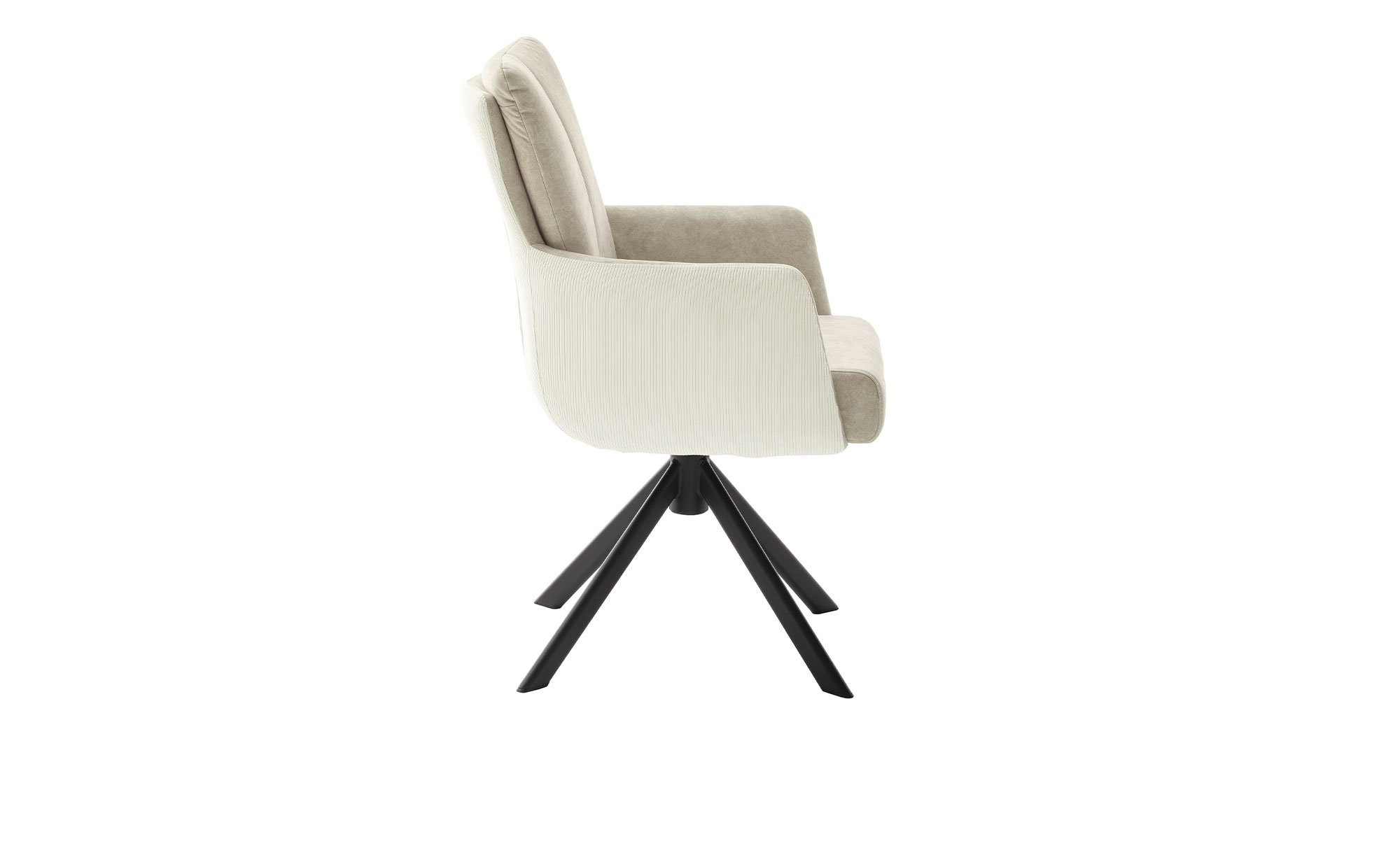Der Sitz-Bezug des ca. 61 x 90 x 67 cm großen Stuhls besteht aus 100 % Polyester in einem attraktiven VintageVelours-Look. Dieser Stoff ist, wie auch am Rücken und an den Armlehnen, in der Farbe Creme gehalten. An der Rückseite erwartet Sie jedoch ein Bezug in Cord-Optik.