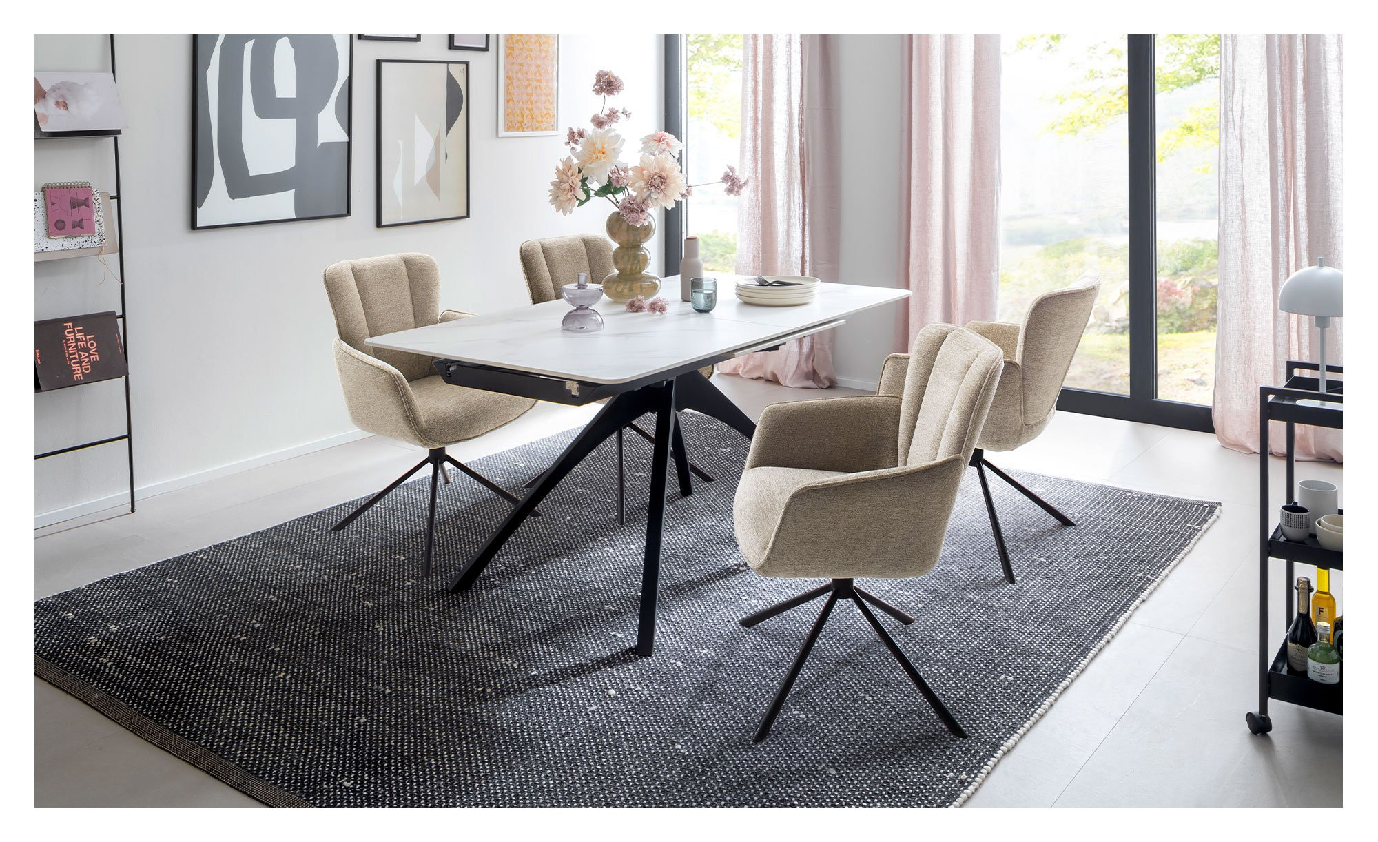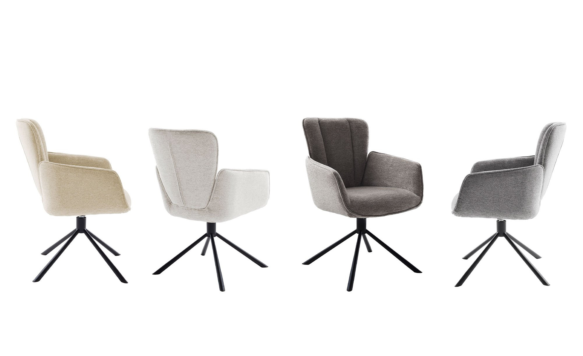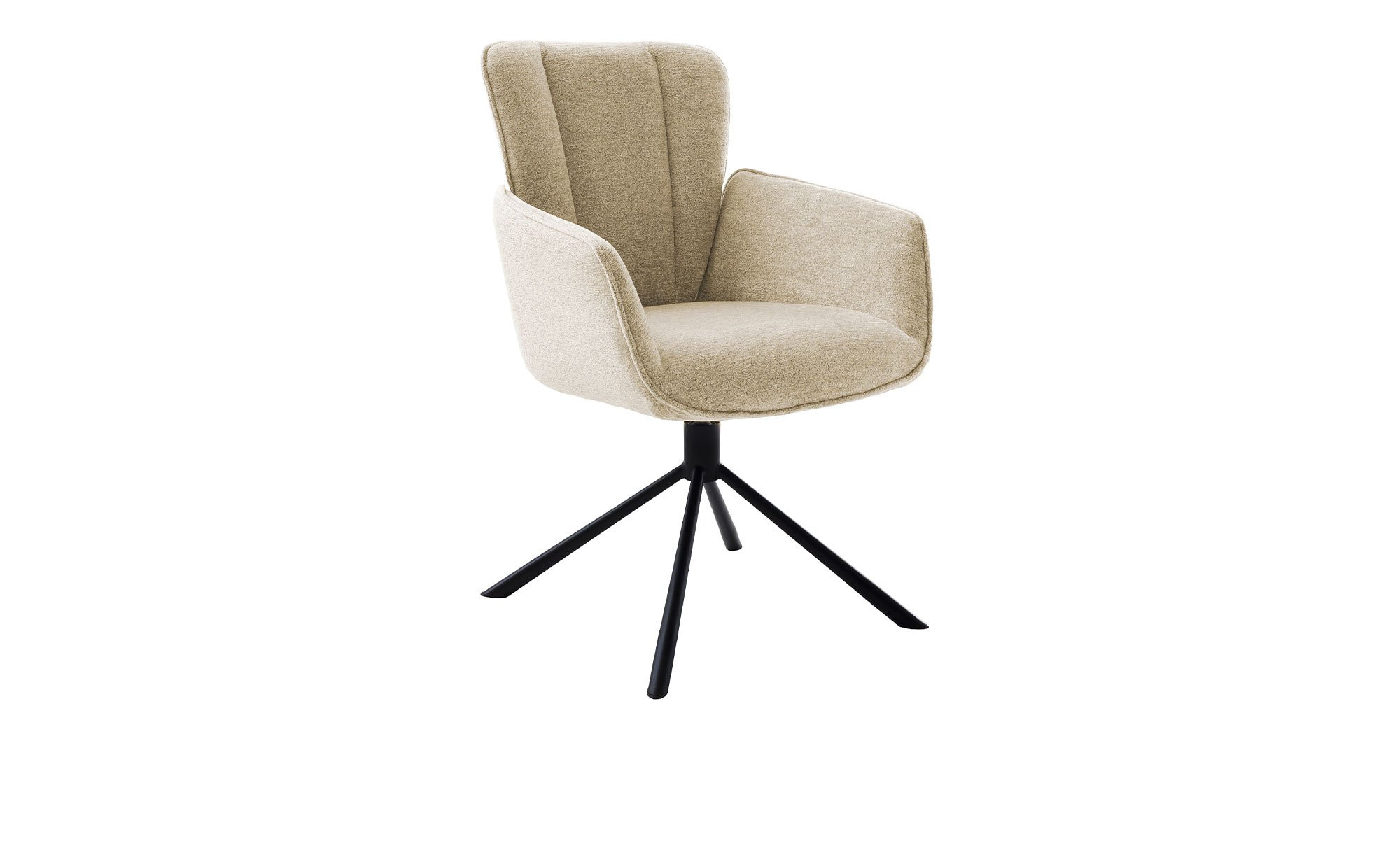 Am Sitz ist das ca. 62 x 90 x 66 cm große Möbelstück mit einem cremefarbigen Strukturgewebe aus 100 % Polyester bezogen. Außerdem verfügt es über ein in mattem Schwarz lackiertes Metallgestell von konischer Form.