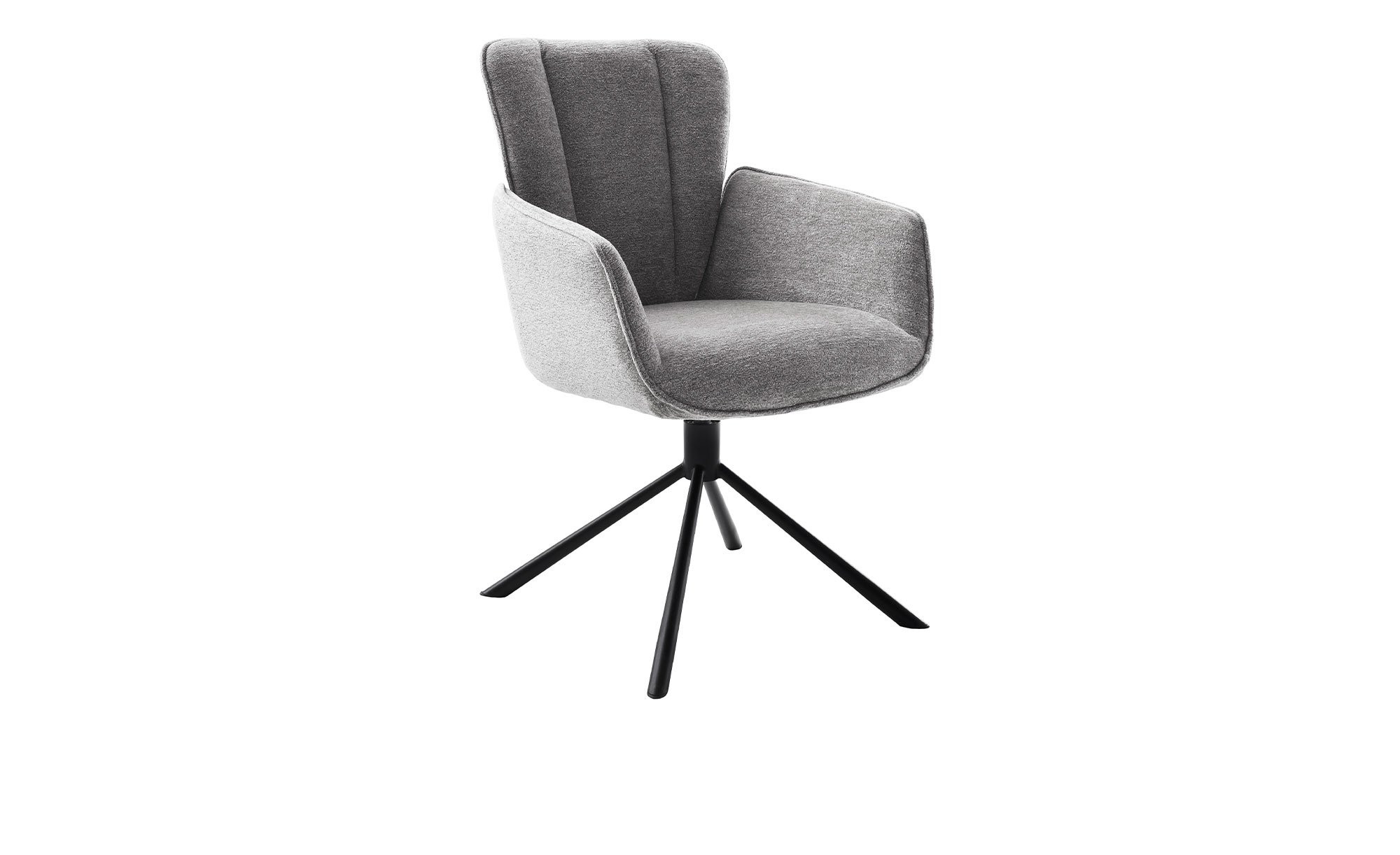 Das ca. 62 x 90 x 66 cm große Möbelstück ist am Sitz mit einem grauen Strukturgewebe aus 100 % Polyester bezogen. Ein konisches Metallgestell in mattem Schwarz rundet das elegante Erscheinungsbild ab.