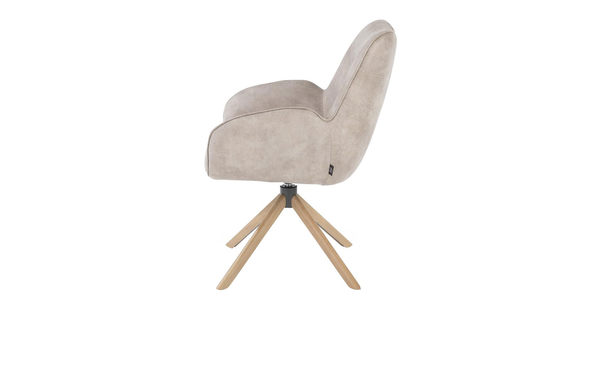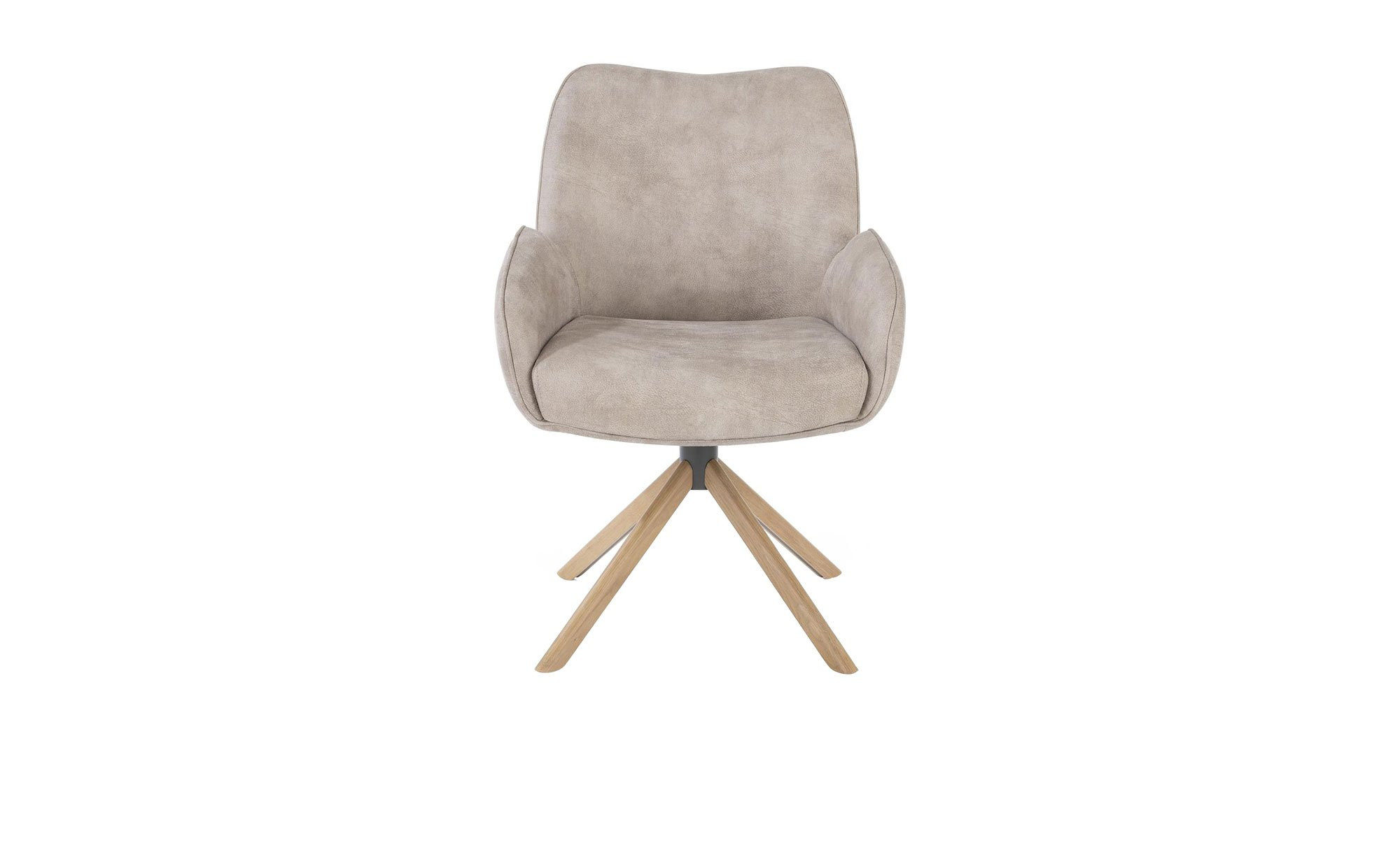 Sein modernes Design verdankt das ca. 62 x 88 x 65 cm große Möbelstück einem stabilen Sta-tivgestell aus Eiche-Echtholz inklusive lackierter Oberfläche. Dieses trägt den drehbaren Sitz mit einem Bezug aus Leder und Mikrofaser in Beige-Grau.