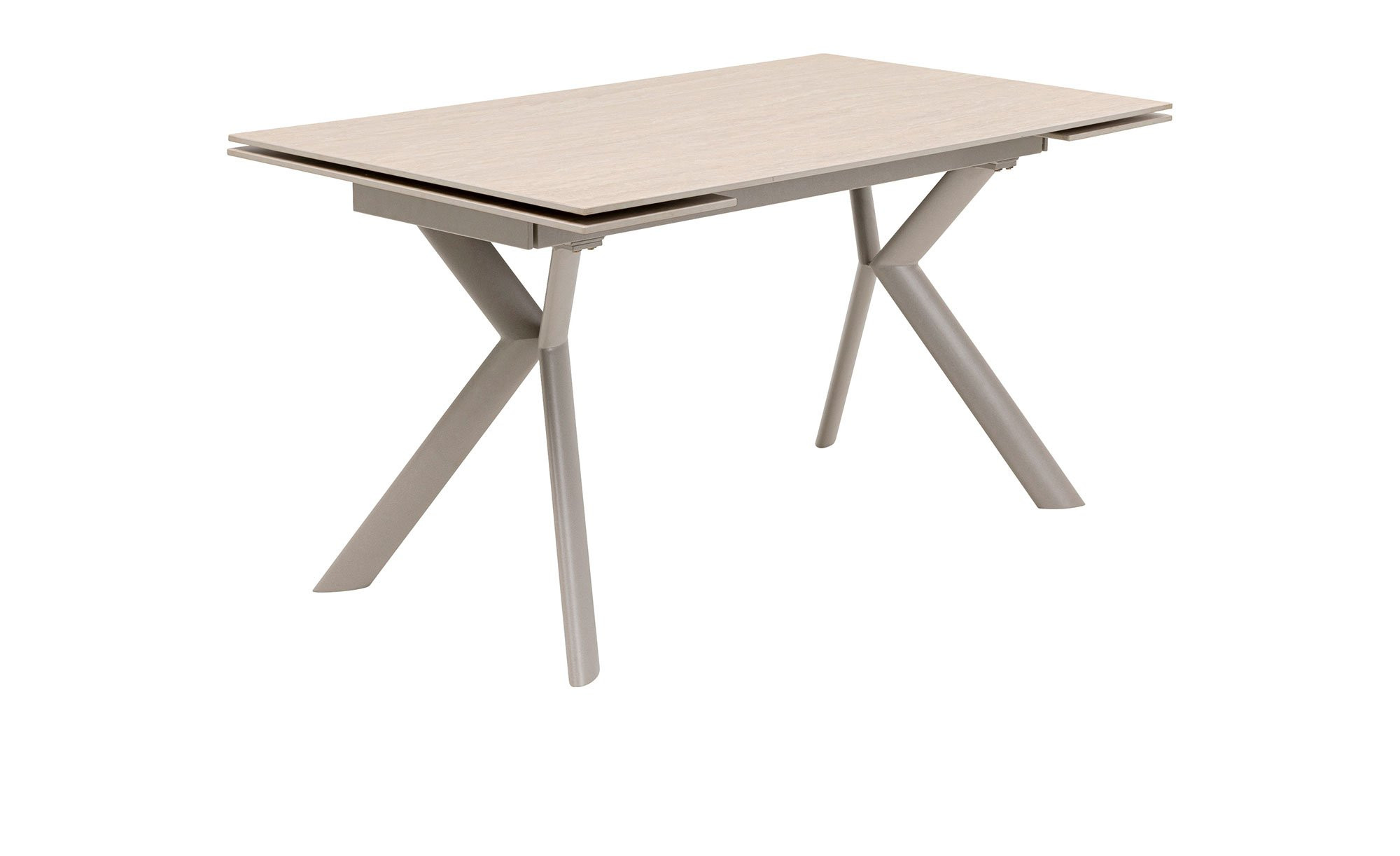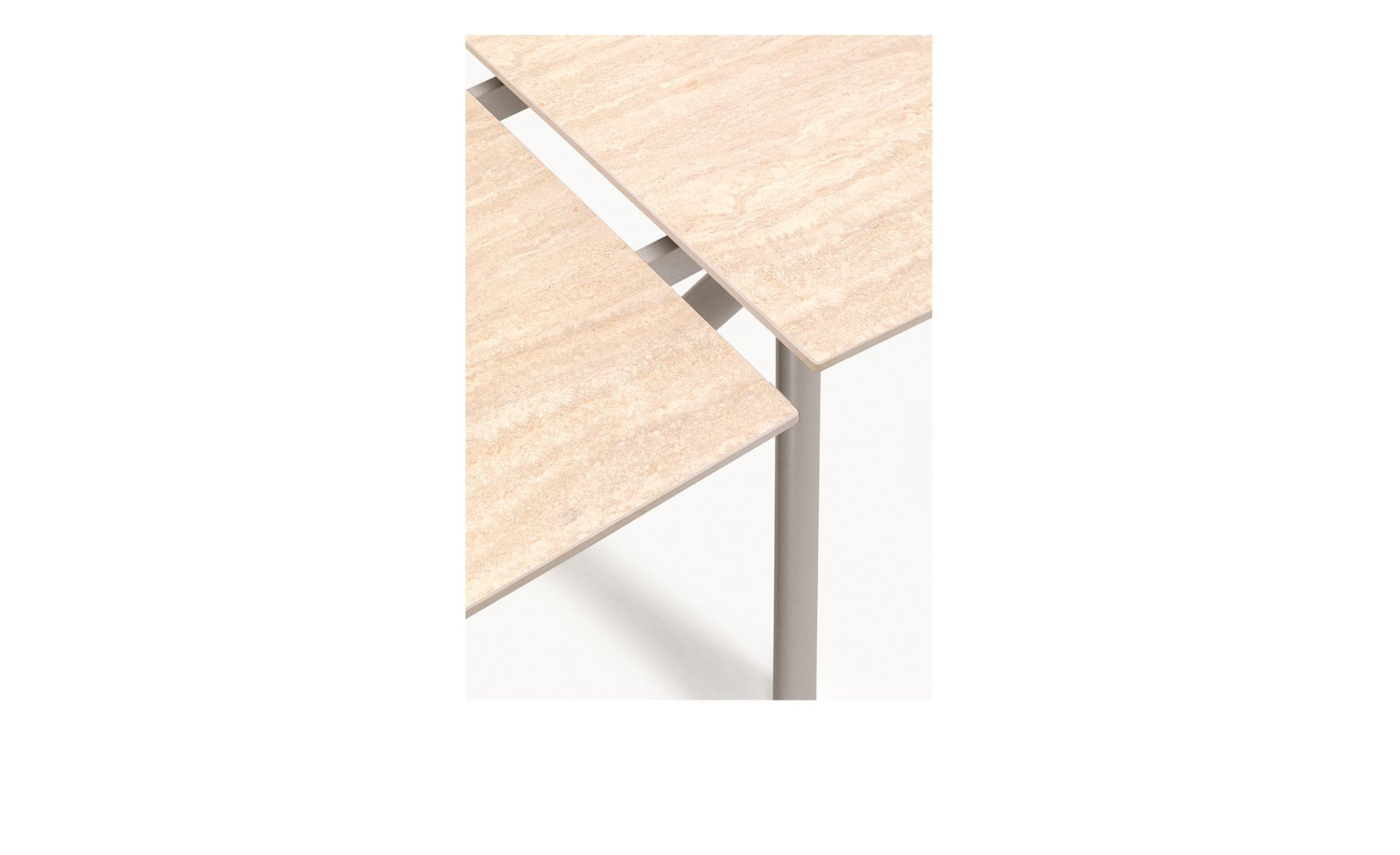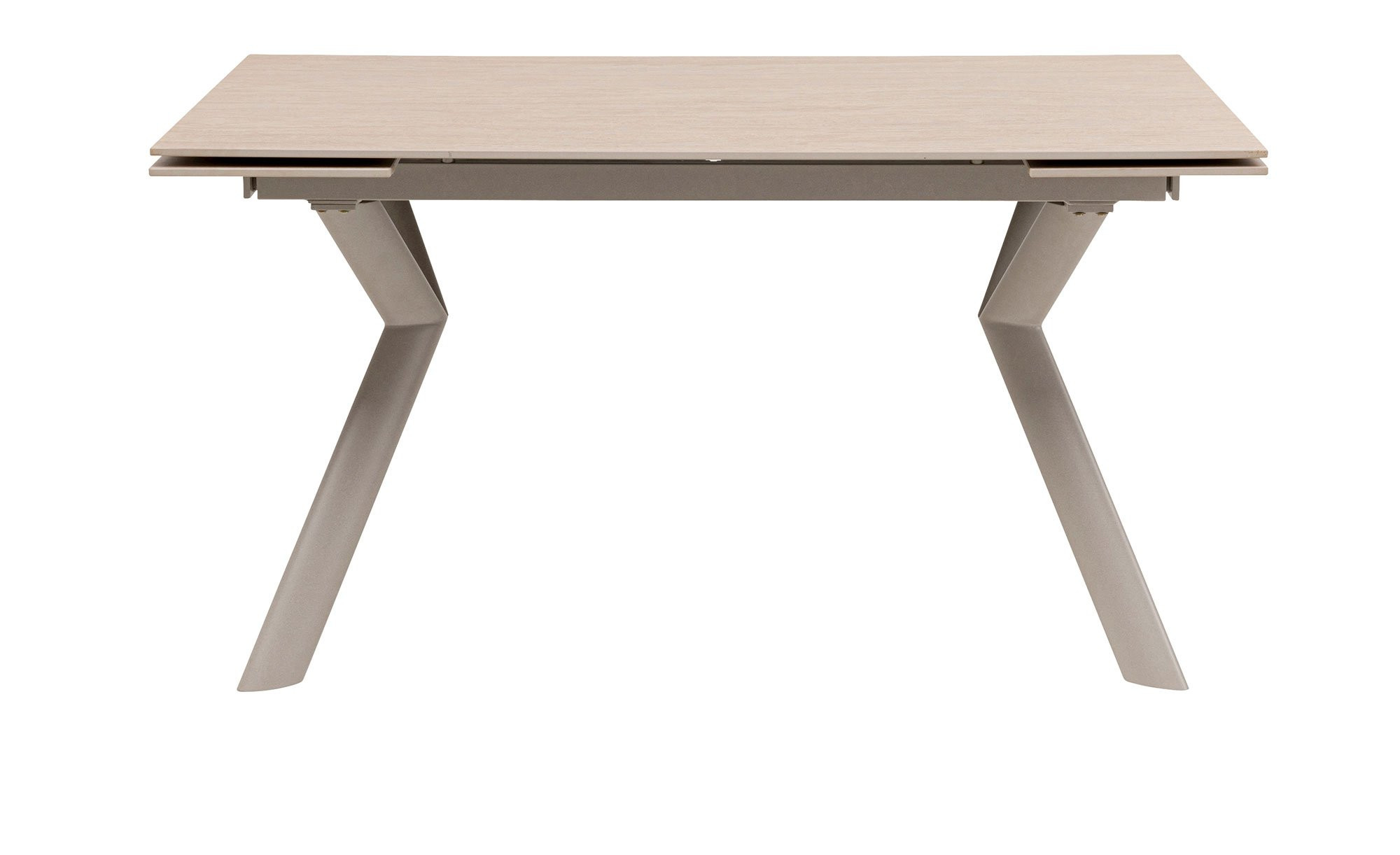 Der Artikel misst ca. 140 x 76 x 80 cm und verfügt über eine beige Steinzeug-Platte mit Lackierung. Sie hat eine rechteckige Form und ist ca. 12 mm stark. Getragen wird die Tischplatte von einem pulverbeschichteten Stahlgestell in Grau.