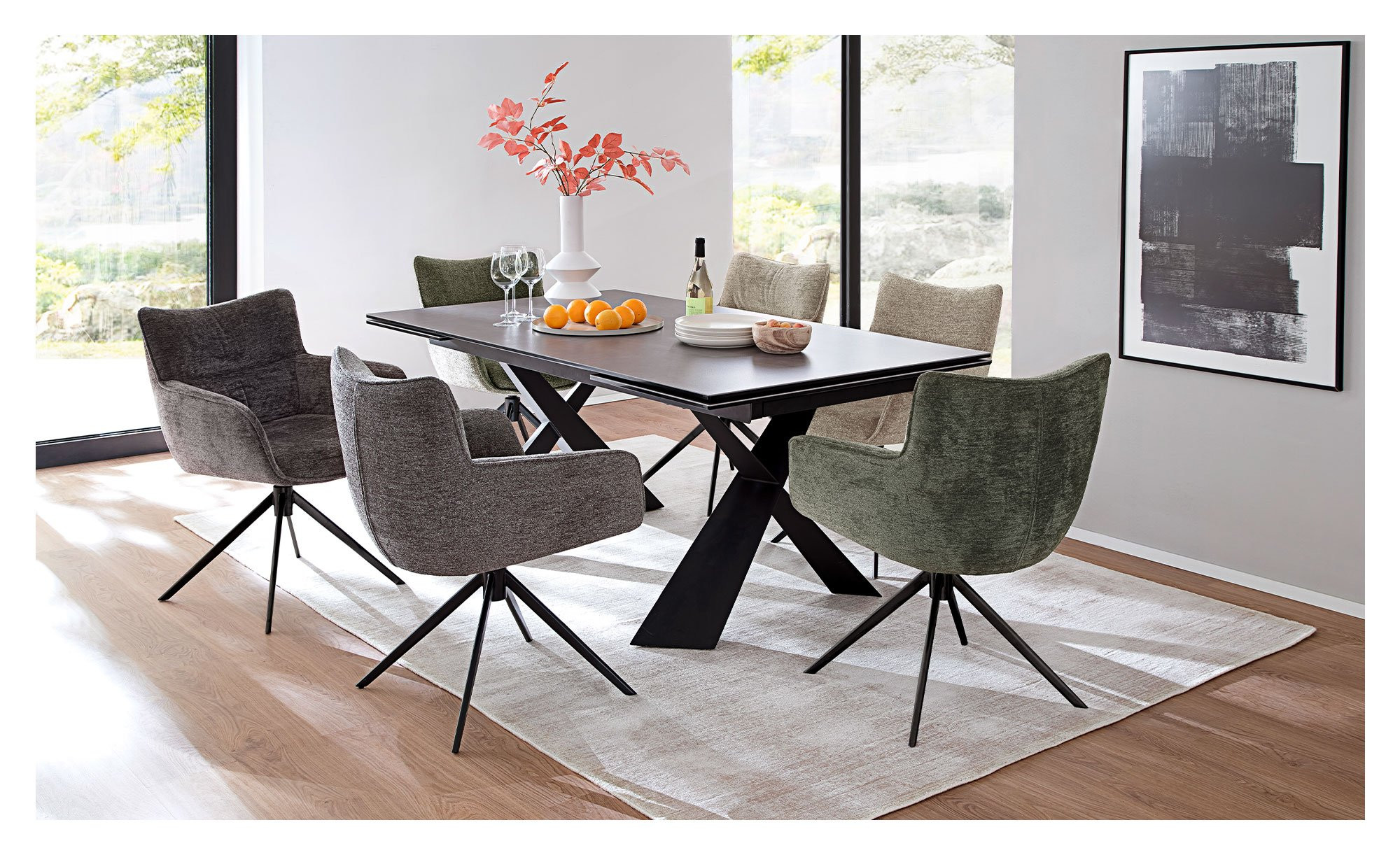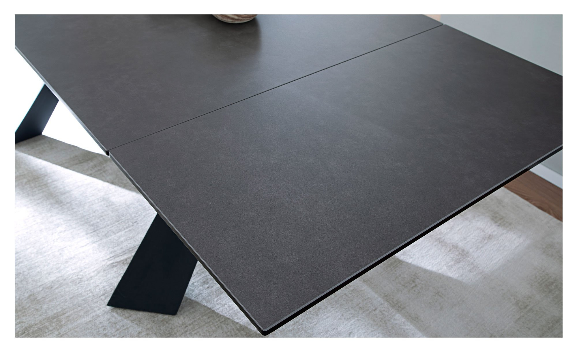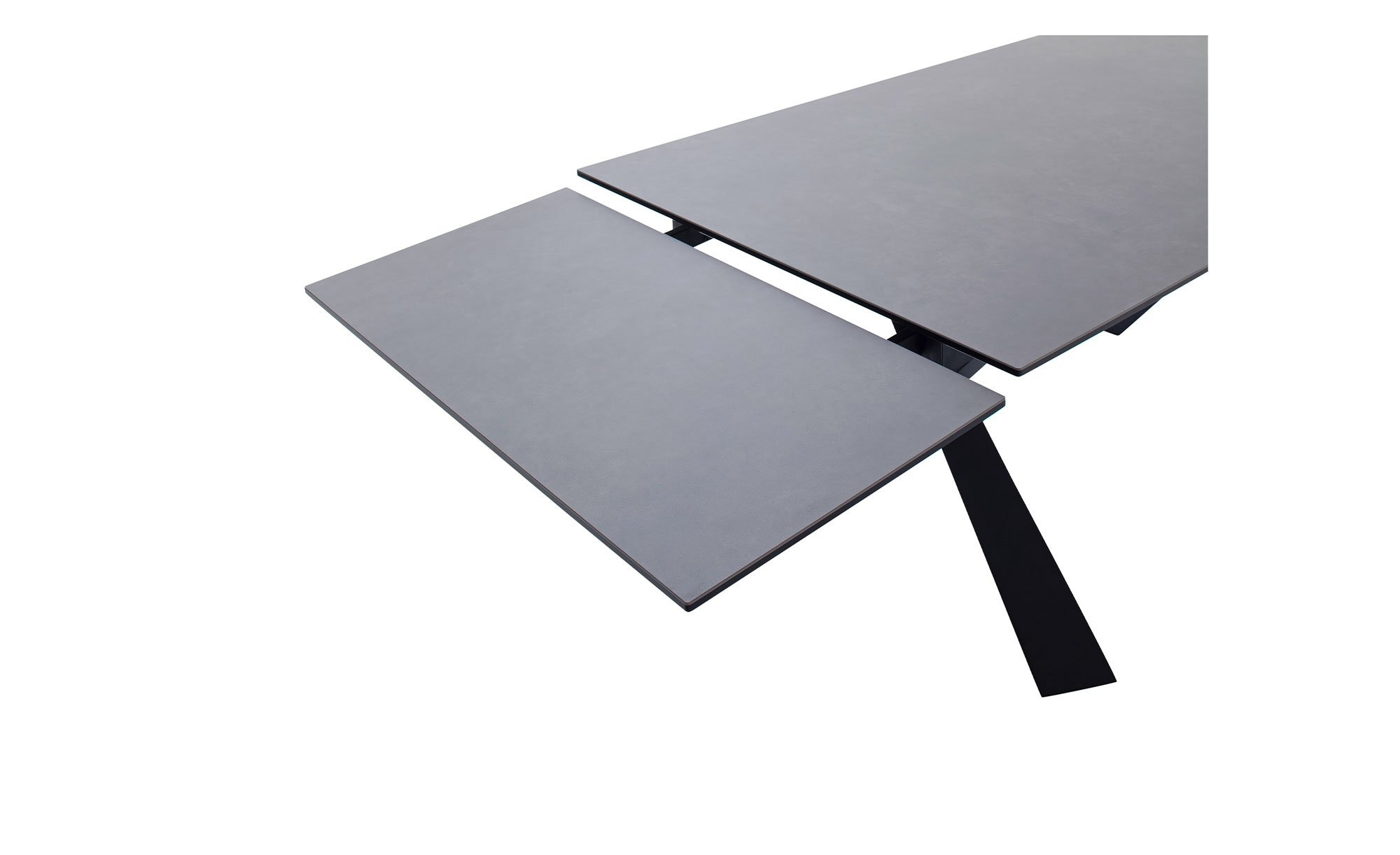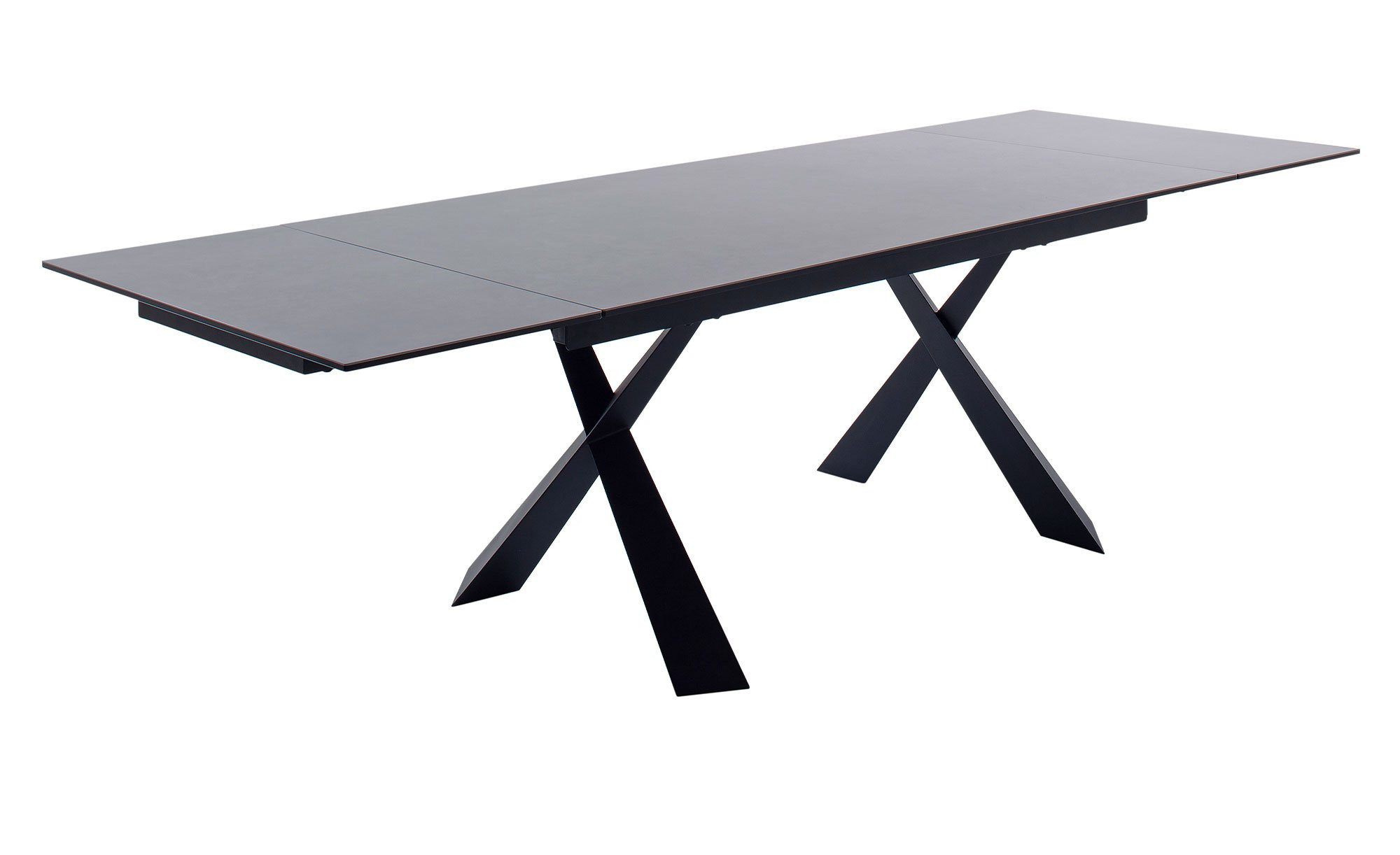 Der rechteckige Artikel ist ca. 180 x 76 x 95 cm groß und verfügt über ein schwarz lackiertes Metallgestell. Dieses trägt die ebenfalls schwarze Platte aus Keramik bzw. Sicherheitsglas. Dank eines integrierten Stirnauszugs können Sie die Tischplatte bei Bedarf jederzeit auf ca. 280 cm verlängern.