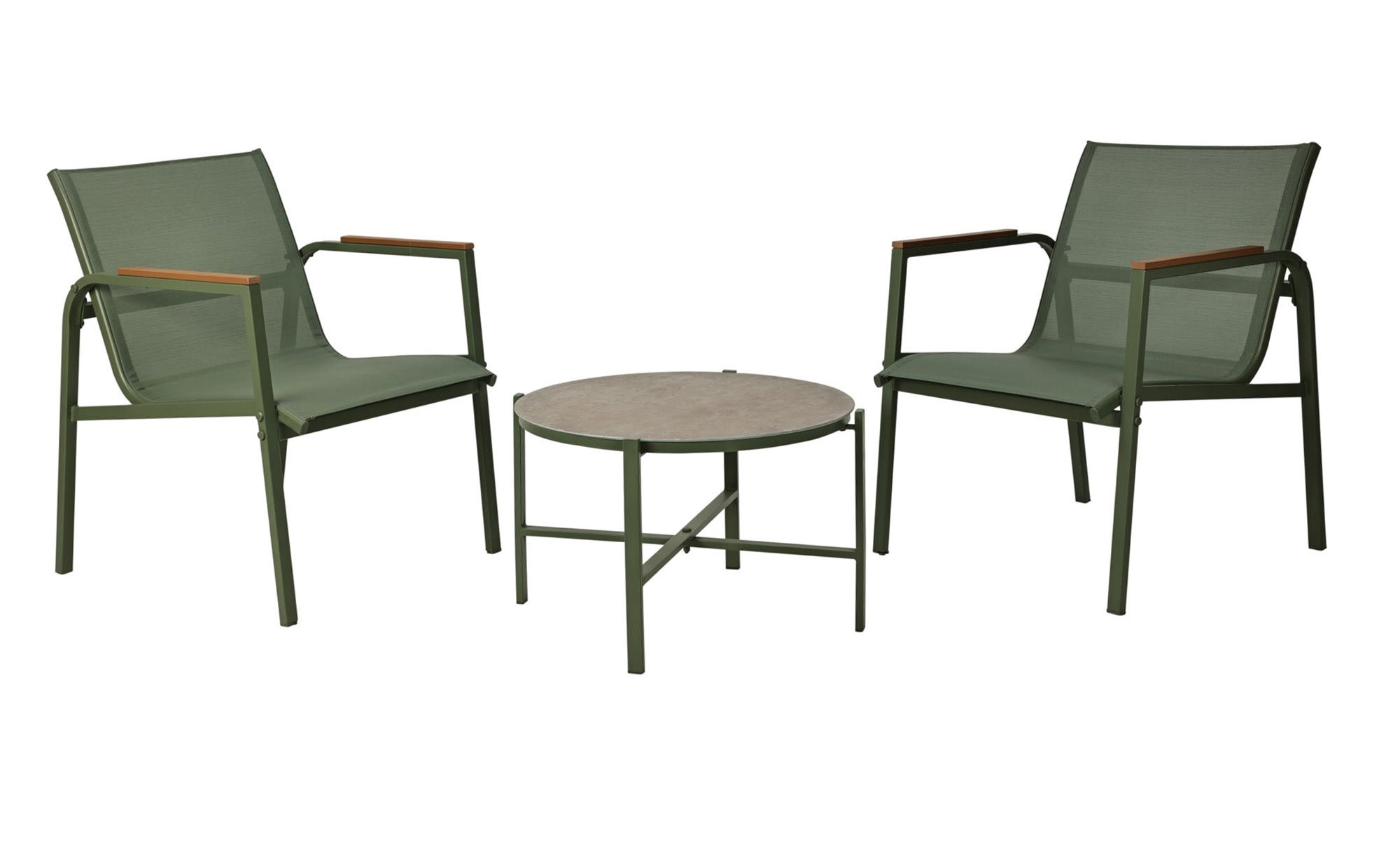 Das Balkonmöbel-Set besteht aus einem Tisch und zwei ca. 62 x 80 x 45 cm großen, passenden Stühlen. Die Möbel sind selbstverständlich vollkommen UV- und wetterbeständig. Ihr verzinkter Stahlrahmen in Grün mit vier Füßen erzeugt ein ansprechendes Flair.
