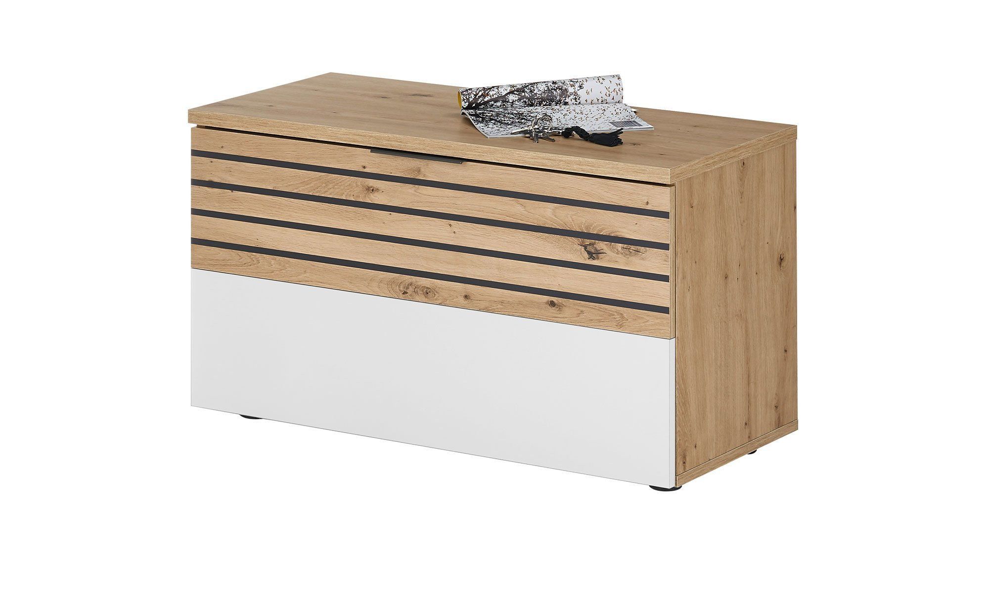 Das ca. 85 x 45 x 38 cm große Möbelstück wurde aus Holzwerkstoff gefertigt und ist an der weißen Front durch eine Melaminbeschichtung zuverlässig vor Verschleiß geschützt. Am Korpus findet sich ein naturnahes Artisan Eiche Dekor. Auch an Teilen der Vorderseite wird dieser Look aufgegriffen, hier in einer Variante mit grauen Streifen.