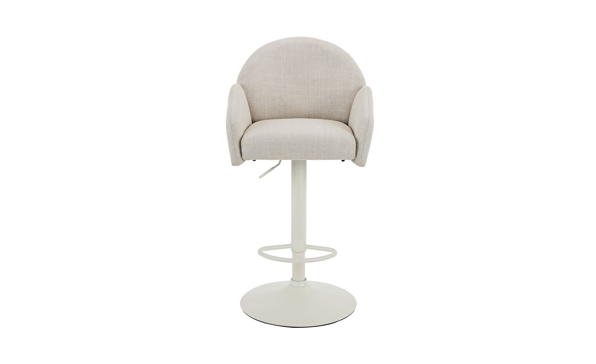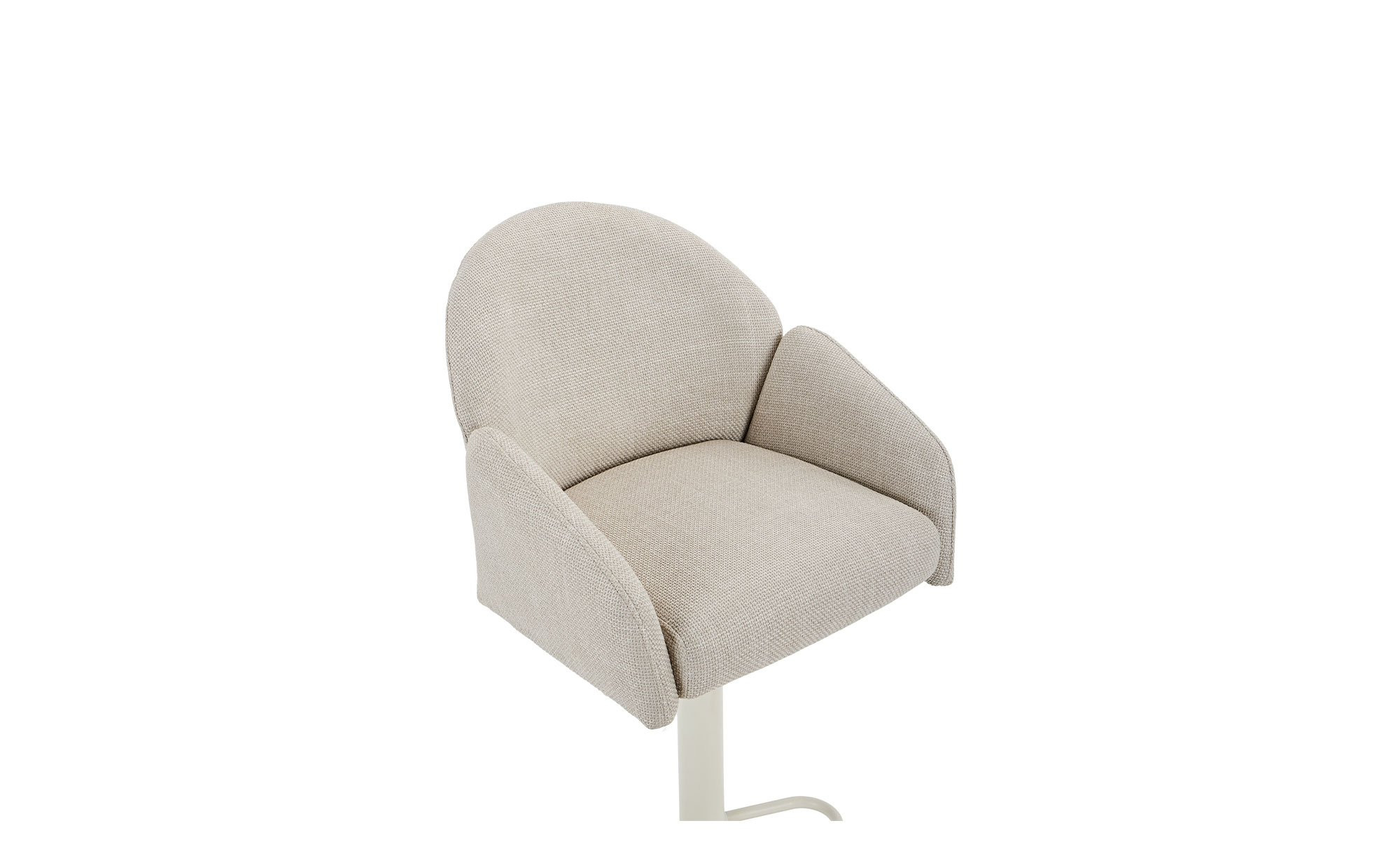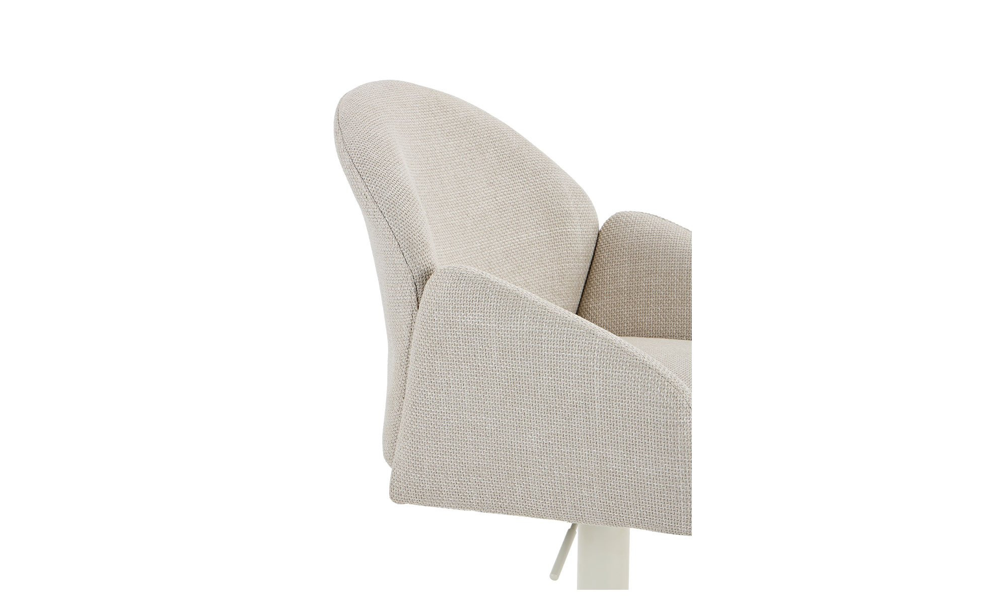 Das cremefarbige Trompetengestell aus pulverbeschichtetem Metall sorgt für sicheren Stand und trägt den Sitzbereich zuverlässig. Der Sitz ist mit einem beigen Mikrofaser-Webstoff aus 100 % Polyester bezogen und harmoniert stilvoll mit dem Gestell.