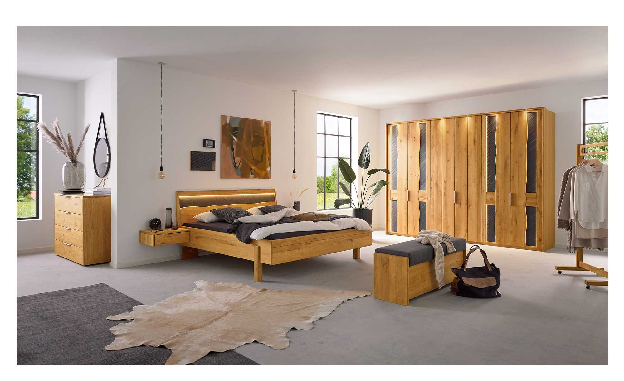 Das ca. 186 x 97 x 214 cm große Bett besteht aus robuster, massiver Wildeiche, die naturbelassen und mit einer geölten Oberfläche versehen ist. Ein besonderer Hingucker ist die Akzentfläche aus Naturschiefer am Kopfteil, die dem Artikel eine einzigartige Optik verleiht.