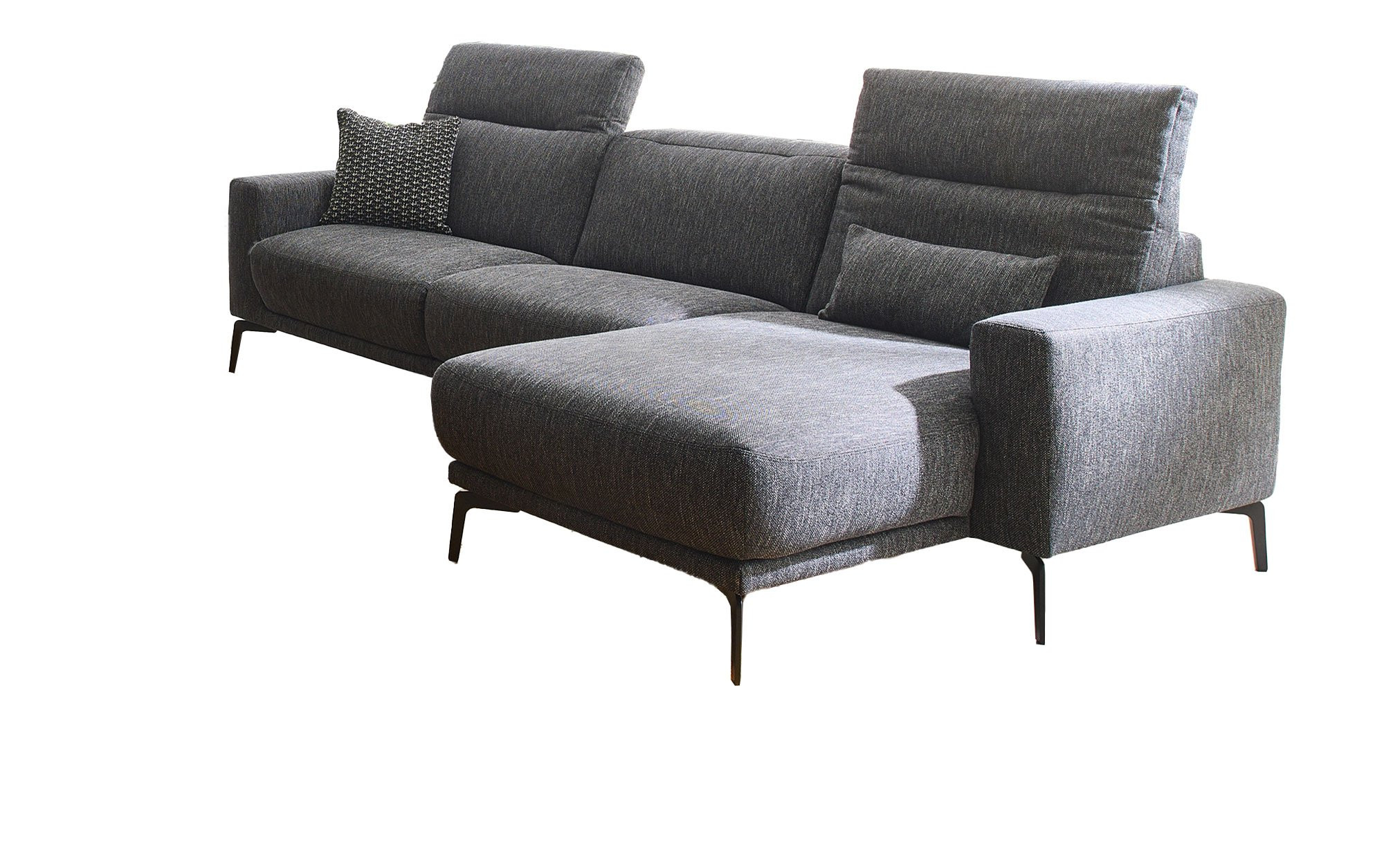 Mit seinem Graphite-farbigen Stoffbezug macht das rechtsseitig ausgerichtete Möbelstück einen hochwertigen Eindruck. Da auch der Rücken echt bezogen ist, eröffnen sich Ihnen zudem diverse Stellmöglichkeiten. Die ca. 13 cm hohen schwarzen Metallfüße fügen sich ideal ins Bild.