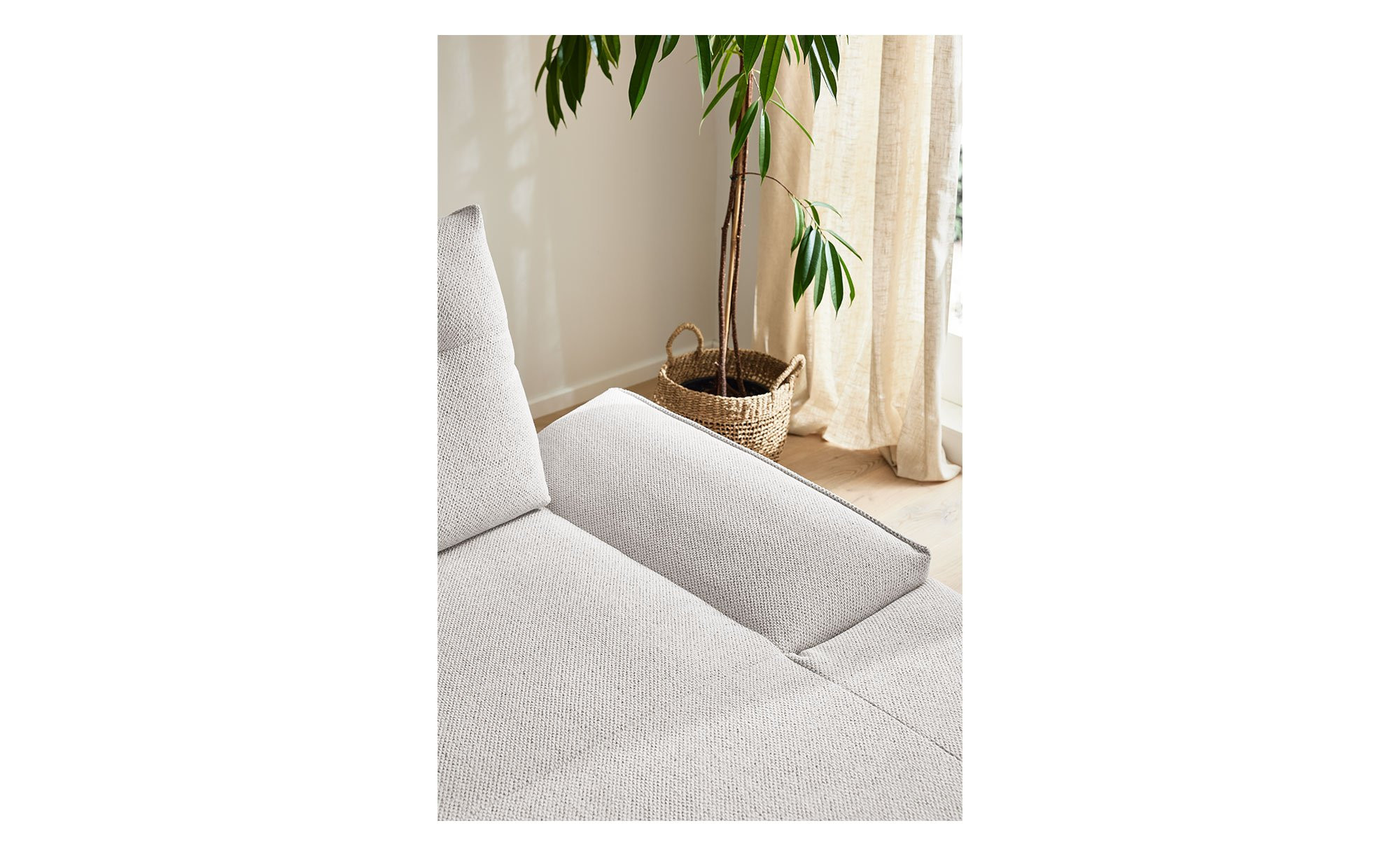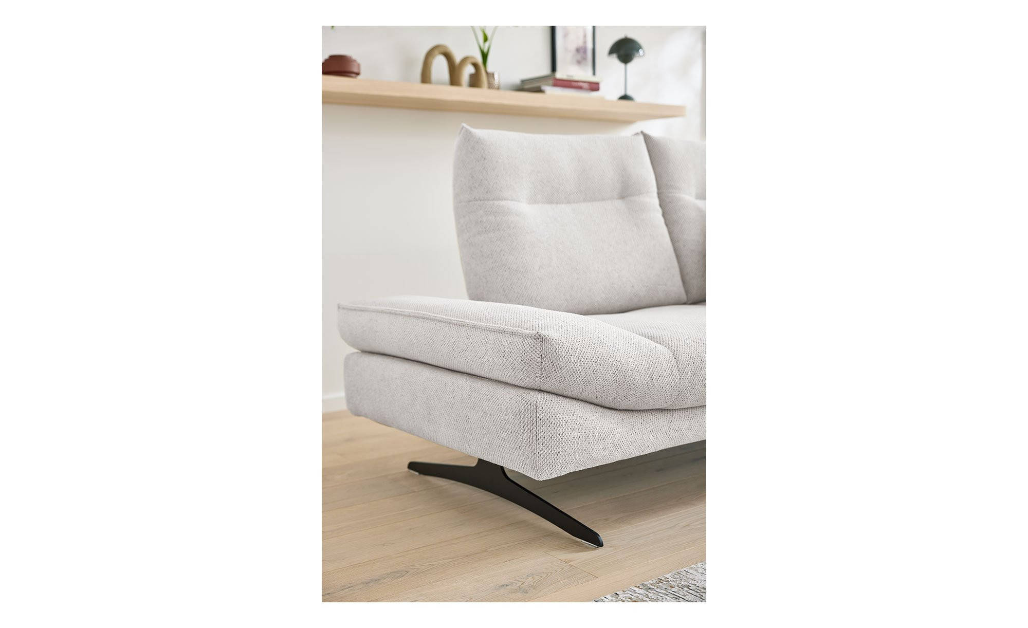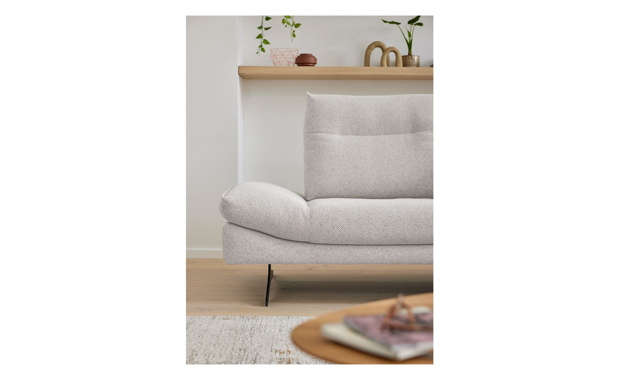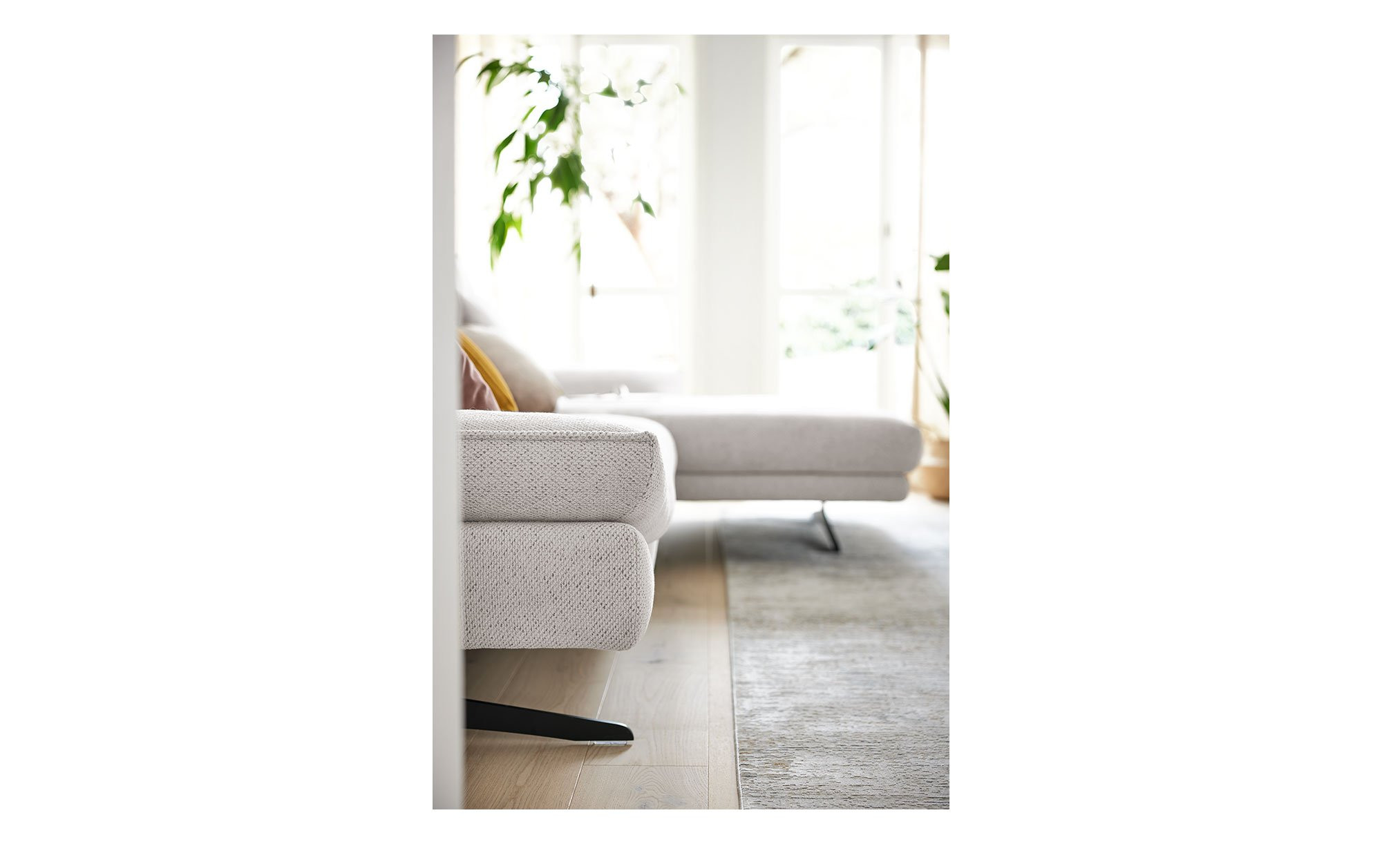 Das linksseitig ausgerichtete Sofa ist mit einem Stoff im Farbton Ivory bezogen, der sich nicht nur angenehm anfühlt, sondern auch den Rücken des Möbels einschließt. Dadurch lässt es sich flexibel im Raum platzieren. Besonders elegant wirken zudem die ca. 19 cm hohen Metallkufen in mattem Schwarz.