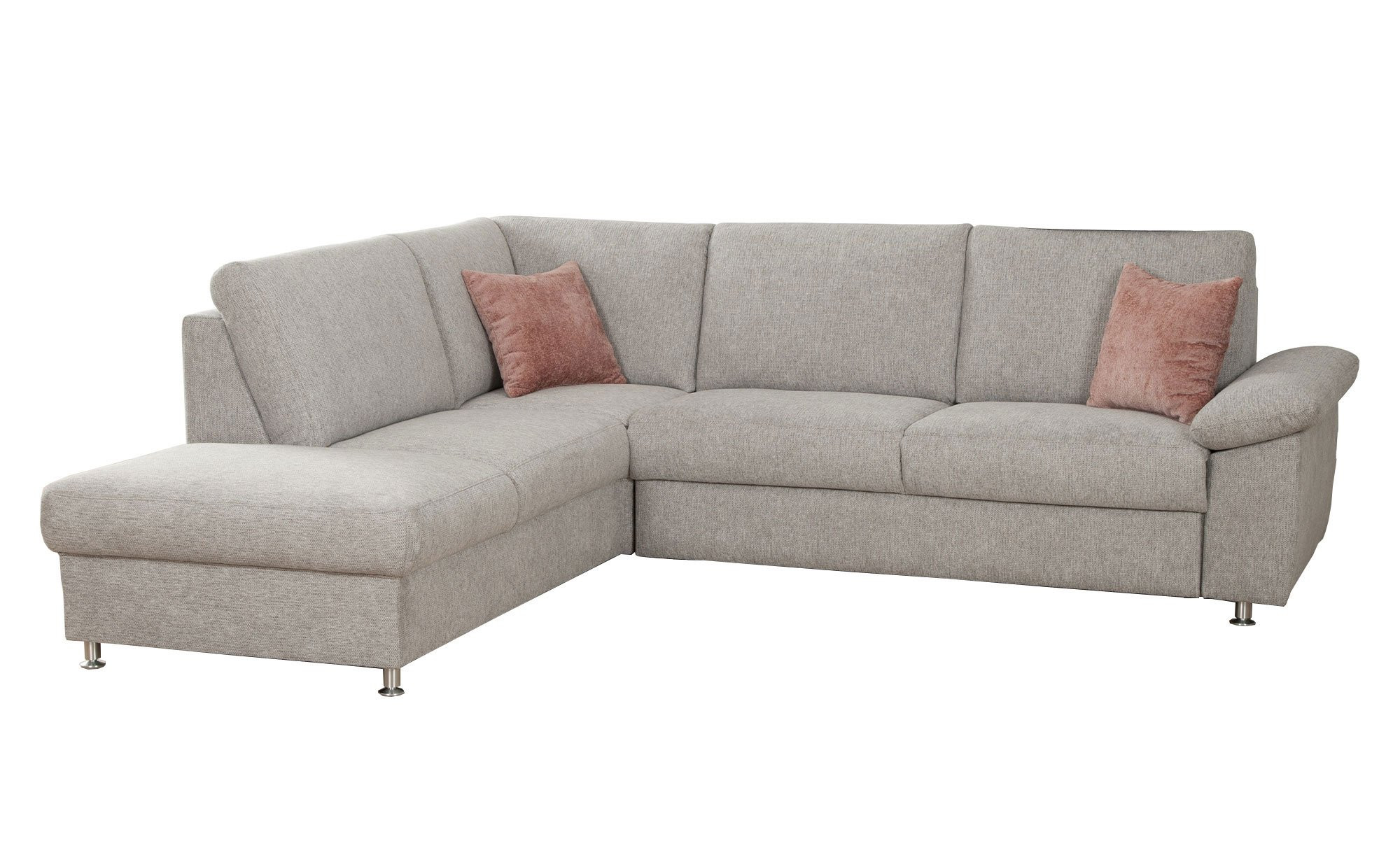 Inklusive Rücken mit einem hellgrauen Stoffbezug aus 100 % Polyester versehen, lässt sich das Möbelstück überall im Raum platzieren. Es ist linksseitig ausgerichtet und verfügt über ca. 7,5 cm hohe Metallfüße im ansprechenden Alu-Look. Teil des Angebots sind außerdem zwei Zierkissen in Rose.