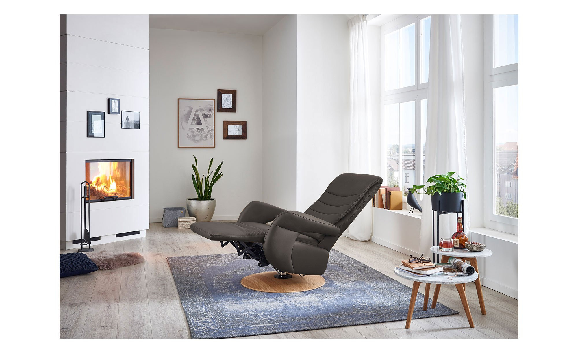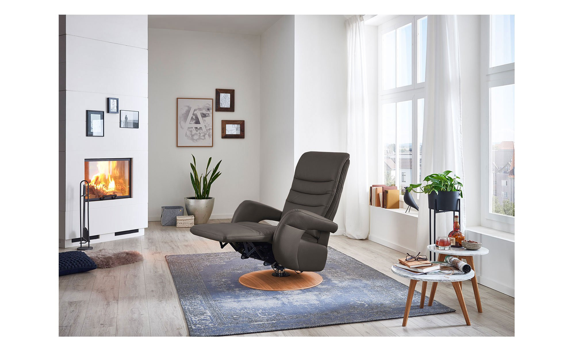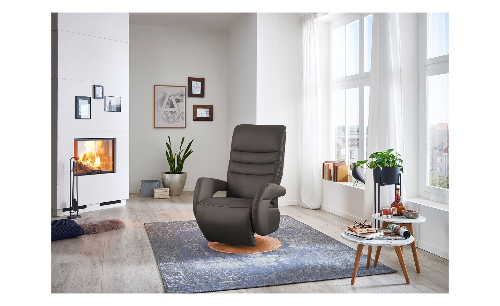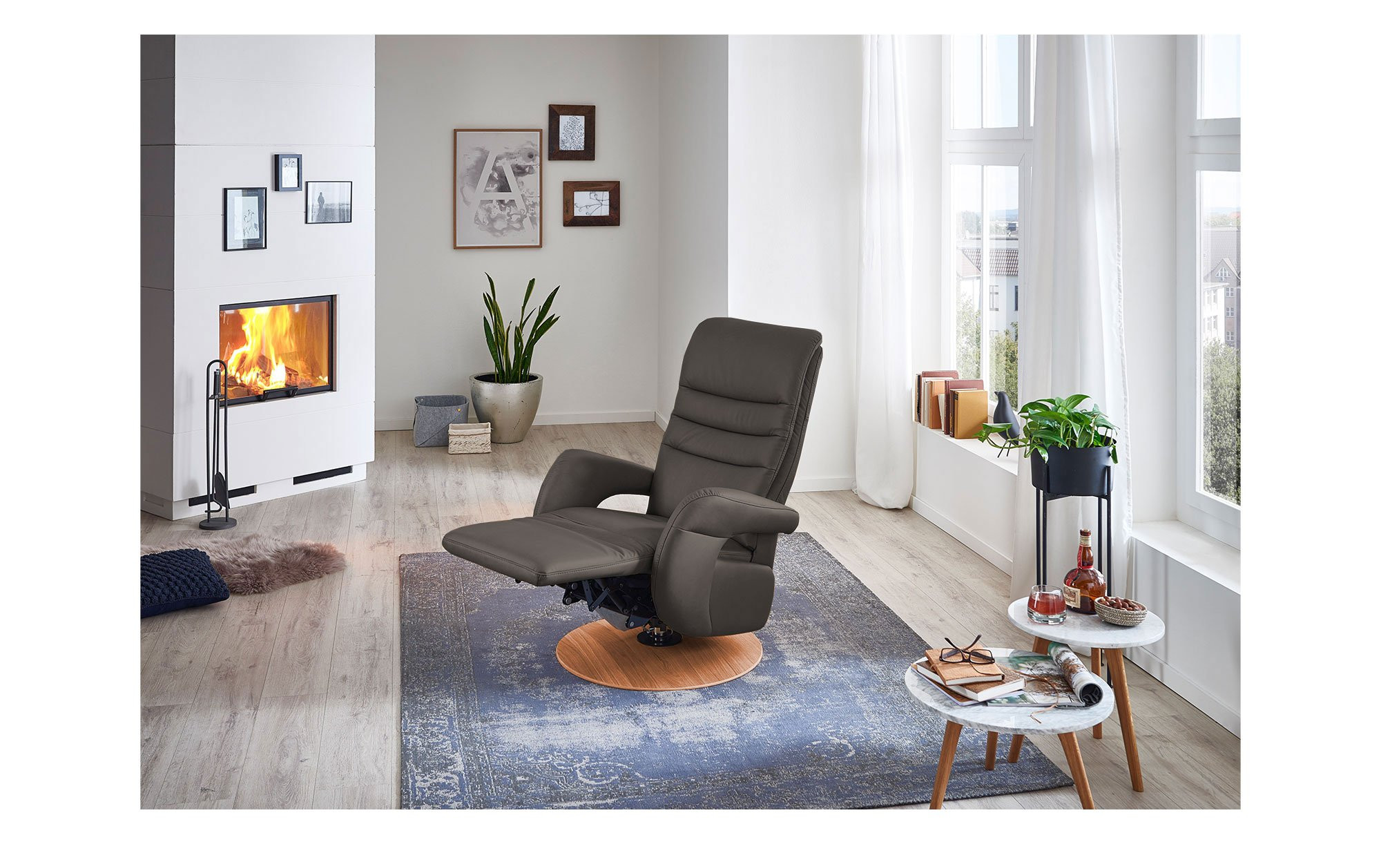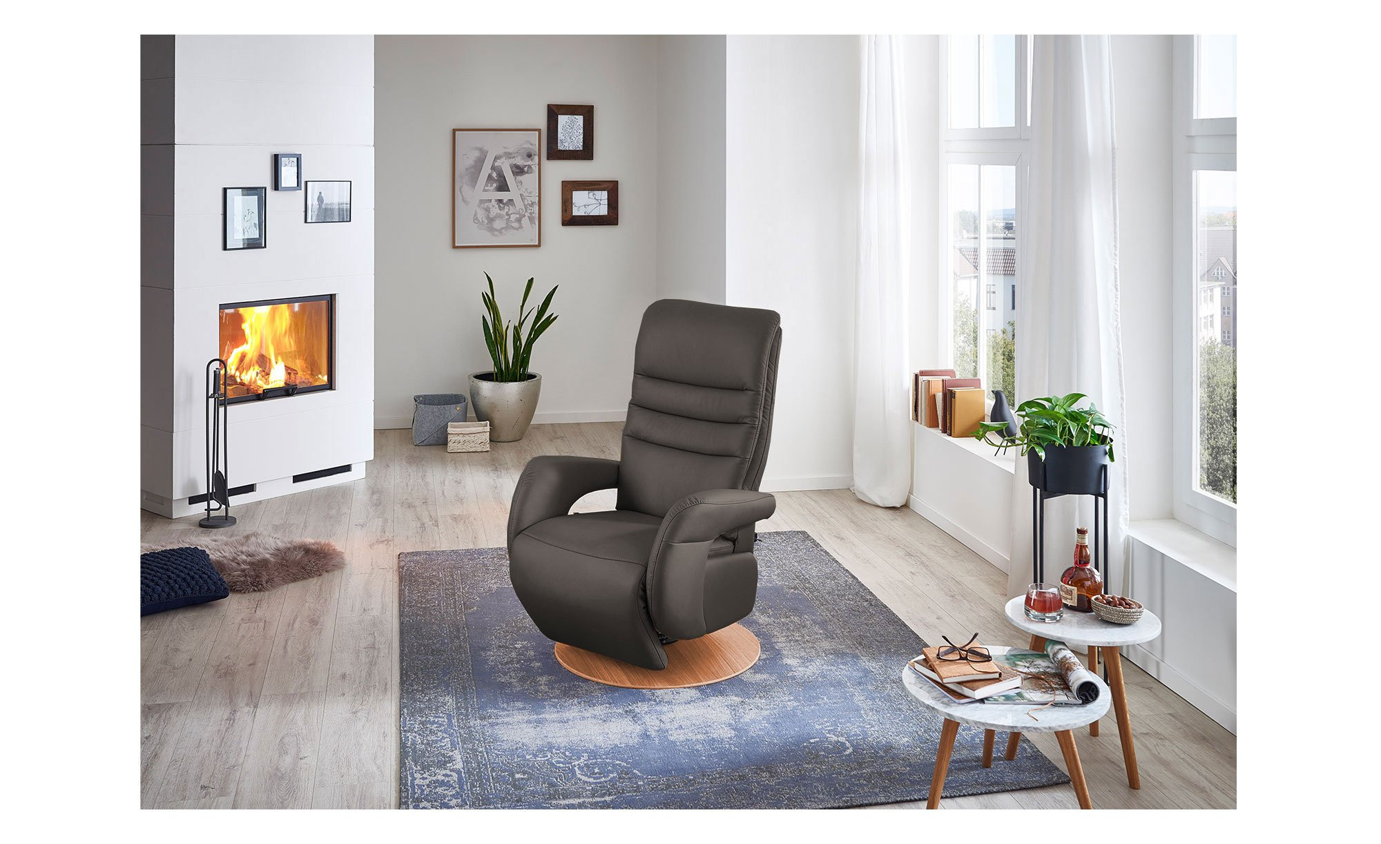 Mit seinem hochwertigen Echtlederbezug im Farbton Elephant wird das Möbelstück in Größe S1 schnell zum stilvollen Blickfang. Maße von ca. 76 x 112 x 80 cm sowie der echte Rücken ermöglichen eine freie Platzierung im Raum. Ein besonderes Detail ist der ca. 5 cm hohe Drehteller-Fuß aus echtem Buchenholz in warmer Erle-Optik.