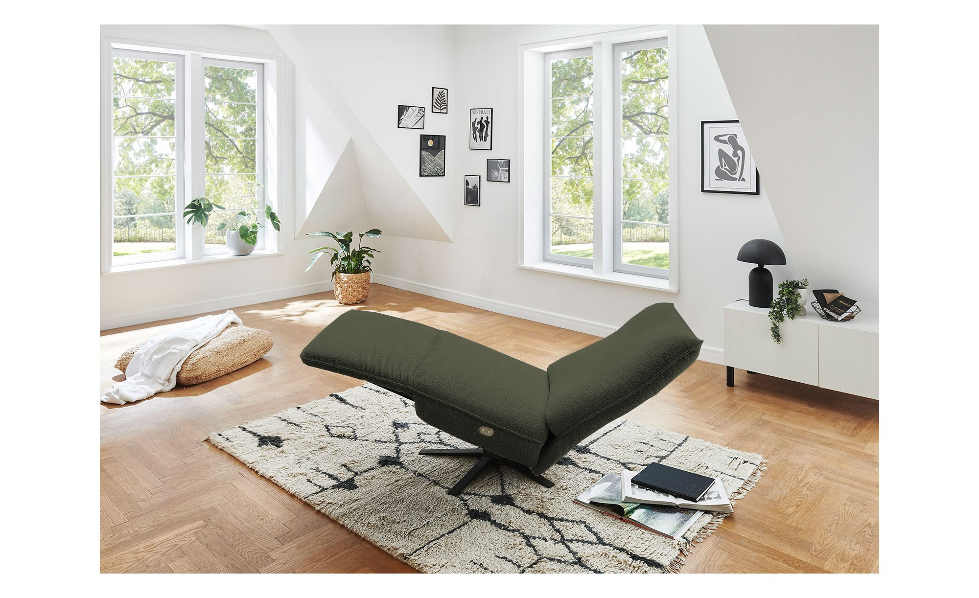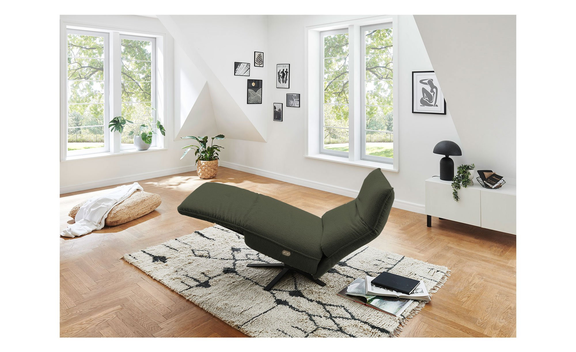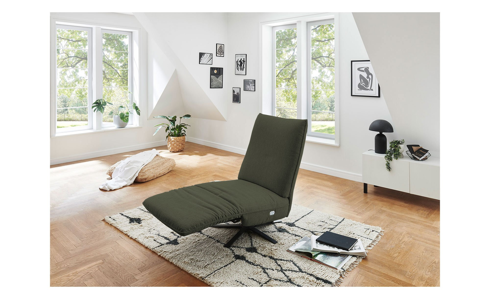 Mit ihrem Stoffbezug aus 100 % Polyester in der Farbe Khaki fügt sich die ca. 80 x 109 x 98 cm große Liege harmonisch in verschiedene Wohnkonzepte ein. Dank des bezogenen Rückens lässt sie sich flexibel im Raum platzieren. Schwarz matte Metallfüße runden das Design ab und sorgen für stabilen Halt.