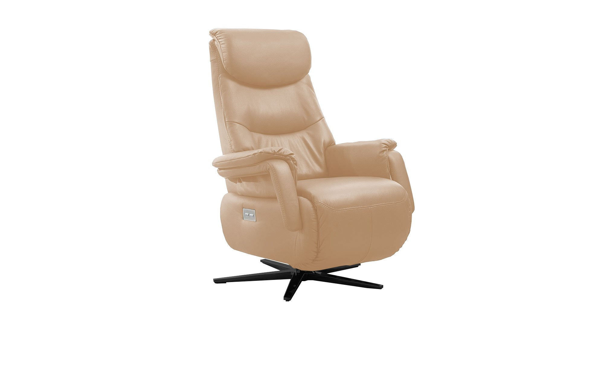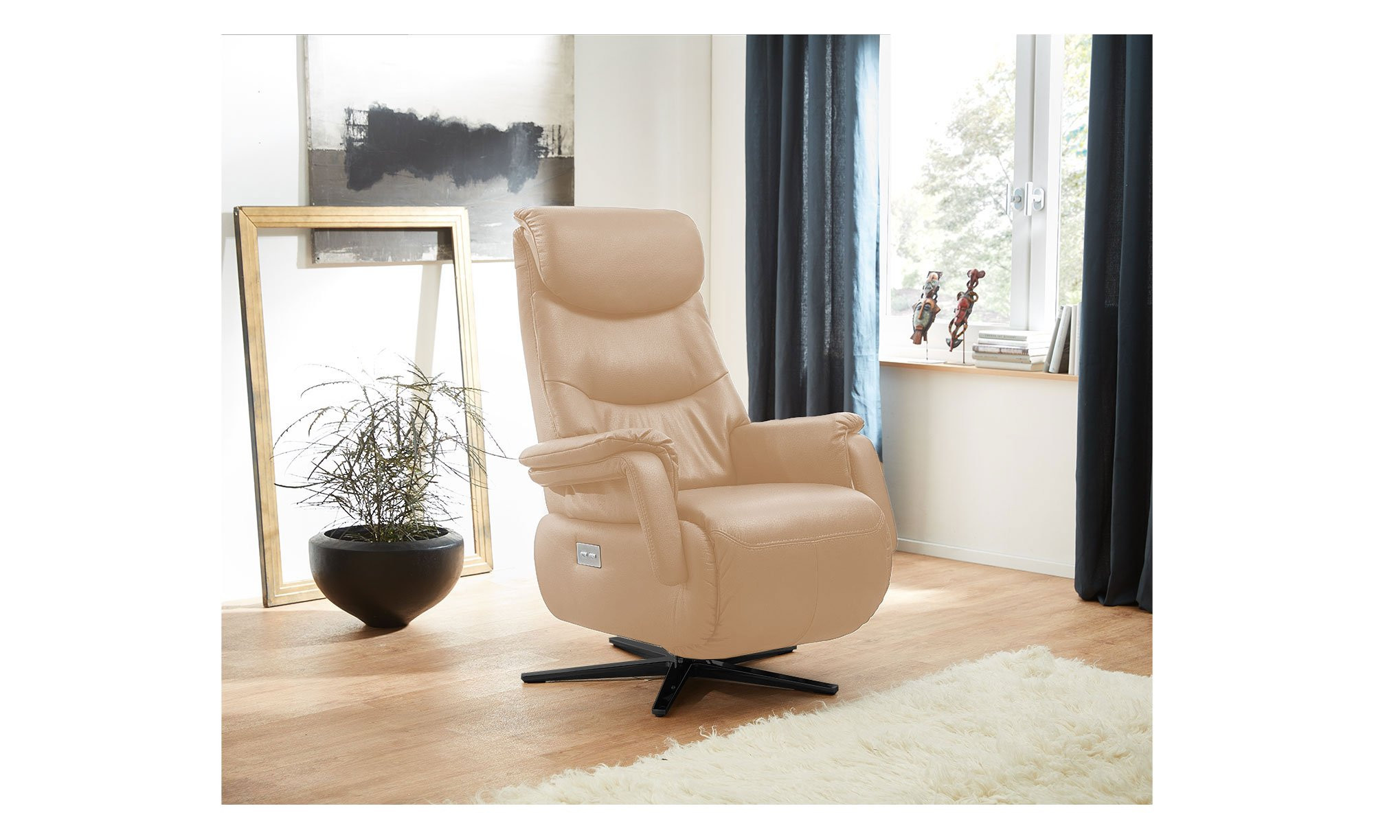 Der ca. 86 x 119 x 92 cm große Sessel ist rundum mit einem Echtlederbezug aus Longlife Leder im Farbton Champagner ausgestattet und wirkt dadurch besonders hochwertig. Da auch der Rücken echt bezogen ist, kann das Möbel frei im Raum platziert werden. Ein edler Metallfuß in Black matt rundet das Design stilvoll ab.