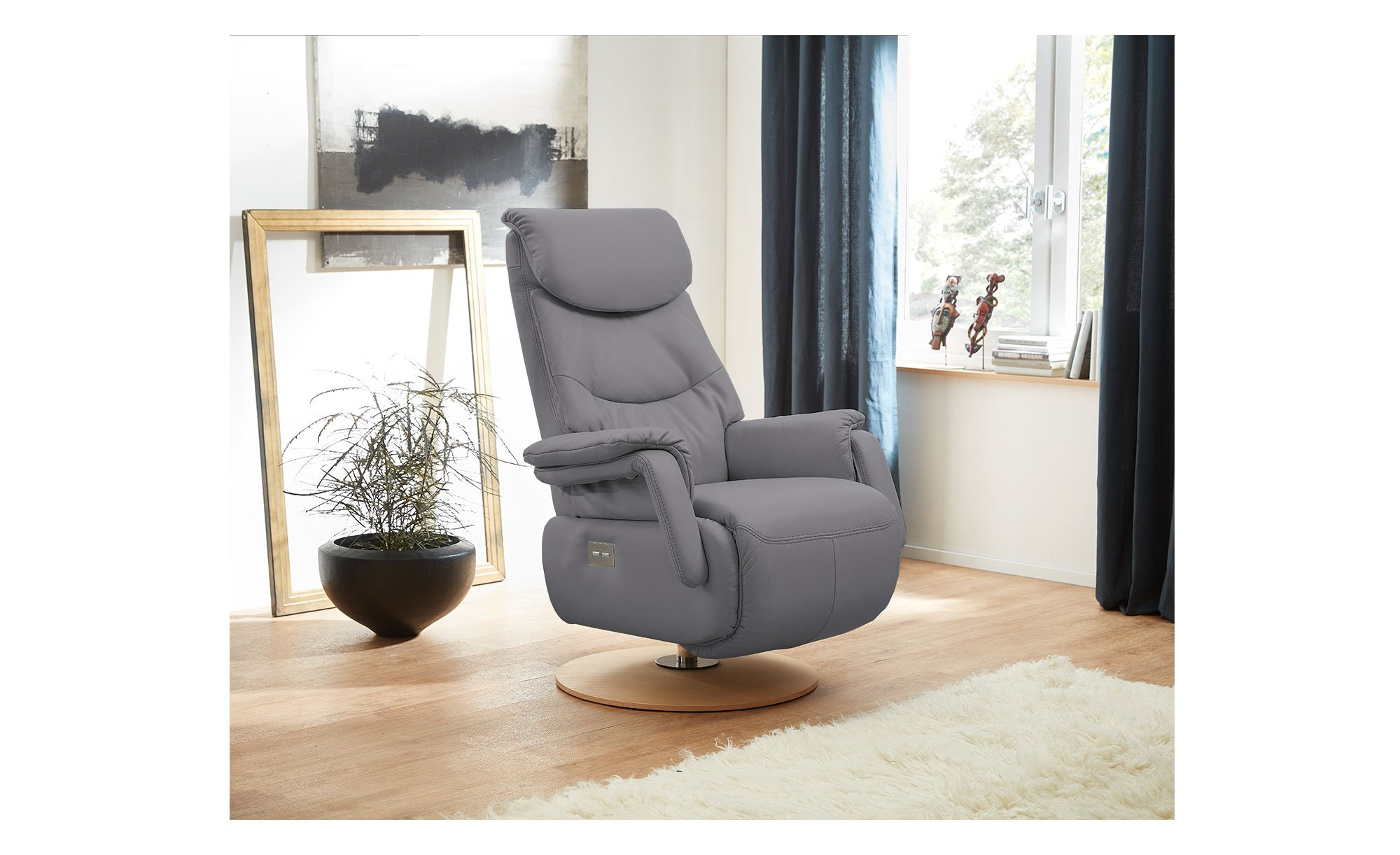 Mit seinen Maßen von ca. 82 x 103 x 88 cm ist der Sessel kompakt und gemütlich zugleich. Er wurde komplett mit Longlife Echtleder in der Farbe Grau bezogen, was auf Wunsch eine freie Platzierung im Raum ermöglicht. Der Fuß aus Massivholz im Dekor Eiche hell setzt dabei einen eleganten Akzent.