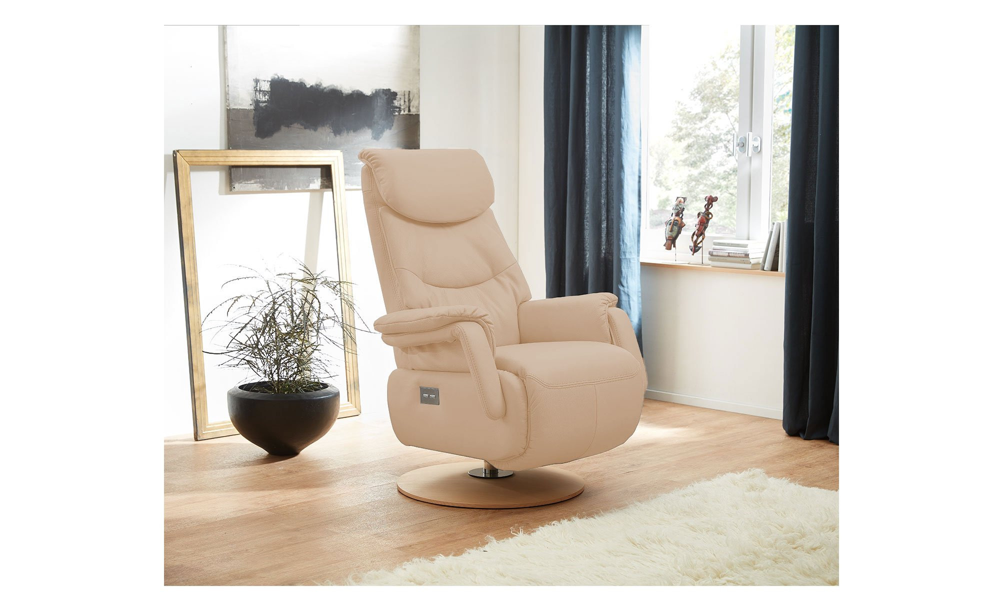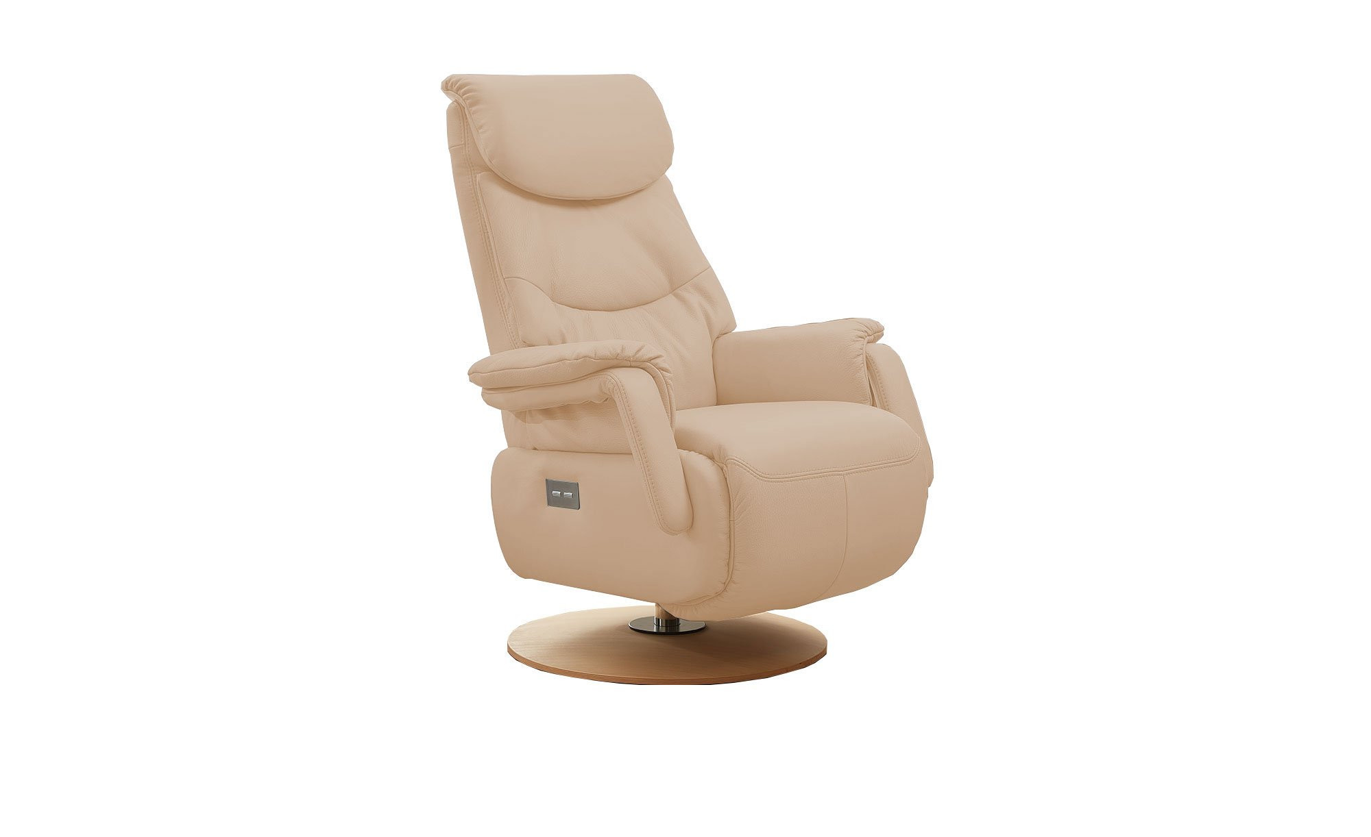 Mit seinen Maßen von ca. 82 x 103 x 88 cm ist der Sessel kompakt und gemütlich zugleich. Er wurde komplett mit Longlife Echtleder in der Farbe Champagner bezogen, was auf Wunsch eine freie Platzierung im Raum ermöglicht. Der Fuß aus Massivholz im Dekor Eiche hell setzt dabei einen eleganten Akzent.