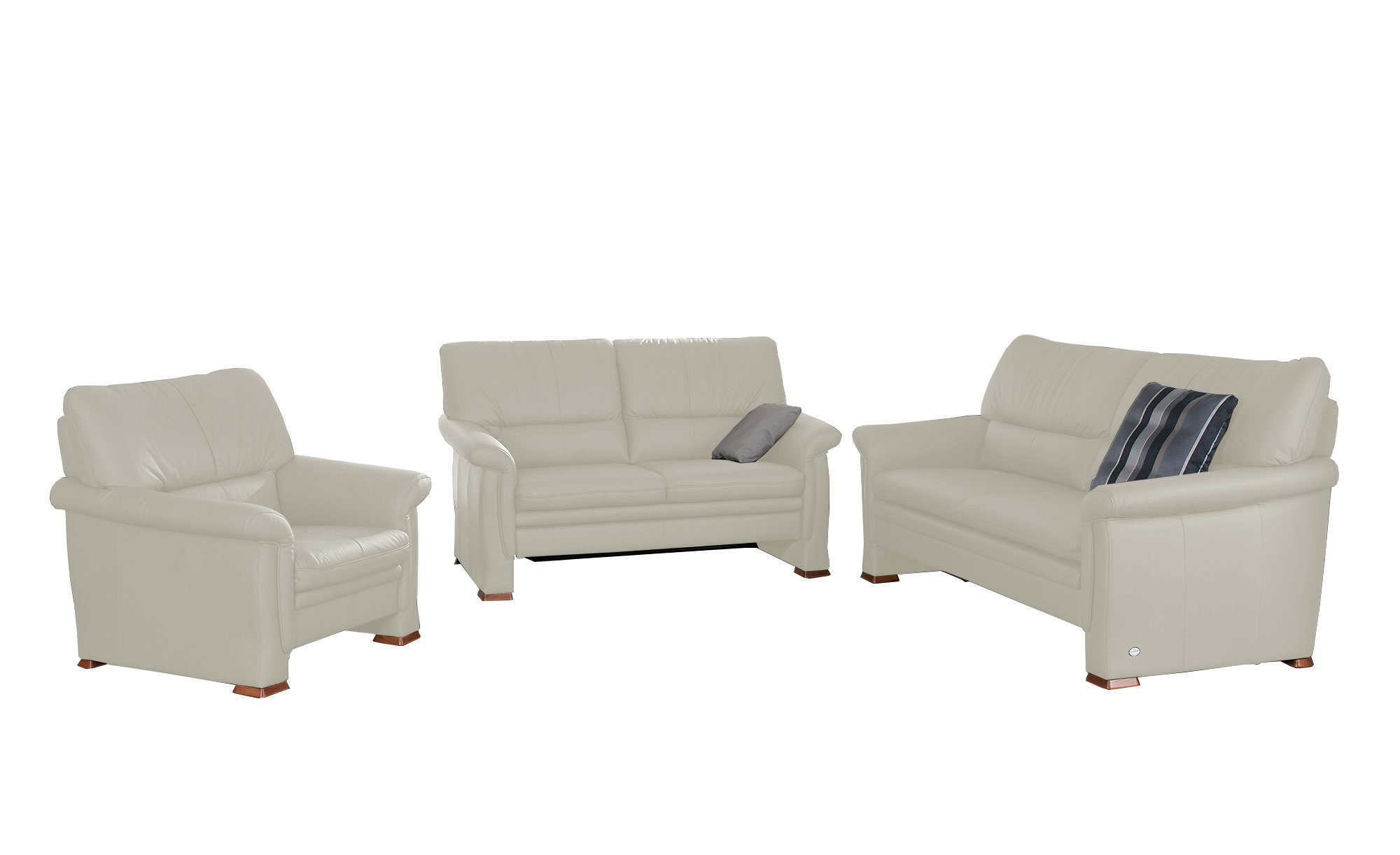 Alle Möbel sind komplett, also inklusive der Rückenspannteile, mit grauem Echtleder bezogen. Für einen natürlichen Akzent sorgen Füße aus Massivholz im Kernbuche-Look mit geölten Oberflächen.