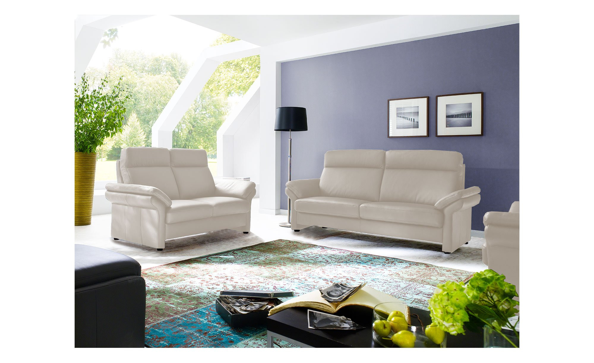 Die Möbel sind mit einem Dickleder-Bezug in der Farbe Pearl versehen und verfügen über schwarze Füße. Die Rücken haben eine angenehme Höhe von ca. 103 cm, außerdem erwartet Sie im Sitz jeweils eine hochwertige Schaumpolsterung. Unterstützt wird diese zusätzlich von der Wellenunterfederung der Unterkonstruktion.