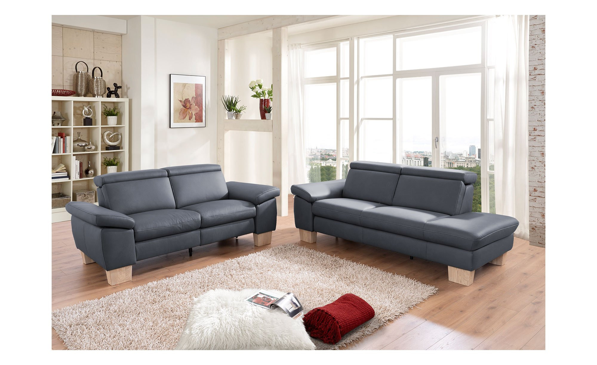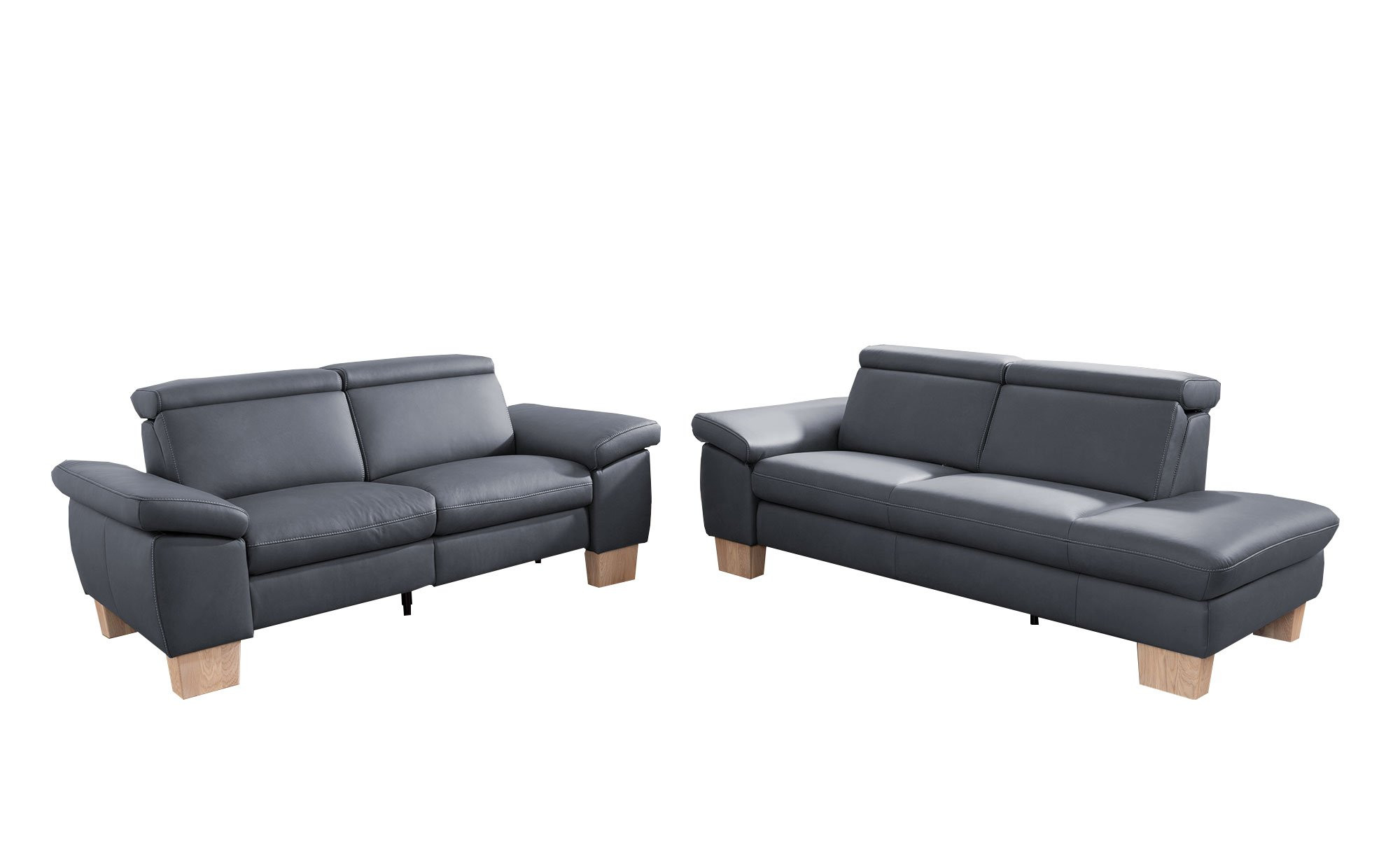 Im Angebot enthalten sind eine ca. 211 x 81 x 98 cm große Récamiere sowie ein 2,5-Sitzer mit Maßen von ca. 190 x 81 x 98 cm. Bezogen mit einem blaugrauen Stoff aus 100 % PES, machen beide Möbelstücke eine ansprechende Figur. Dazu tragen auch die Kontrastnaht in Beige und massive Holzfüße aus geölter Eiche ihren Teil bei.