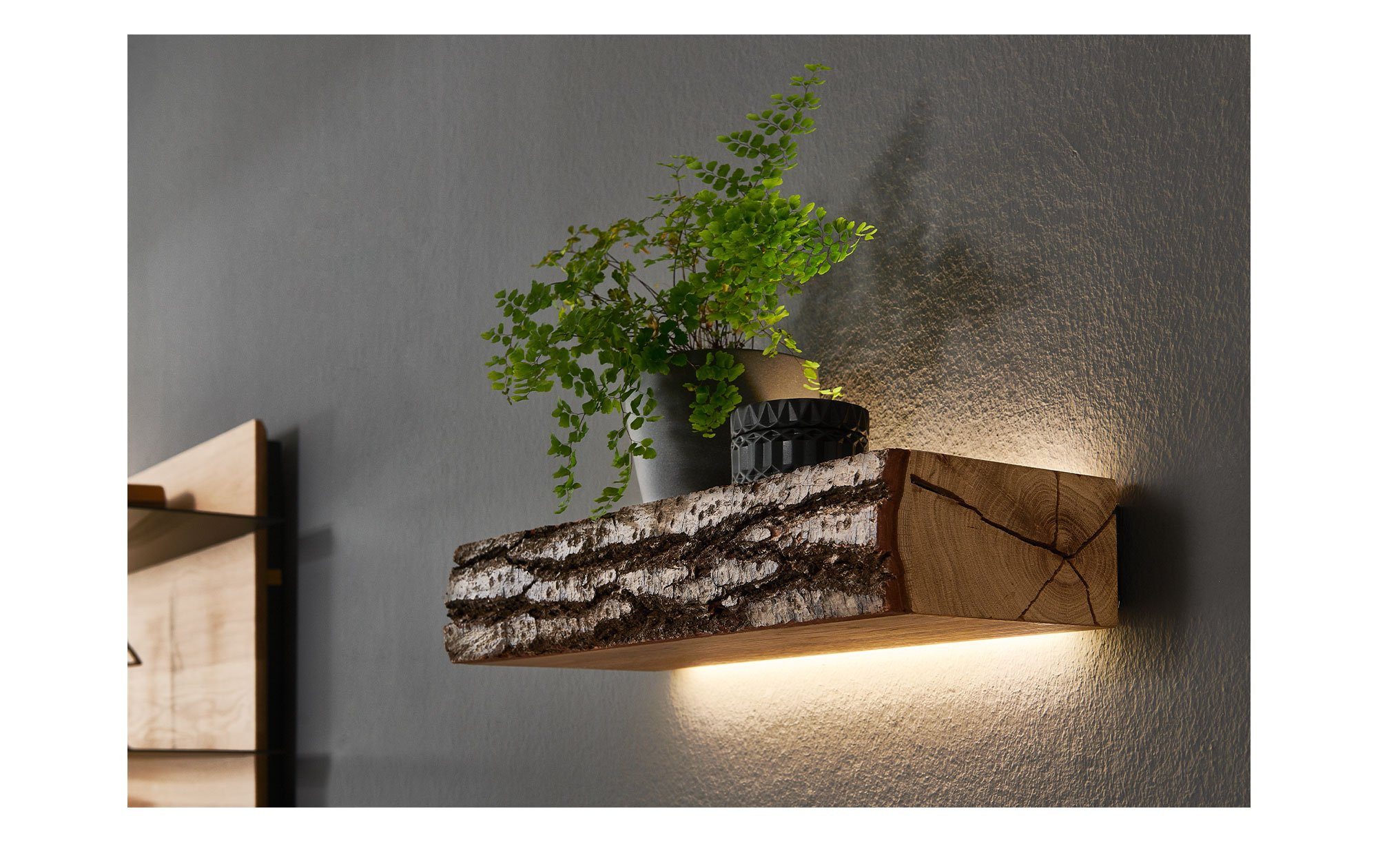 Bei dem Artikel handelt es sich um ein zugleich naturnahes und edles Wandboard. Es ist ca. 48 x 10 x 21 cm groß und wurde aus massiver Kerneiche mit gebürsteter sowie lackierter Oberfläche gefertigt. Besonders ins Auge springt die Applikation aus echter Rinde an der Front des Möbels.
