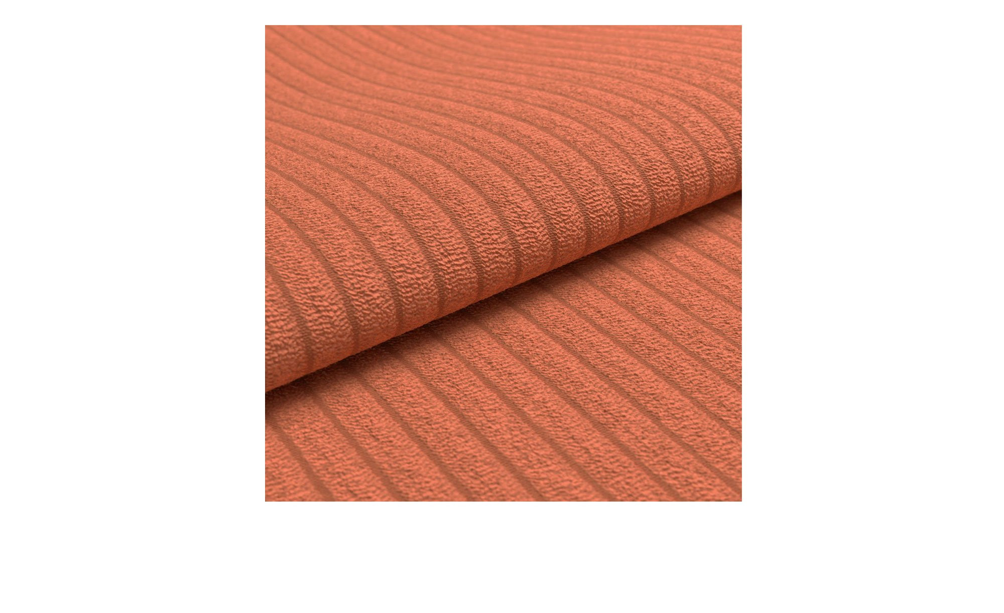 Der Bezug aus weichem Cord-Stoff im Farbton Orange umhüllt das ca. 284 x 85–105 x 180 cm große Möbelstück inklusive Rücken. Dadurch profitieren Sie von flexiblen Stellmöglichkeiten im Raum. Ca. 12 cm hohe Füße aus matt schwarzem Metall setzen einen modernen Akzent und verleihen dem Gesamtbild seine elegante Leichtigkeit.