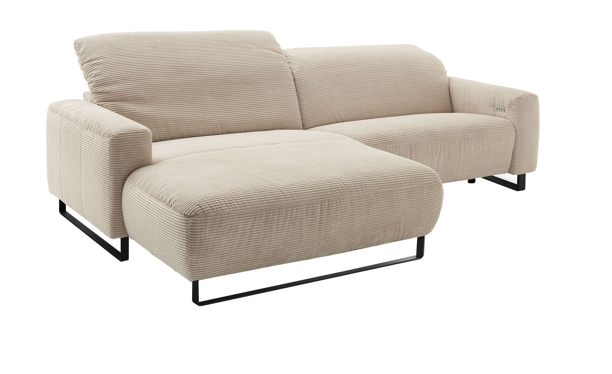 Der Bezug aus weichem Cord-Stoff im Farbton Nature umhüllt das ca. 284 x 85–105 x 180 cm große Möbelstück inklusive Rücken. Dadurch profitieren Sie von flexiblen Stellmöglichkeiten im Raum. Ca. 12 cm hohe Füße aus matt schwarzem Metall setzen einen modernen Akzent und verleihen dem Gesamtbild seine elegante Leichtigkeit.