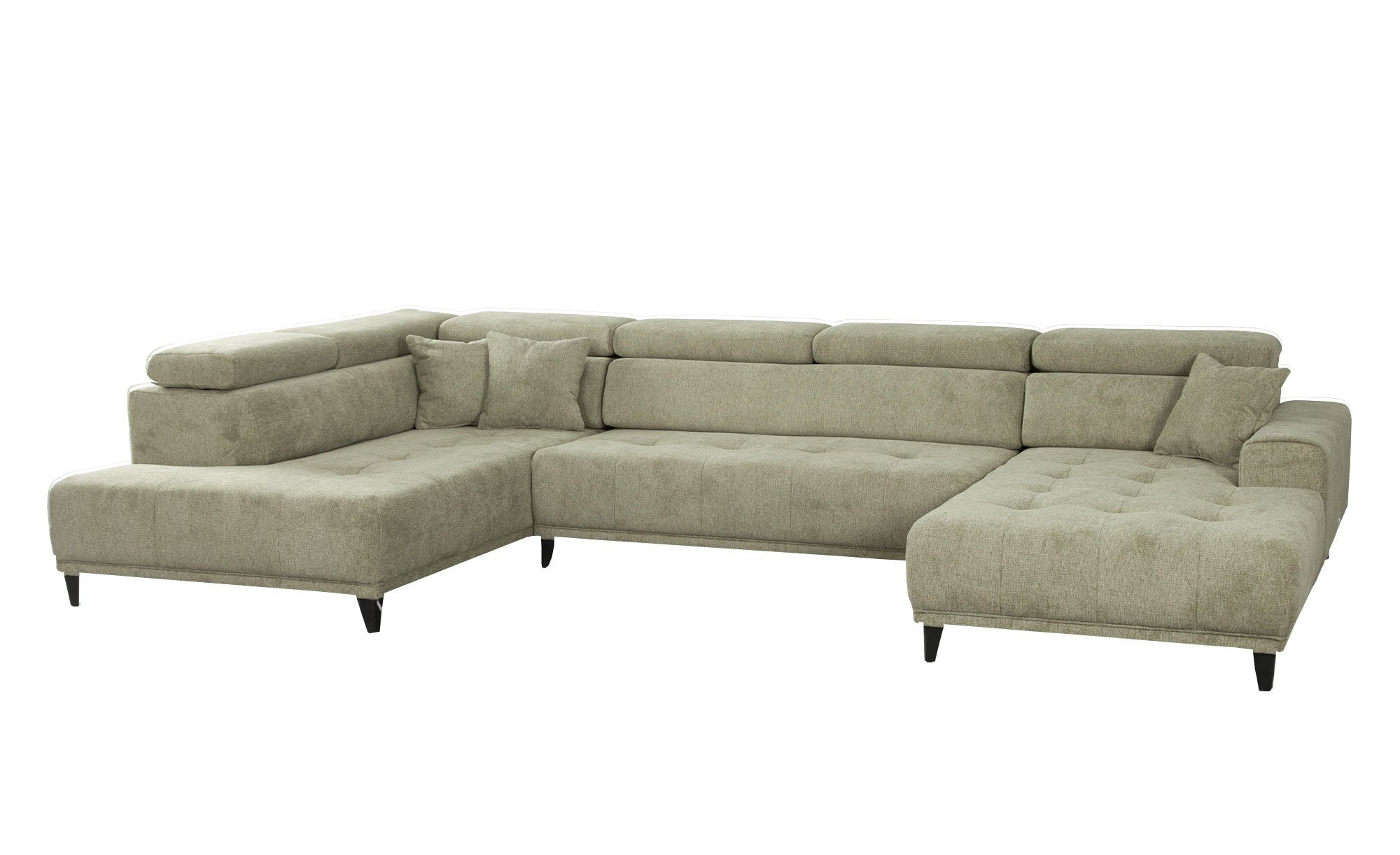 Ein grüner Stoffbezug aus 100 % Polyester umhüllt das Sofa inklusive Rücken und ermöglicht dadurch eine flexible Platzierung im Raum. Die im Lieferumfang enthaltenen Kissen sind mit einem beigen Material bezogen. Einen stilvollen Kontrast bilden die ca. 12 cm hohen Metallfüße in Schwarz.