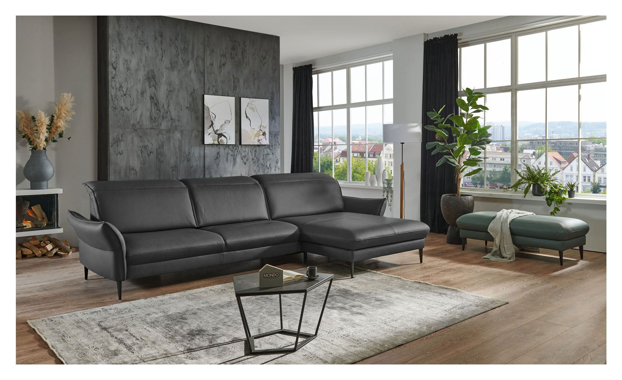 Optional können Sie die Basis-Wohnlandschaft MONDO Mirum mit Mehrpreis-Funktionen wie einer motorischen Relaxfunktion im Canapé, einer Armteilverstellung und einer motorischen Vorziehbank im 3-Sitzer ausstatten. Zudem sind Zierkissen, drei Sitzhärten und diverse Farbvarianten verfügbar.