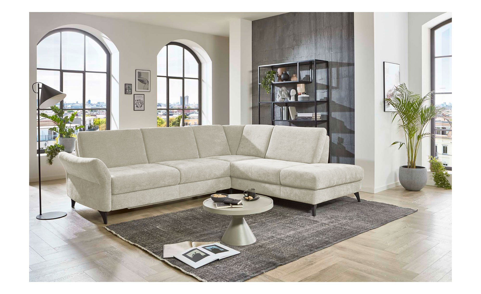 Das rechtsseitig ausgerichtete Sofa ist mit einem Chenille-Bezug aus 100 % Polyester in der Farbe Beige versehen. Da auch der Rücken vollständig mit diesem Material bezogen ist, lässt sich das Möbelstück optional sogar frei im Raum platzieren. Ein stabiles Grundgerüst aus Hartholz und Holzwerkstoffen bildet die Basis, während ca. 13 cm hohe Metallfüße in Schwarz das Gesamtbild stilvoll abrunden.