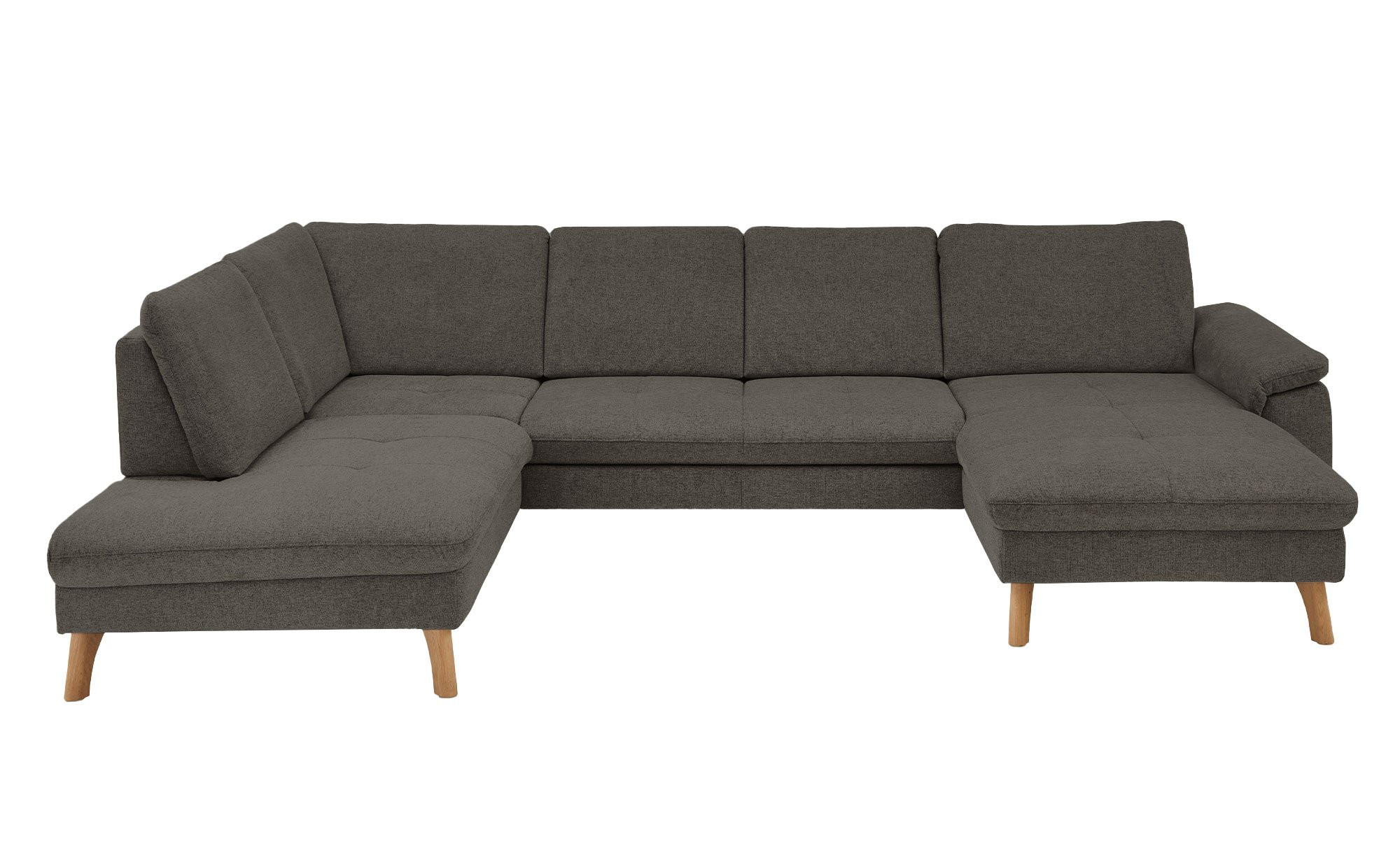Das rechtsseitig ausgerichtete Sofa verfügt inklusive Rücken über einen Stoffbezug im Farbton Anthrazit. Ca. 18 cm hohe Füße aus massiver Wildeiche unterstreichen den natürlichen Charakter des ca. 341 x 89 x 220 cm großen Möbelstücks.