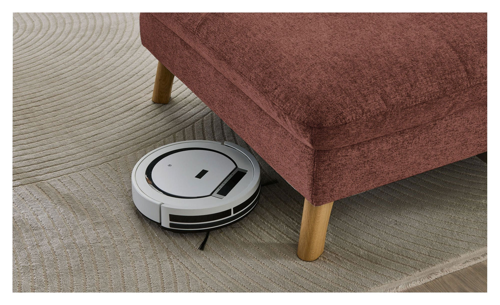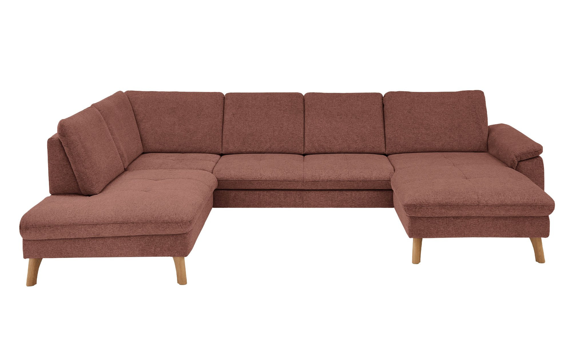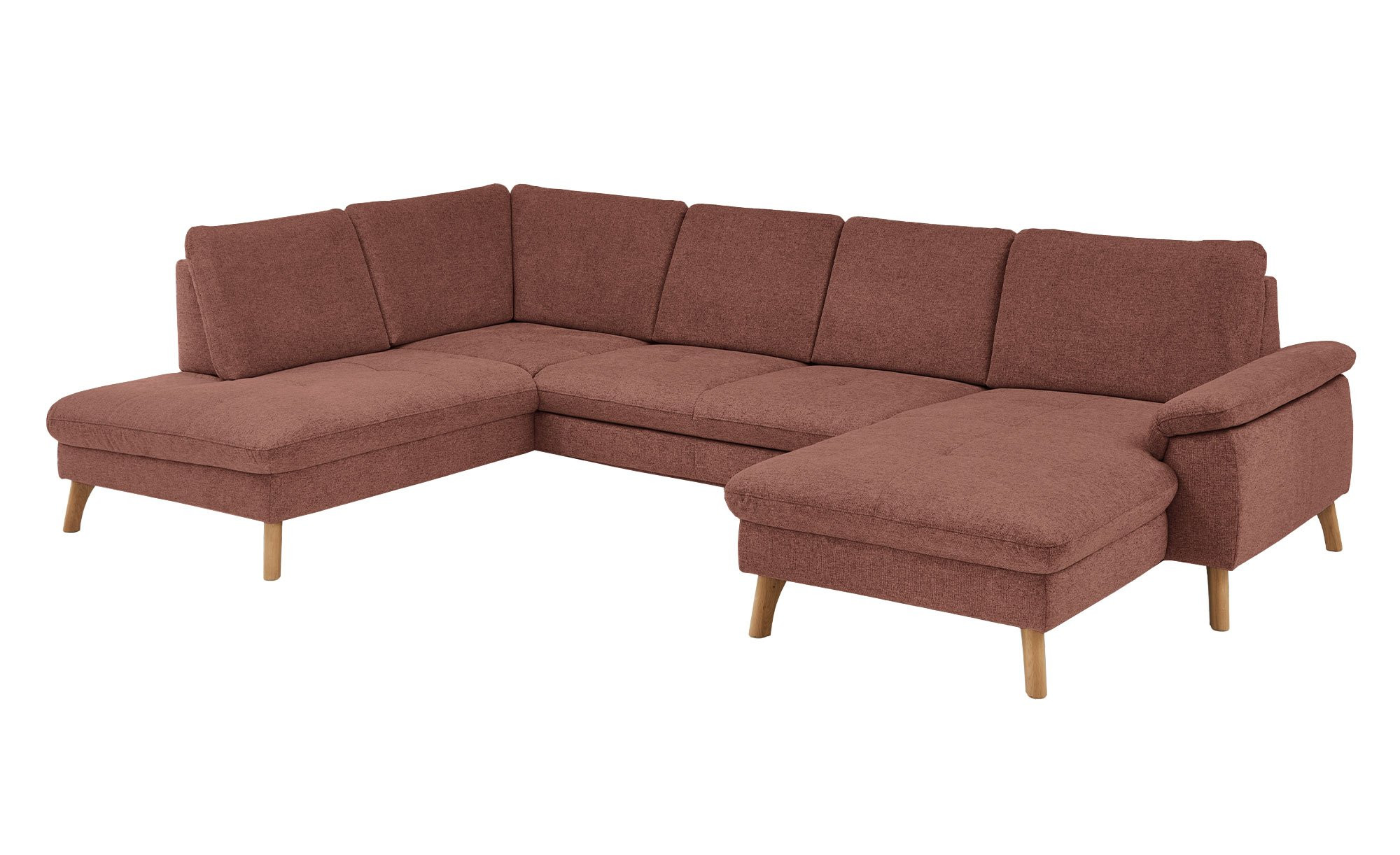 Das rechtsseitig ausgerichtete Sofa verfügt inklusive Rücken über einen Stoffbezug im Farbton Barolo. Ca. 18 cm hohe Füße aus massiver Wildeiche unterstreichen den natürlichen Charakter des ca. 341 x 89 x 220 cm großen Möbelstücks.