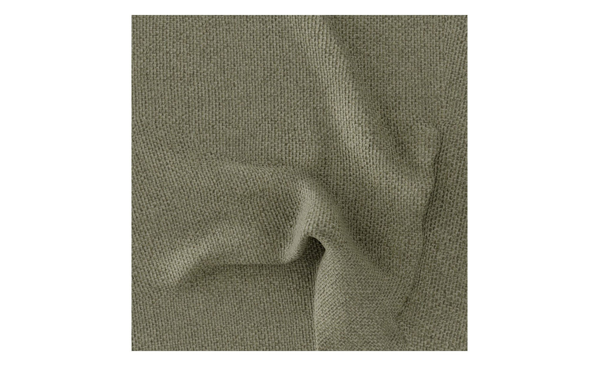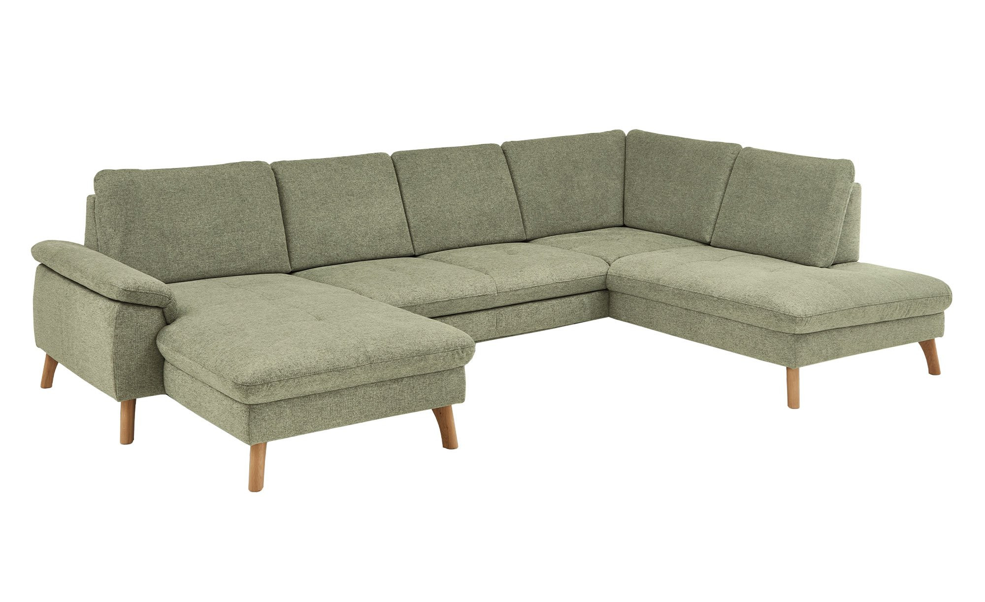 Das linksseitig ausgerichtete Sofa verfügt inklusive Rücken über einen Stoffbezug im Farbton Lind. Ca. 18 cm hohe Füße aus massiver Wildeiche unterstreichen den natürlichen Charakter des ca. 341 x 89 x 220 cm großen Möbelstücks.