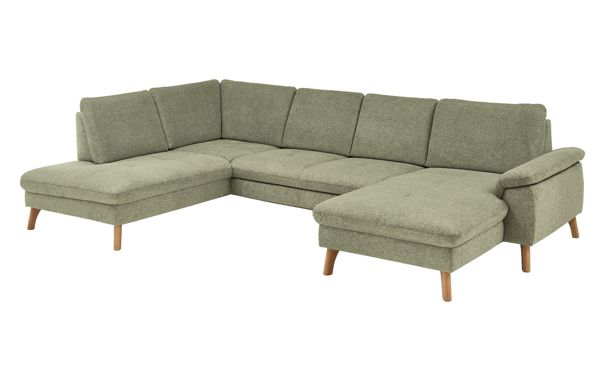 Das rechtsseitig ausgerichtete Sofa verfügt inklusive Rücken über einen Stoffbezug im Farbton Lind. Ca. 18 cm hohe Füße aus massiver Wildeiche unterstreichen den natürlichen Charakter des ca. 341 x 89 x 220 cm großen Möbelstücks.