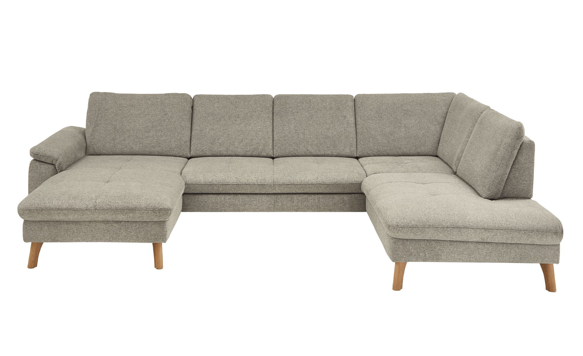 Das linksseitig ausgerichtete Sofa verfügt inklusive Rücken über einen Stoffbezug im Farbton Mandel. Ca. 18 cm hohe Füße aus massiver Wildeiche unterstreichen den natürlichen Charakter des ca. 341 x 89 x 220 cm großen Möbelstücks.