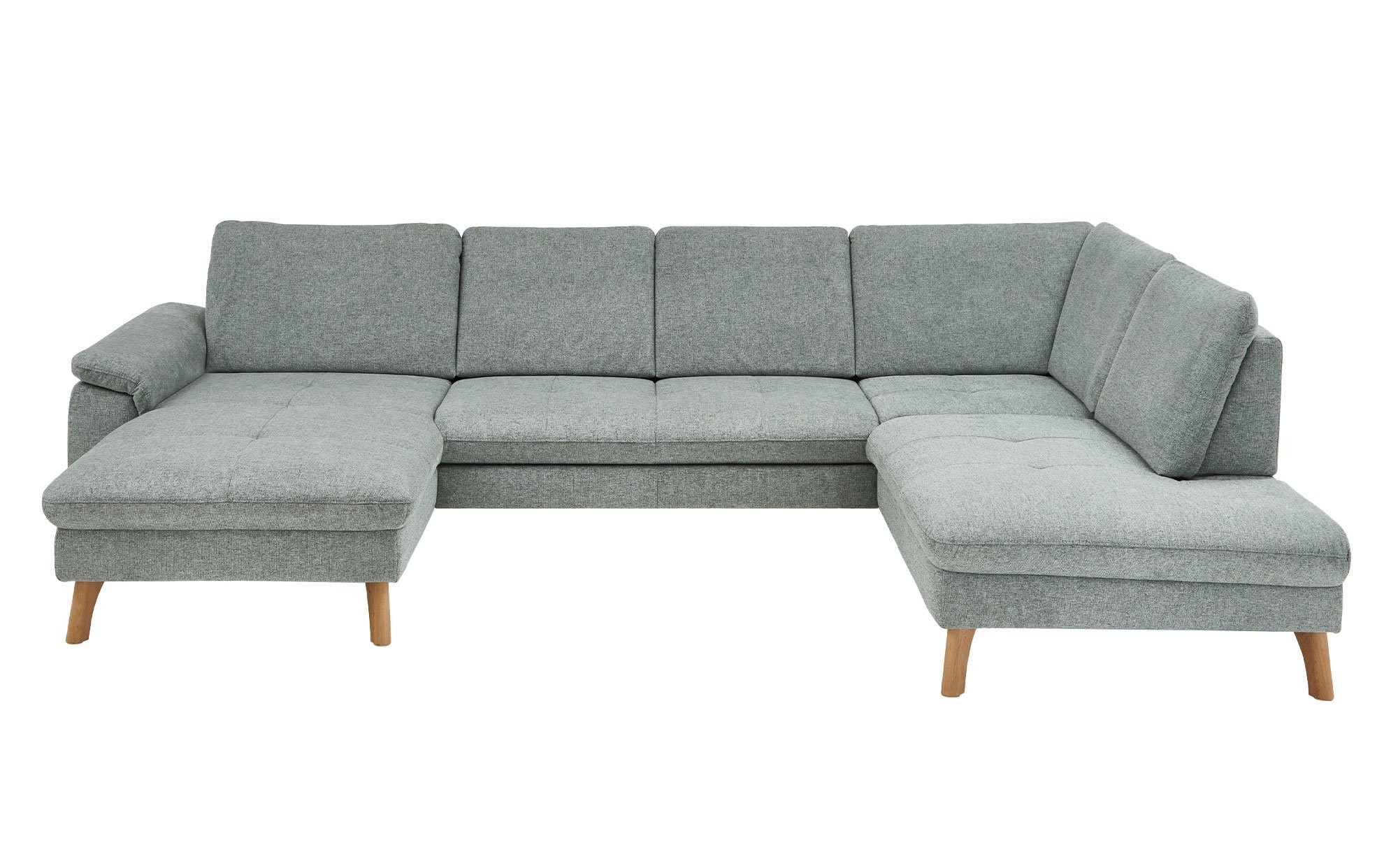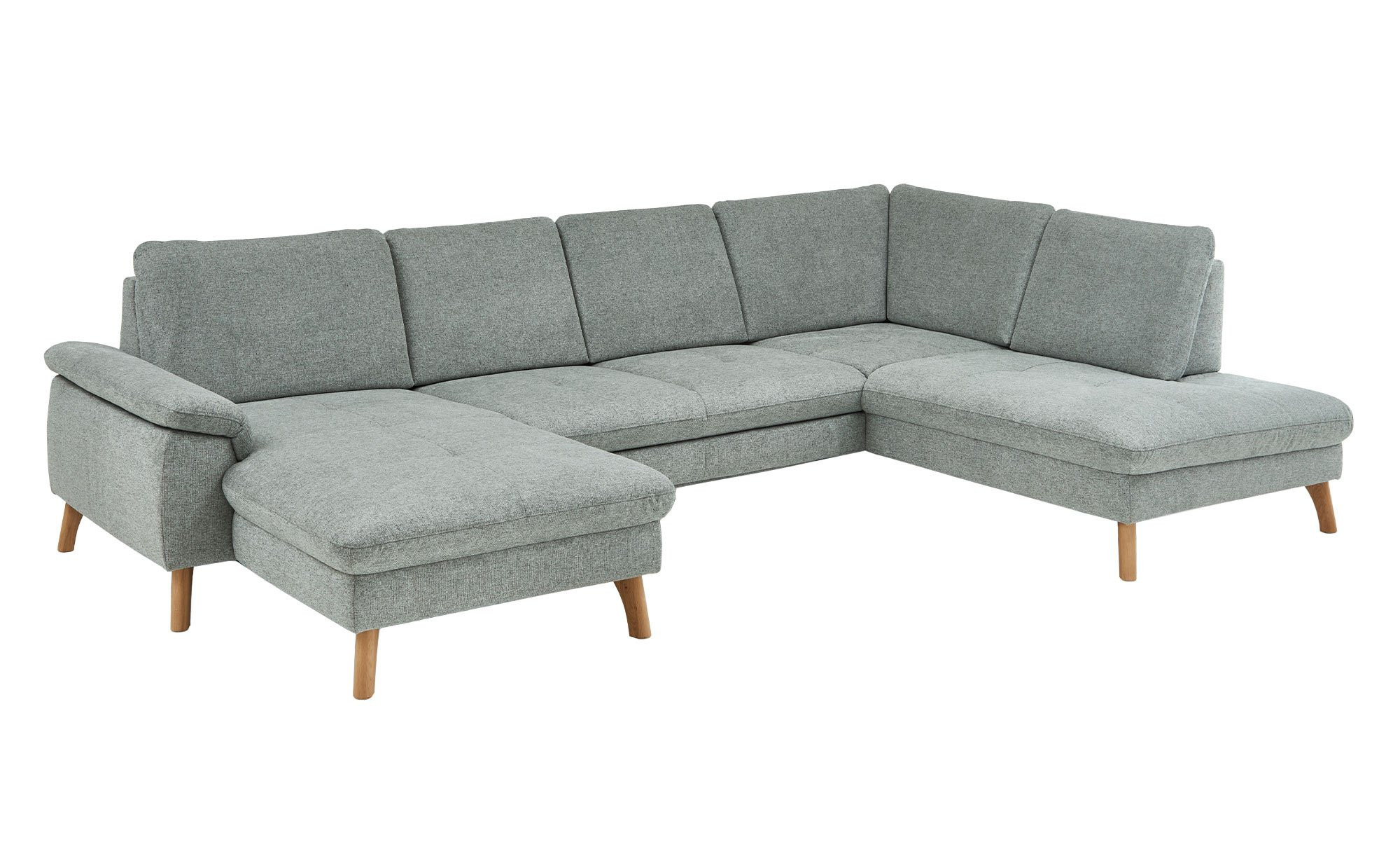 Das linksseitig ausgerichtete Sofa verfügt inklusive Rücken über einen Stoffbezug im Farbton Zinc. Ca. 18 cm hohe Füße aus massiver Wildeiche unterstreichen den natürlichen Charakter des ca. 341 x 89 x 220 cm großen Möbelstücks.
