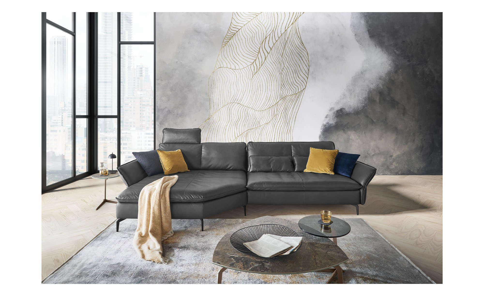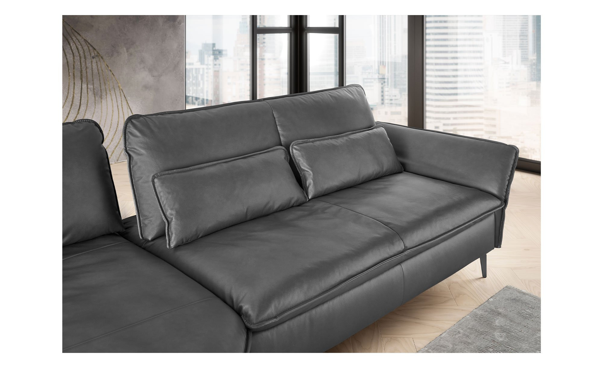 Das ca. 338 x 84 x 160 cm große Sofa ist in anthrazitfarbigem Echtleder bezogen. Dieses schließt auch den Rücken ein. Dezente Biesen zieren zudem die Außenseiten der Polster. Besonders ins Auge springen filigrane, schwarze Metallfüße mit Pulverbeschichtung, die sich harmonisch ins Gesamtbild fügen.