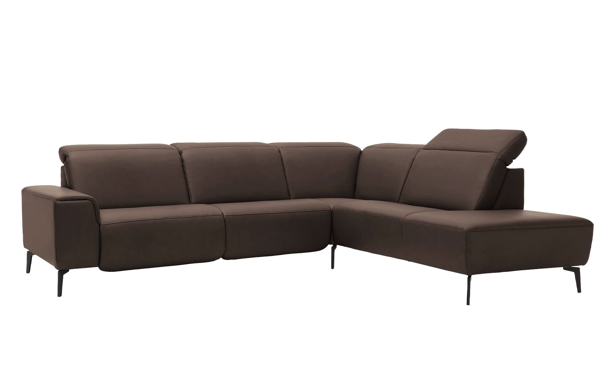 Bezogen ist das rechtsseitig gausgerichtete Möbelstück mit echtem Leder in der Farbe Braun. Schwarze Metallfüße mit einer Höhe von ca. 18 cm setzen zusätzlich einen eleganten Akzent.