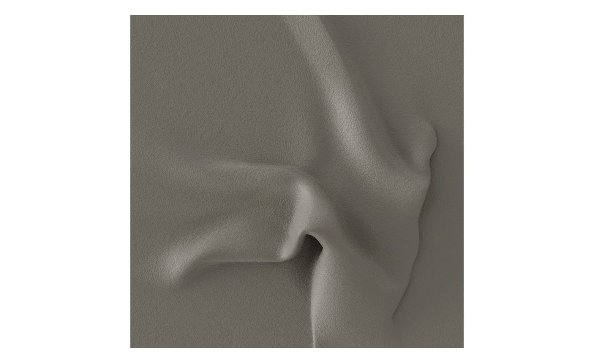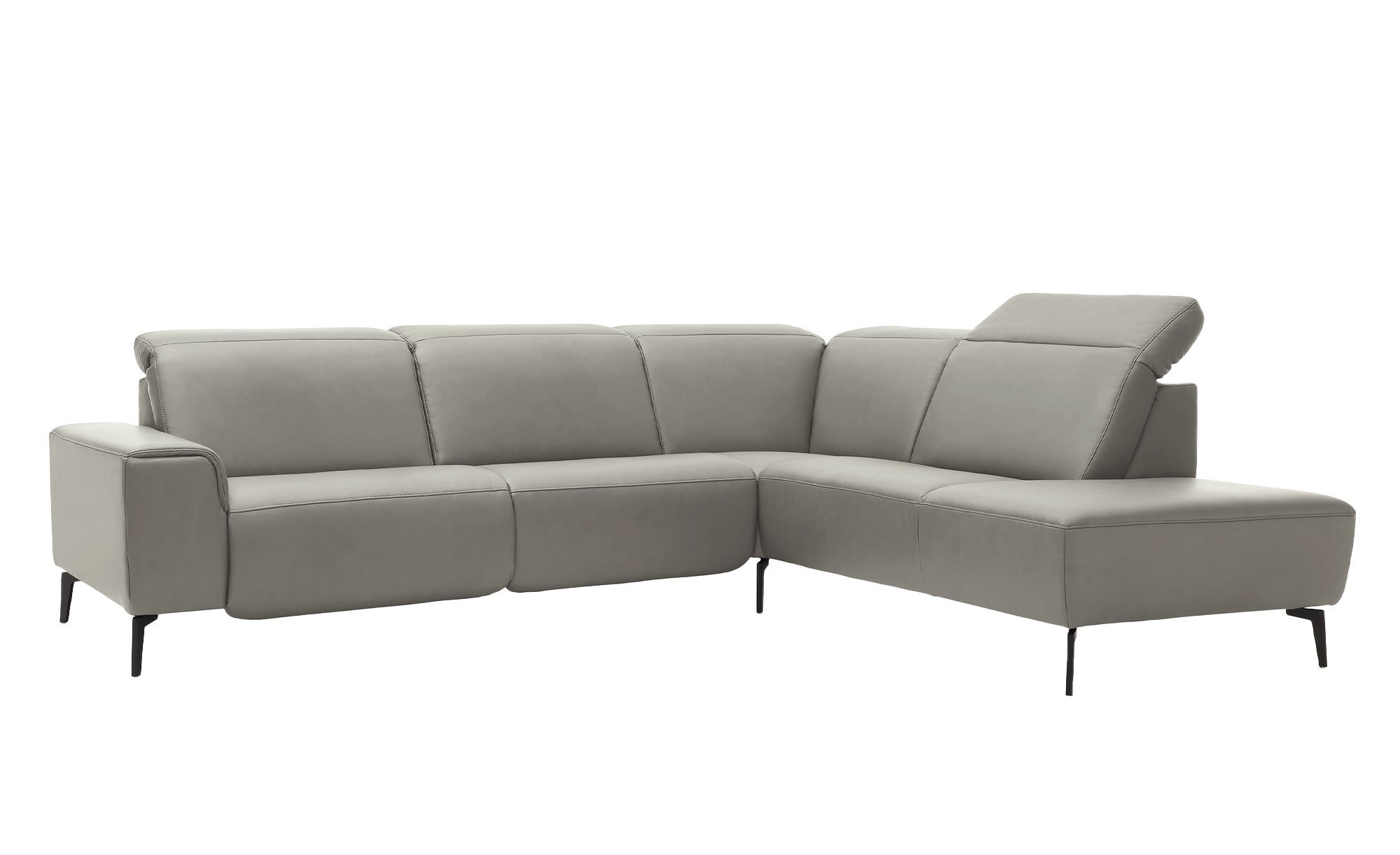 Bezogen ist das rechtsseitig ausgerichtete Möbelstück mit echtem Leder in der Farbe Grau. Schwarze Metallfüße mit einer Höhe von ca. 18 cm setzen zusätzlich einen eleganten Akzent.