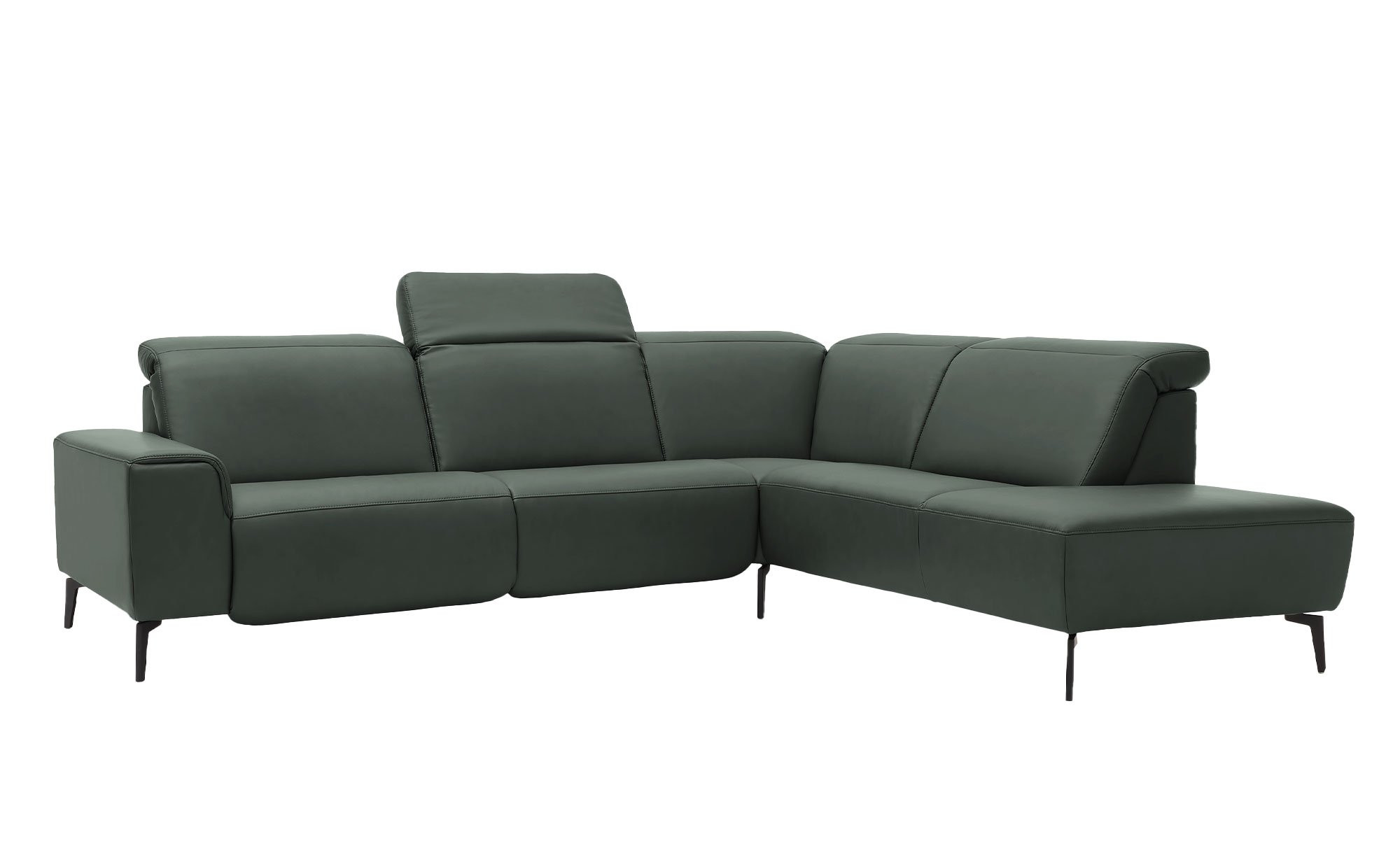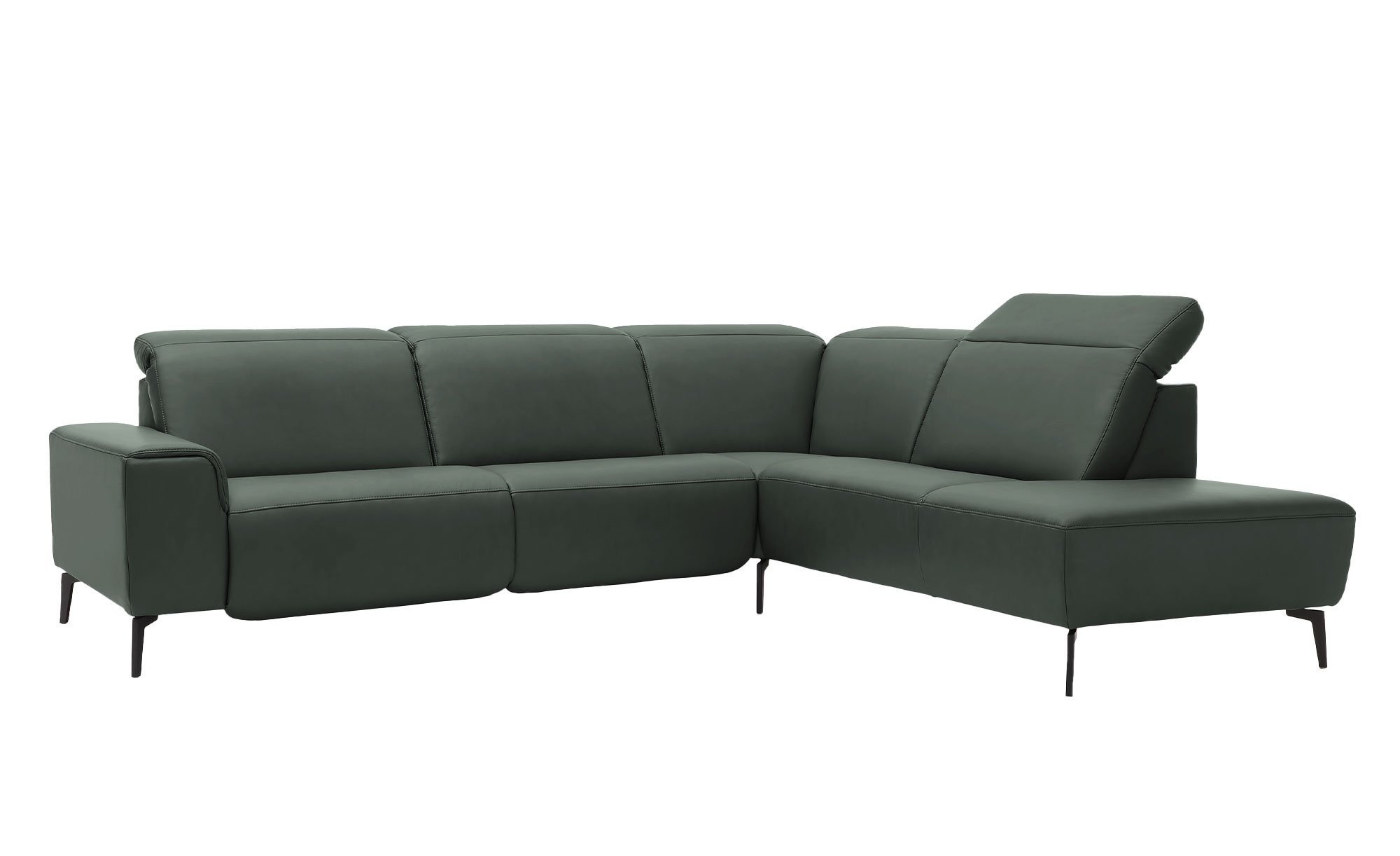 Bezogen ist das rechtsseitig ausgerichtete Möbelstück mit echtem Leder in der Farbe Oliv. Schwarze Metallfüße mit einer Höhe von ca. 18 cm setzen zusätzlich einen eleganten Akzent.